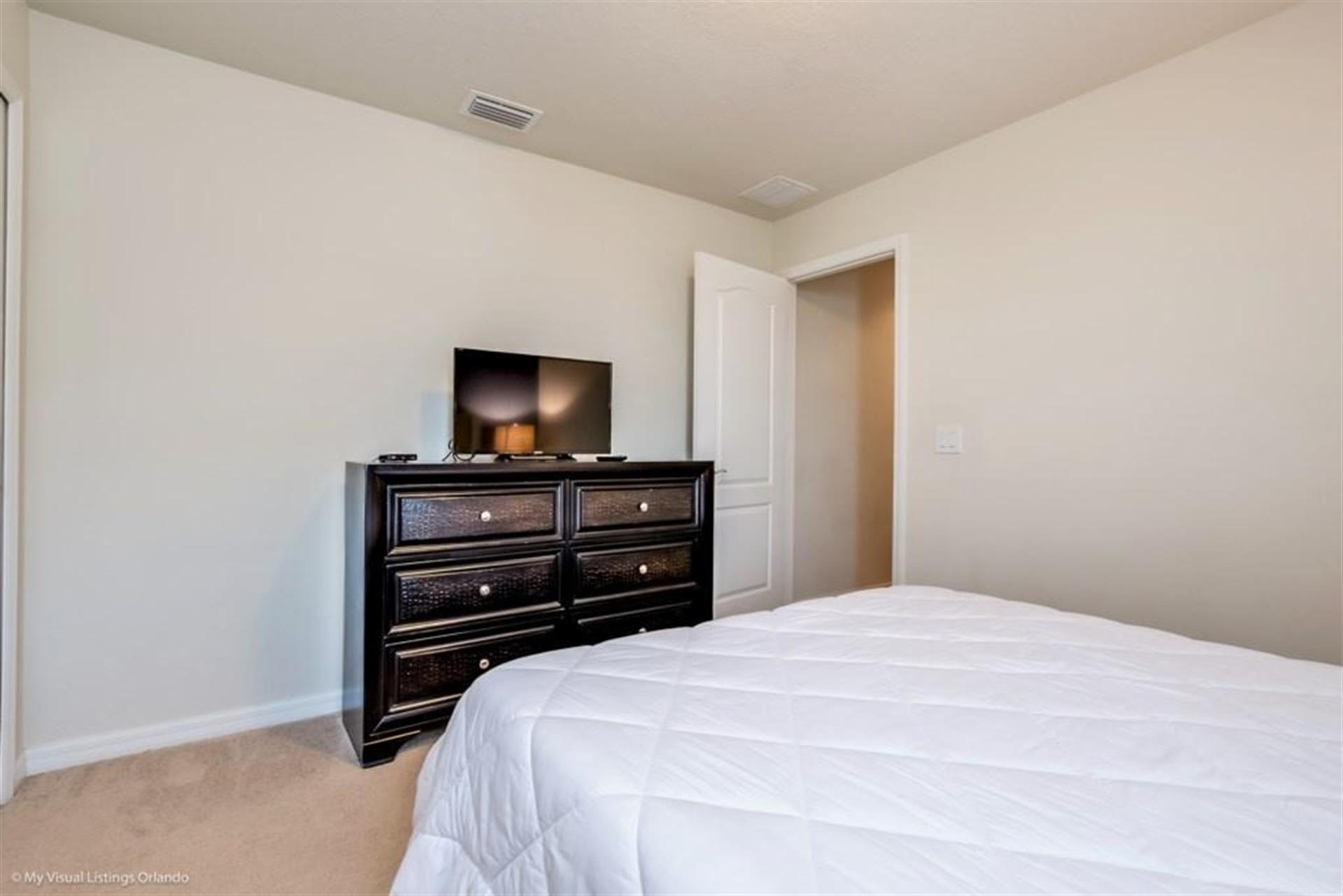 Bedroom #6 Queen with tv, dresser, built in closet, nightstands and lamps.