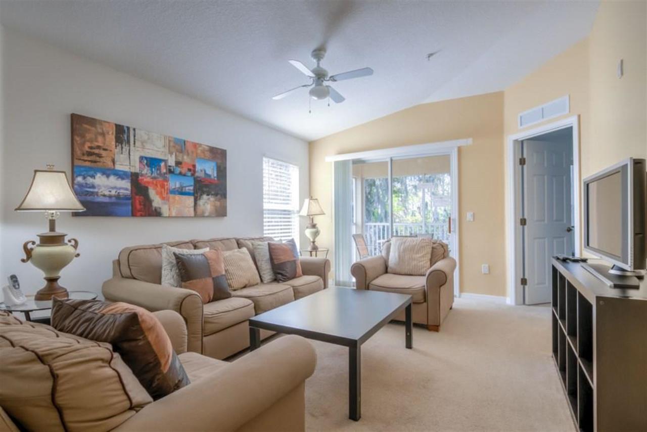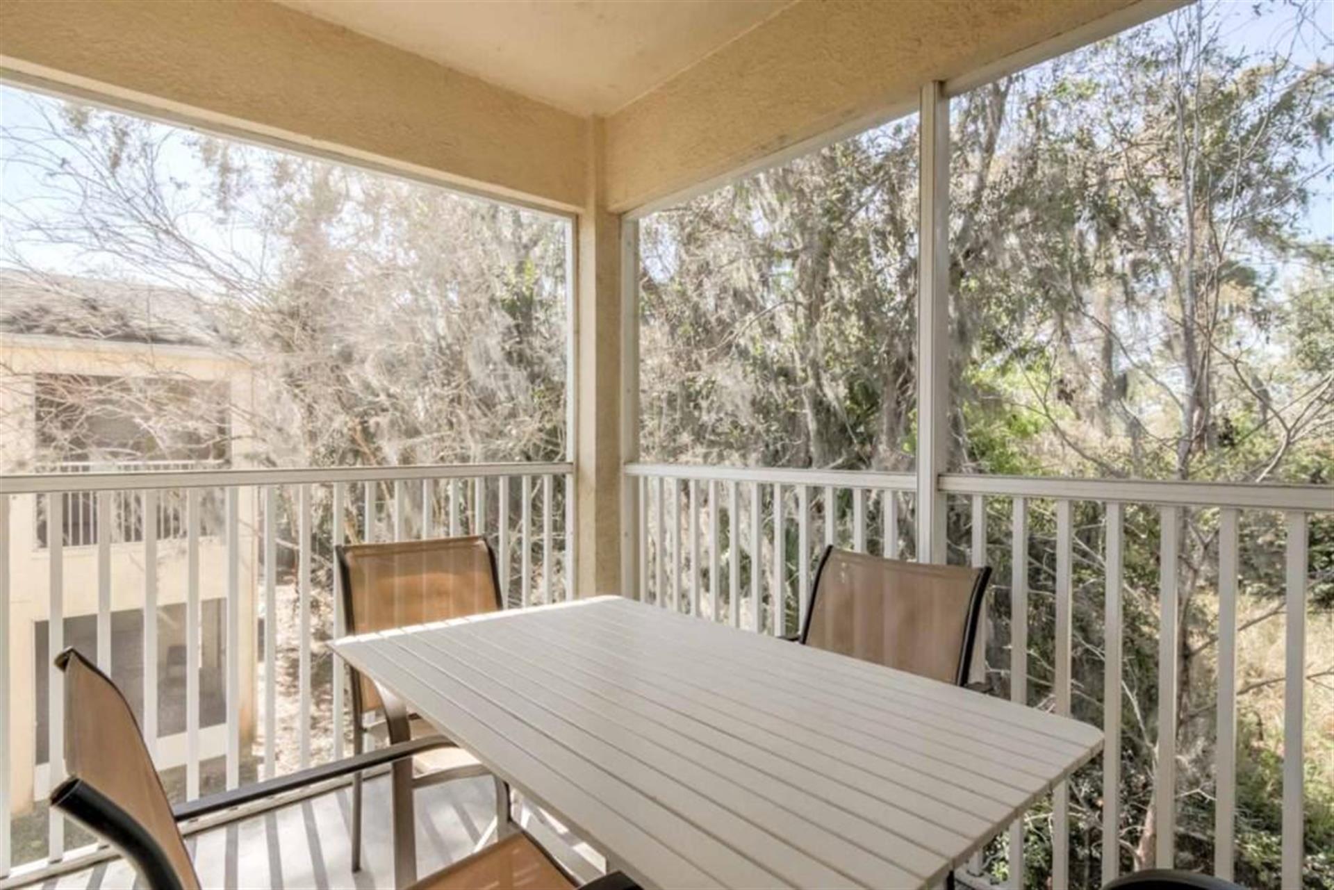 Want to be close to all the major attractions? Look no further. This 3-bedroom, 2-bathroom condo located at Club Cortile sleeps up to 6 guests comfortably. The dining area is a great open space that gets plenty of sunlight. With a great view of the outdoors, this dining area makes for a calm place to enjoy a meal. The modern dining room table and chairs can accommodate all 6 guests. The living area has two sofas, modern artwork and a flat screen TV for added entertainment. Guests can use this area to kick back and unwind or to relax just before the start of a long day. A large sliding door leads from the living area onto a balcony with a wonderful view of the conservation area that unfolds in front of the resort. The balcony also includes a set of table and chairs for enjoying a meal or for watching the sunsets. The first bedroom is the master bedroom and has a king-sized bed along with an en-suite bathroom. Here, you’ll find a walk-in shower, bath, toilet, and vanity. Bedroom two has a queen-size bed. And bedroom three has two single/twin beds.