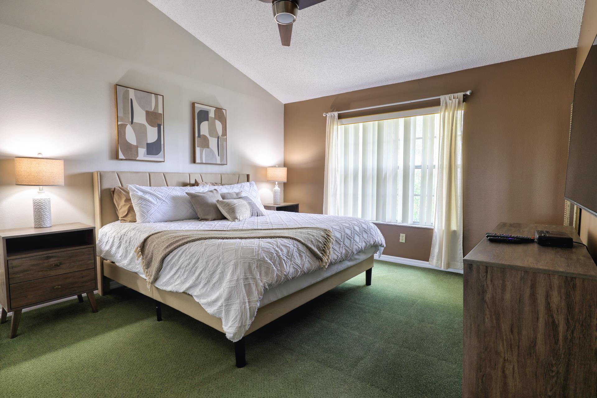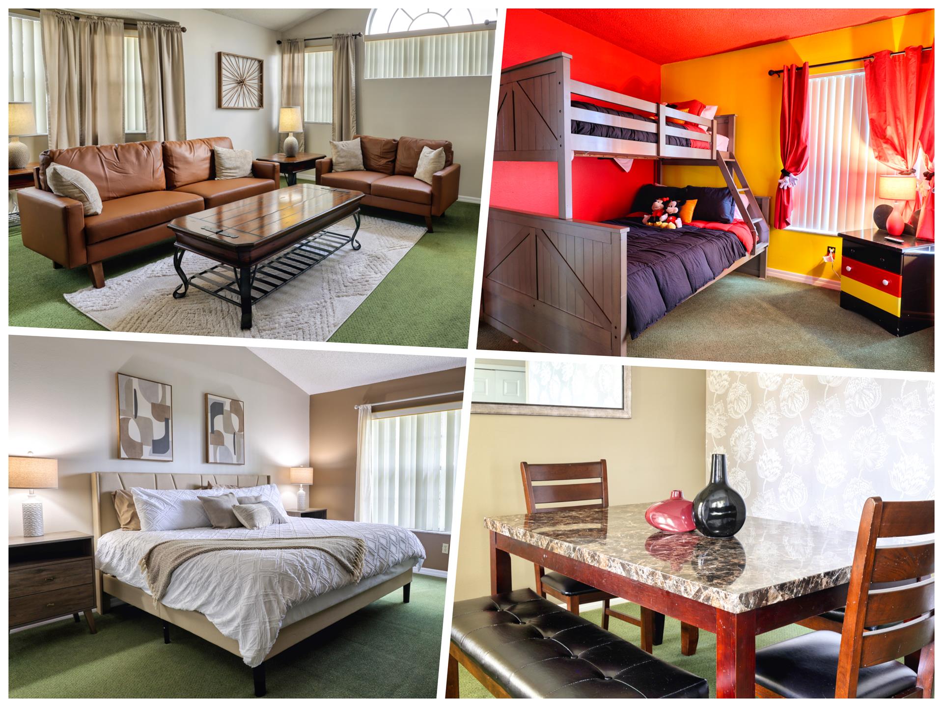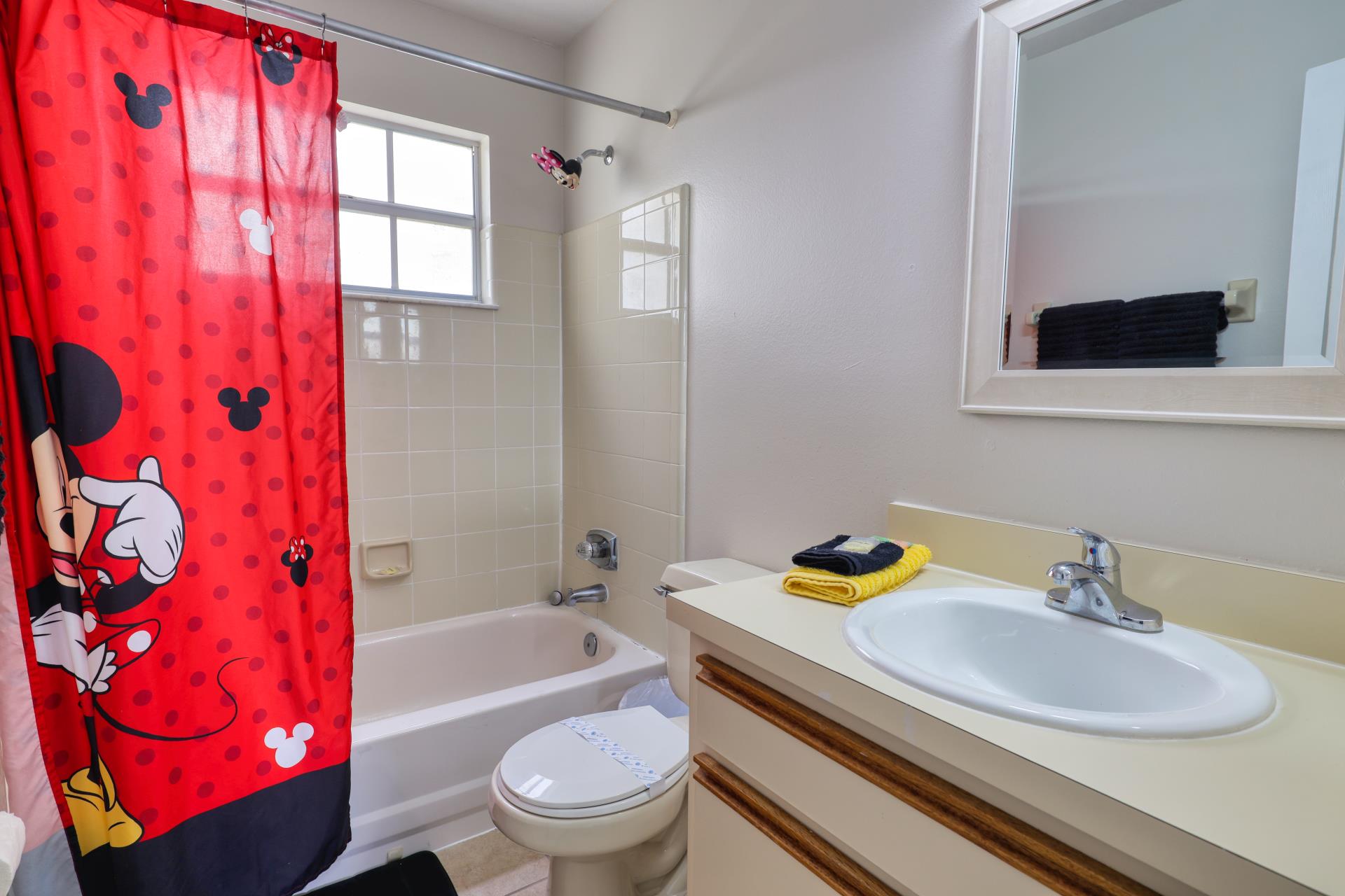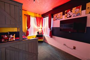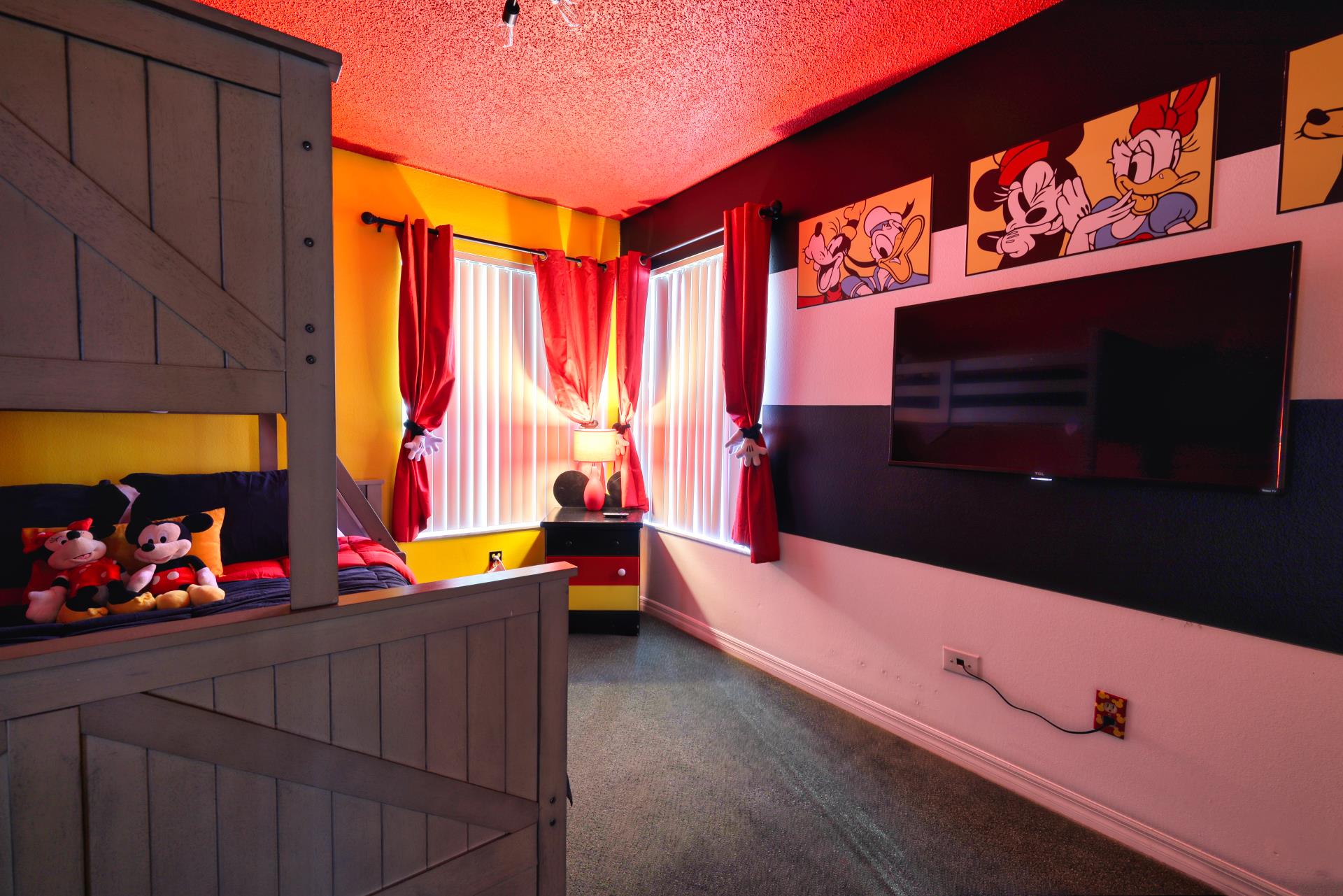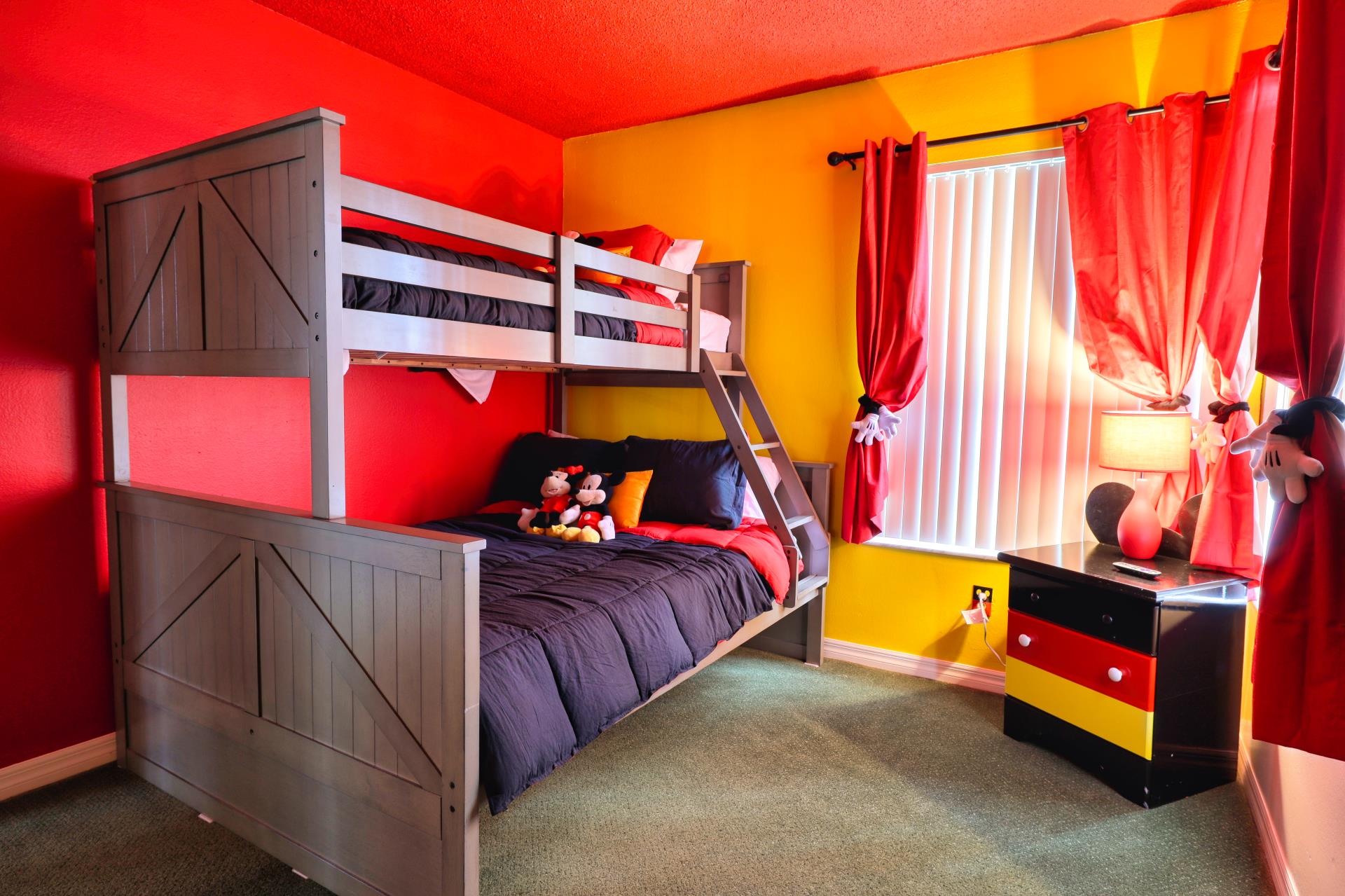 Located in on the 2nd floor at Laguna Bay, this 2-bedroom, 2-bathoom vacation condo is the perfect getaway space for small families or a couple. The living room is large and spacious. It has plenty of natural light thanks to the numerous windows that let the sunlight pour into the room. The living room has two comfortable sofas and a good-sized TV mounted to the wall for watching all your favorite Disney movies on. The galley kitchen overlooks the living room, making it great for entertaining. The kitchen has modern appliances, granite countertops, and all the pots, pans, utensils, and small kitchen appliances that you would need to put together tasty home-cooked meals. And when it's time to eat, you can do so at either the breakfast bar, which seats two, or at the dining table, which seats about six people. There are two bedrooms. The first bedroom has a king-sized bed. It also has its own ensuite bathroom complete with walk-in shower. The second bedroom is themed to Mickey Mouse and has a single-over-single bunkbed (2 twin/single beds).