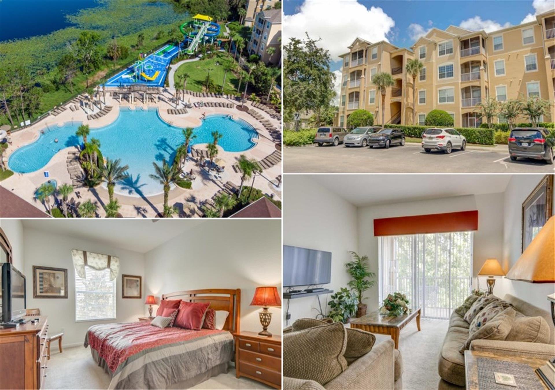This condo is located on the 3rd-floor (the building has an elevator), and it has 3 bedrooms and 2 bathrooms. The living room has comfortable sofas, access to a balcony through glass patio doors, and a large flat screen TV, which is perfect for watching all your favorite Disney movies on. The kitchen is galley-style, and it comes fully equipped with all the pots, pans, utensils, plates, and small kitchen appliances/kitchen gadgets that you would need to put together your favorite home-cooked meals. When it’s time to eat, there’s a cozy dining area that will seat up to 4 people. The balcony is screened-in to keep those pesky Florida bugs out, and a couple of chairs to relax on.