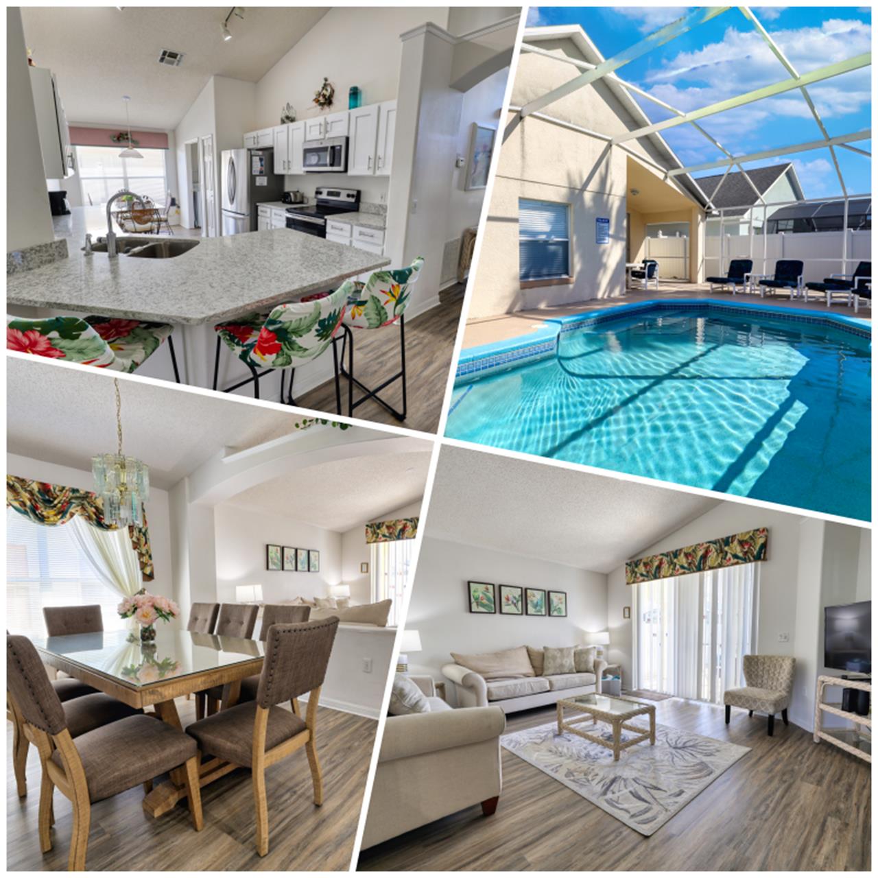 This vacation home is located in the Eagle Pointe community, and it has four bedrooms and two bathrooms. There are vaulted ceilings throughout the house, which makes the 1,822 square feet of space feel even larger. The living room is large and bright, and there is plenty of comfortable seating, so everyone can sit down together and watch a classic Disney movie. The kitchen has been updated with stainless steel appliances, and it comes fully equipped with all the utensils, plates, dishes, and kitchen gadgets/small appliances you’d need to cook up a tasty home-cooked meal. And when it’s time to eat, there are two dining areas. The first dining area is in the kitchen, which will seat up to four people. The second dining area is more formal and has seating for up to six people.