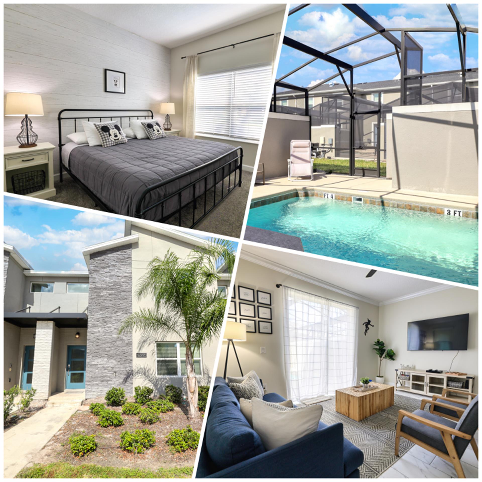 Located in Storey Lake Resort, this luxurious 4-bedroom, 3-bathroom townhome is just 5 miles from Disney World! The living room, dining room, and kitchen areas all share the same area, making it great for entertaining. The living room has a comfortable sofa, two armchairs, a large flat screen TV mounted to the wall, and large patio doors that lead to the pool area and let tons of natural light pour into the room. Enjoy cooking? If so, you'll love this kitchen. It has stone countertops, dark stainless-steel appliances, and all the pots, pans, utensils, and small kitchen appliances that you'd need to put together tasty home-cooked meals. When it's time to eat, you can do so at either the breakfast bar, which seats up to five people, or around the dining table, which seats up to eight people. Want somewhere to cool off after a long day out at the parks? No problem! Head to the back of the property, and you'll find your very own private splash pool! The pool area has privacy walls around it to keep the neighbors'' eyes out, and there is also an outdoor dining area under the lanai. There are four bedrooms. The first bedroom, is Disney themed, and it has a king-size bed and ensuite bathroom. The second bedroom has a queen-sized bed. The third bedroom has a single over double/full bunkbed. And the fourth bedroom is themed to Star Wars and has two bunkbeds (both are single over single). This unit also comes equipped with free Wi-Fi Internet and in-unit laundry facilities.