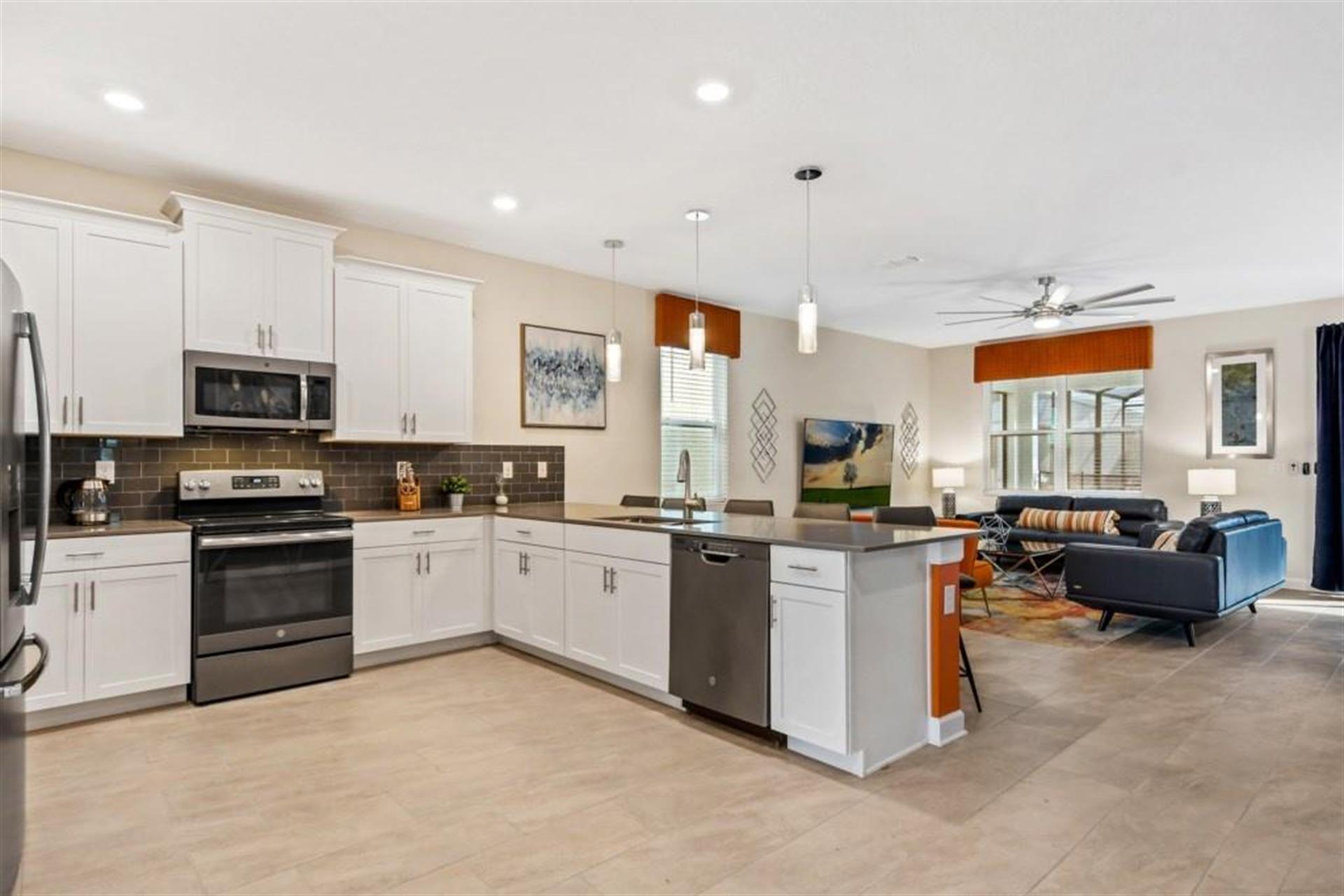range, microwave, dishwasher and granite counters / breakfast bar.