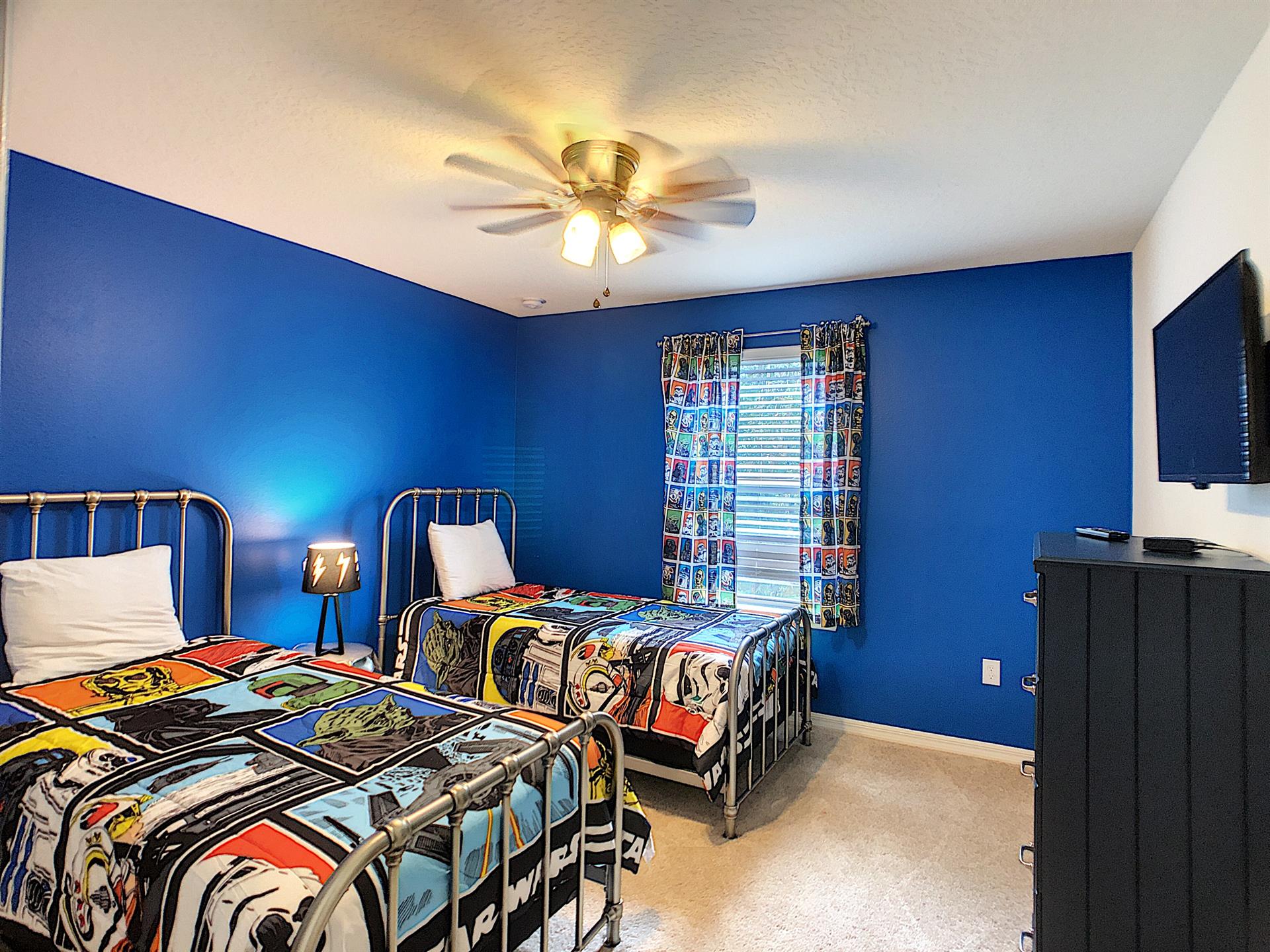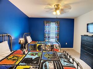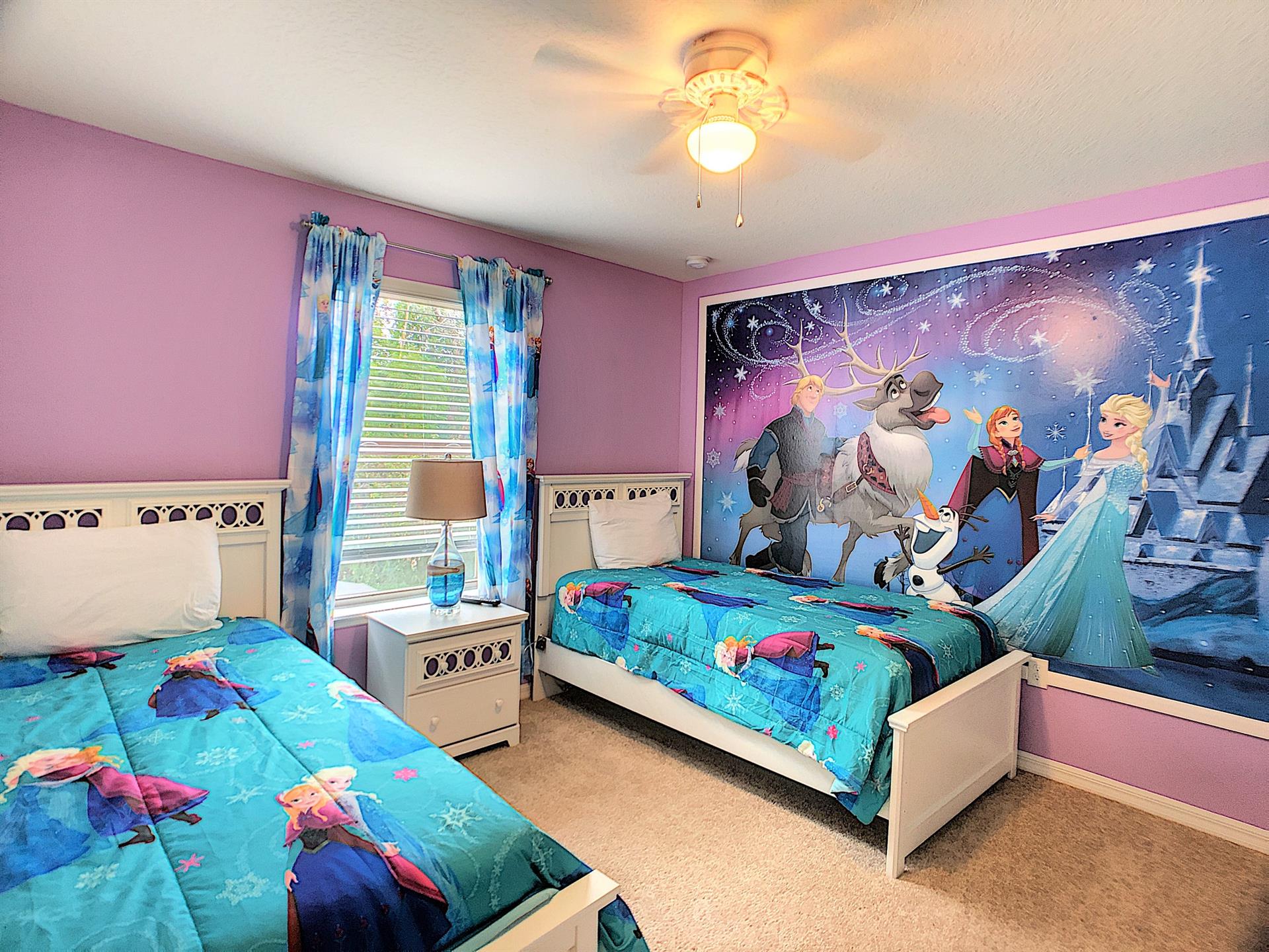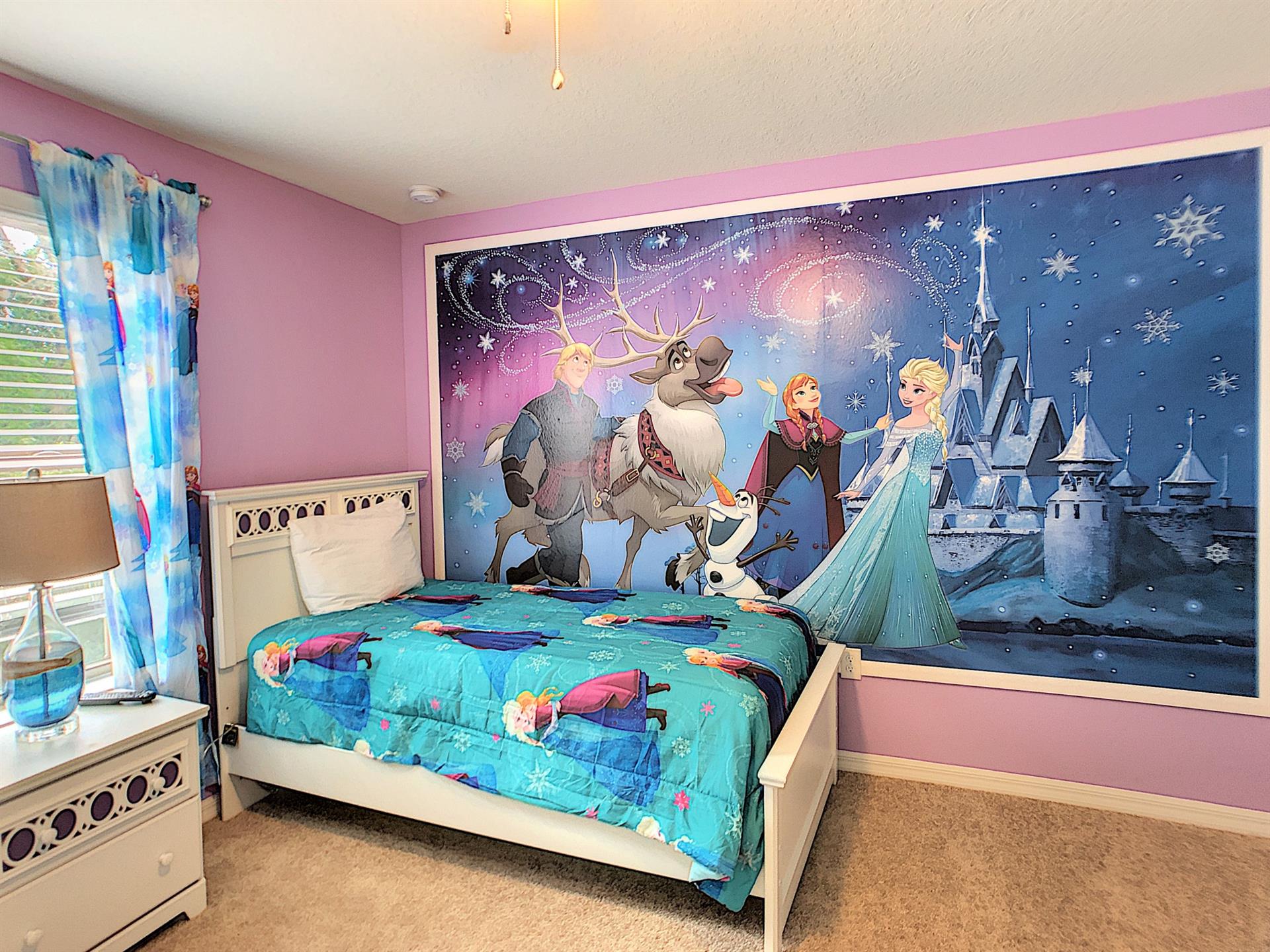 On the first floor you have a master suite with a king bed and and ensuite. There is also a half bath downstairs, next to the washer and dryer. On the second floor you will find the rest of the bedrooms. Room 2 has one Queen bed and ensuite. There is another master bedroom upstairs with a king bed and ensuite. Room 4 has one Queen bed. Room 5 has two twin beds. The Star Wars theme room has two twin beds. The Frozen theme bedrooms has two single beds.