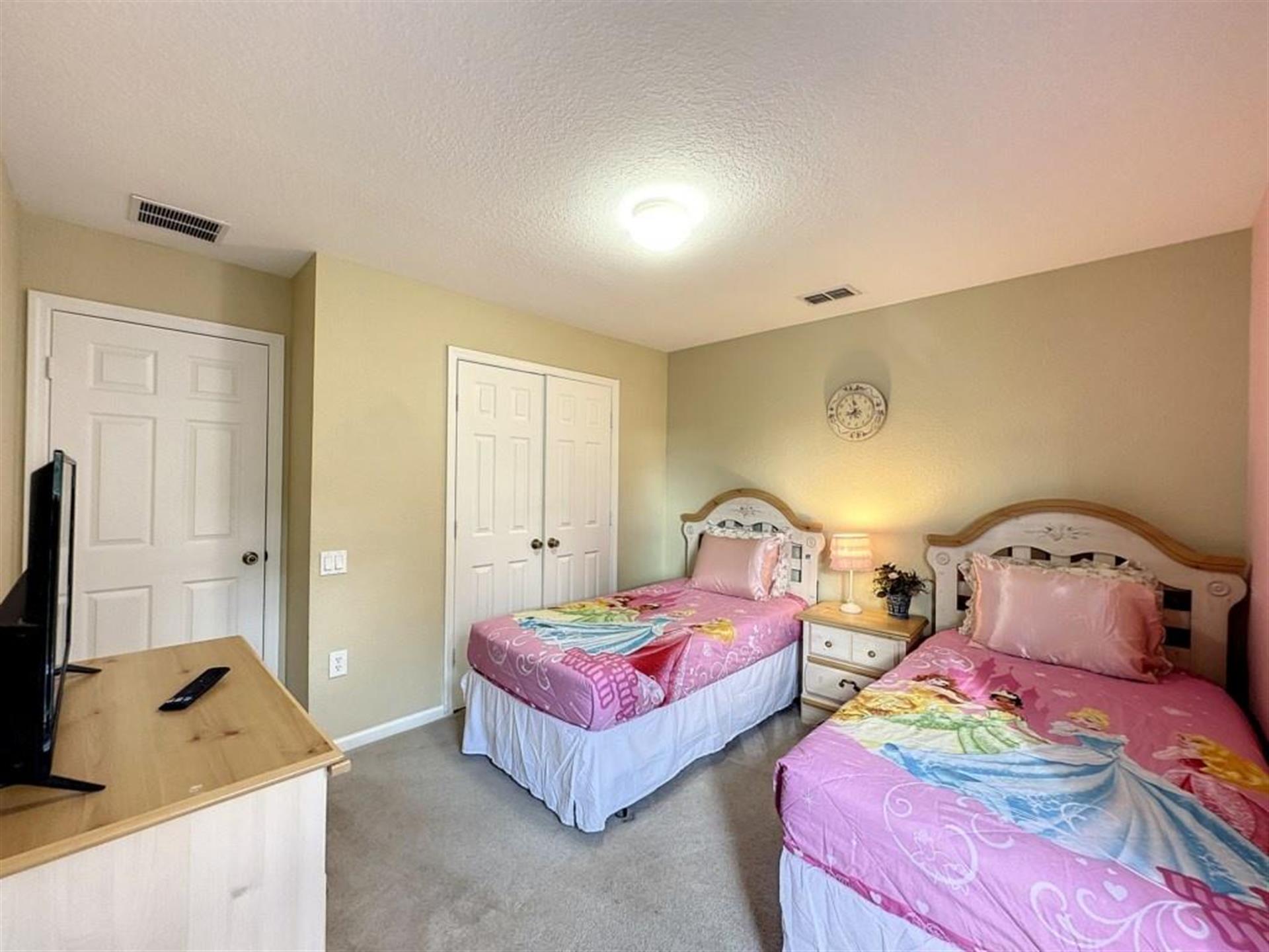 two twin singles and two queen beds, one with fun princess decor and the other