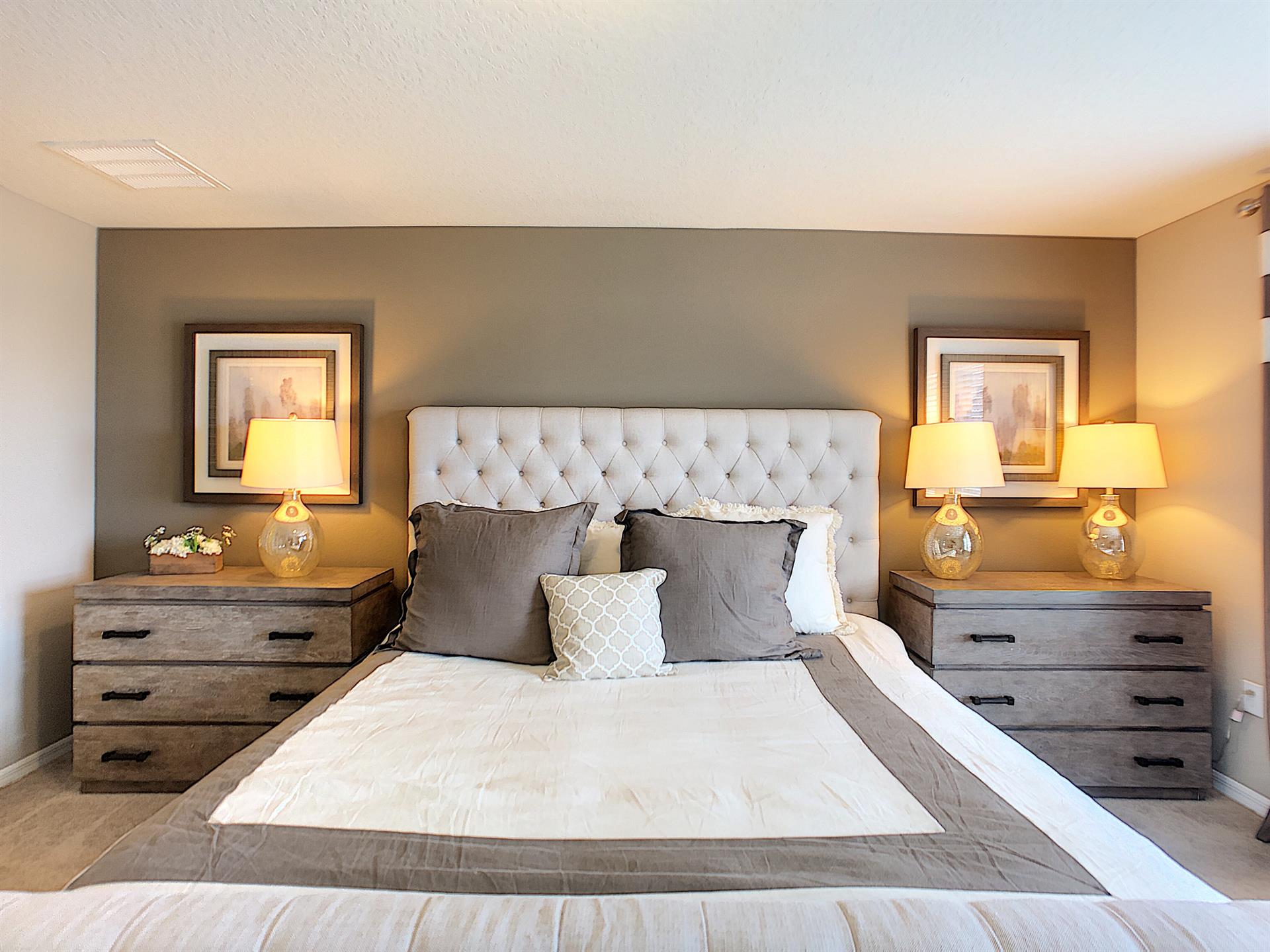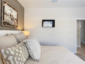 Bedroom Two: Large, king-sized bed with flat screen TV and private ensuite that has a sink, toilet and stand up shower. This room and bathroom is considered to be the largest in the entire home, square footage wise.