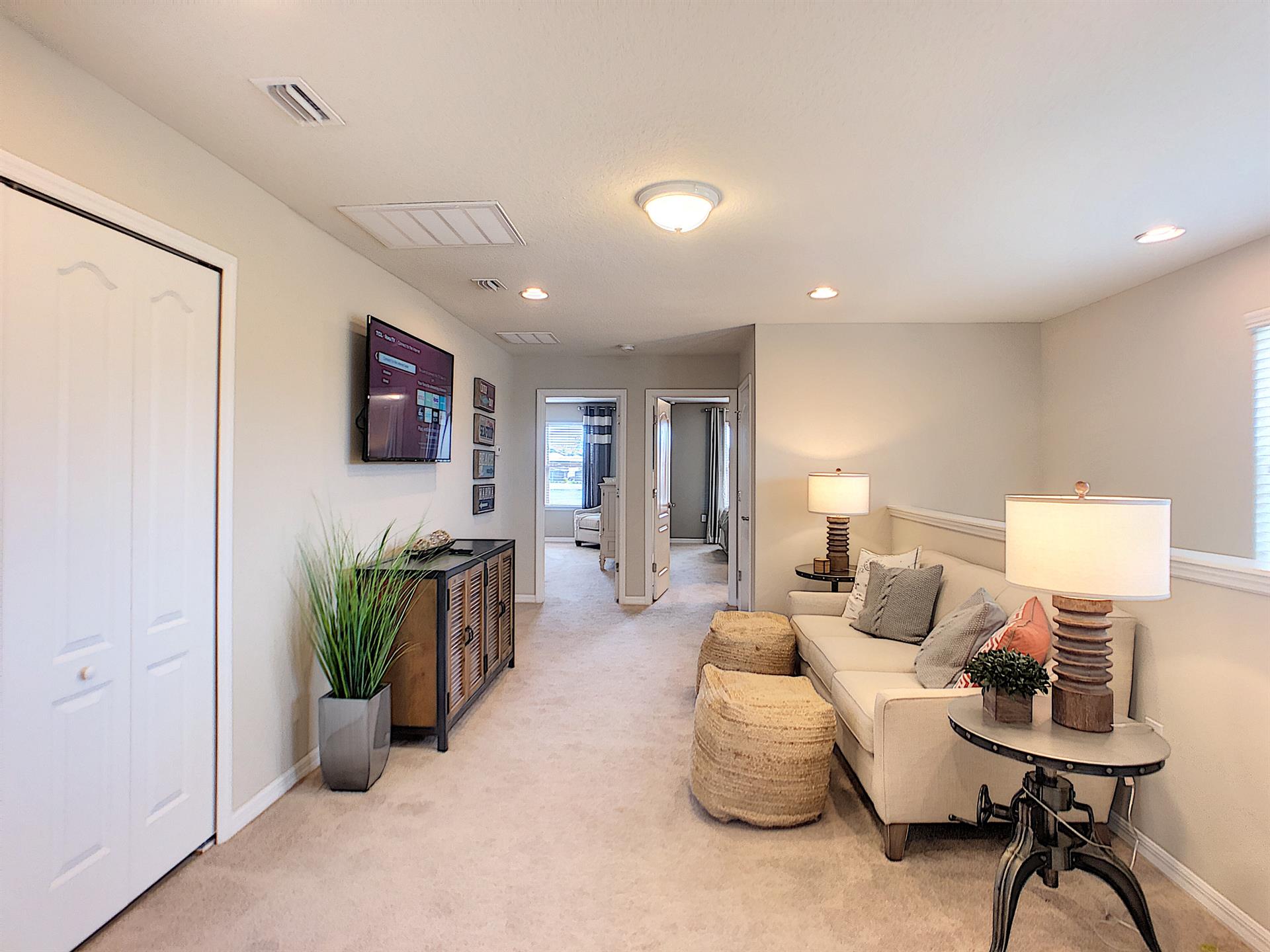 There is an upstairs living room when the family can lounge and enjoy time together. There is enough seating for everyone and has a big flat screen TV.