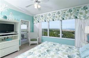 The condo has a king bed in the primary bedroom and two twin beds in the guest bedroom. There is also a sofa sleeper in the den. The unit sleeps 6 comfortably!