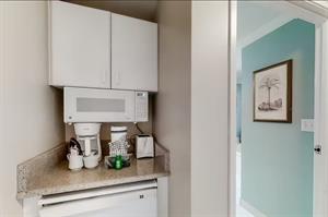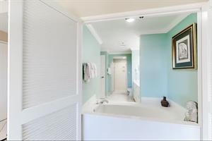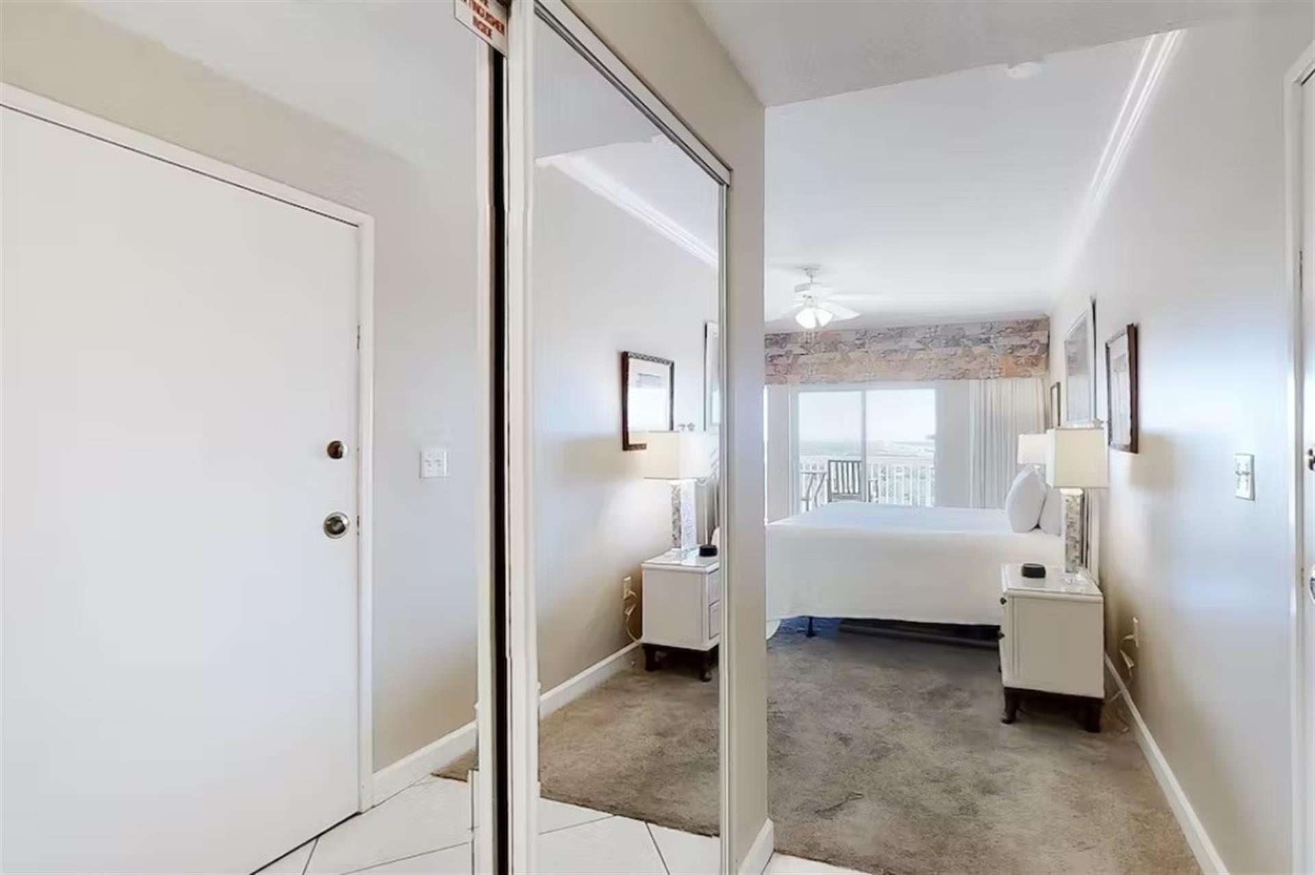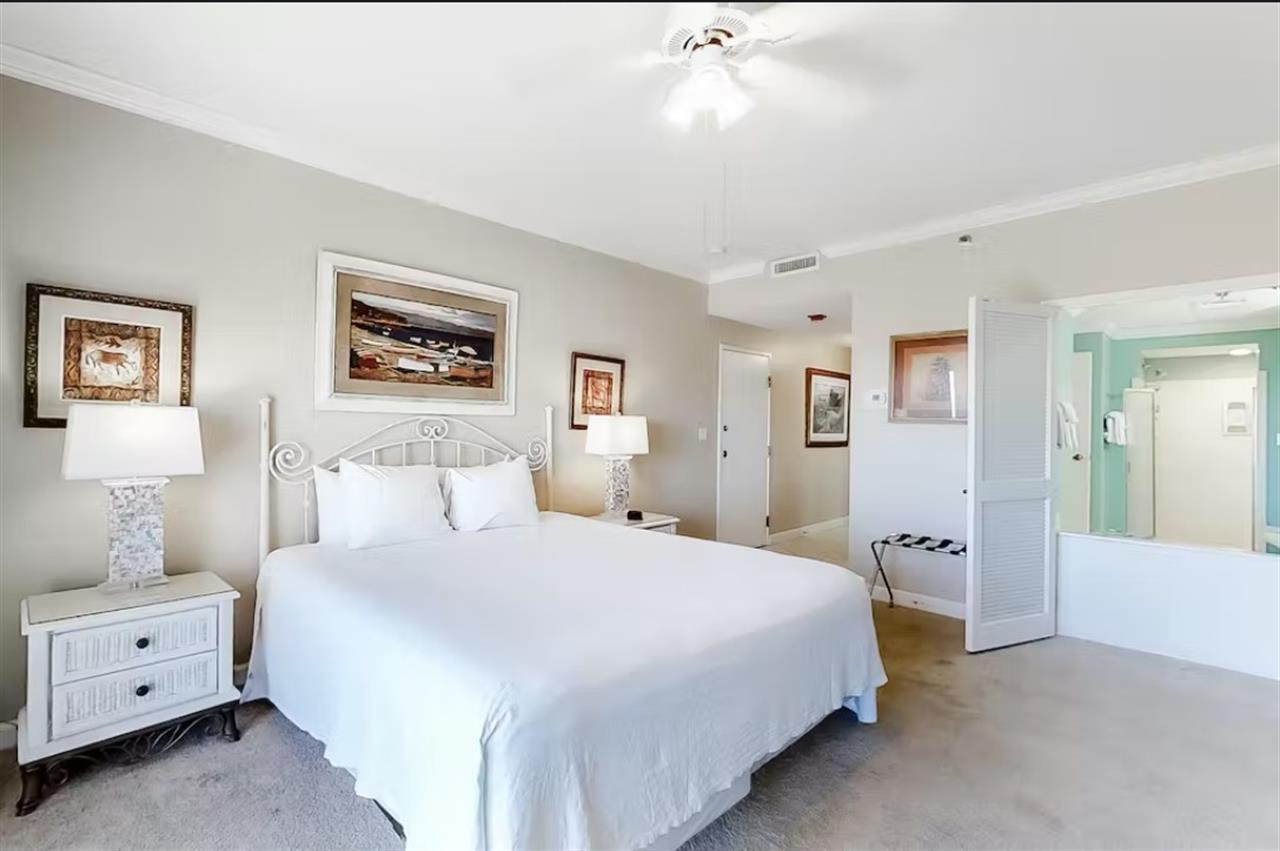This unit is a studio sized unit featuring a master bed and a bathroom with a garden tub. The unit overlooks a beautiful gulf front view and offers a balcony to watch absolutely stunning sunrises with your morning coffee. Can be rented with the two bedroom next door for extra space or simply as a quick getaway for one or two people.