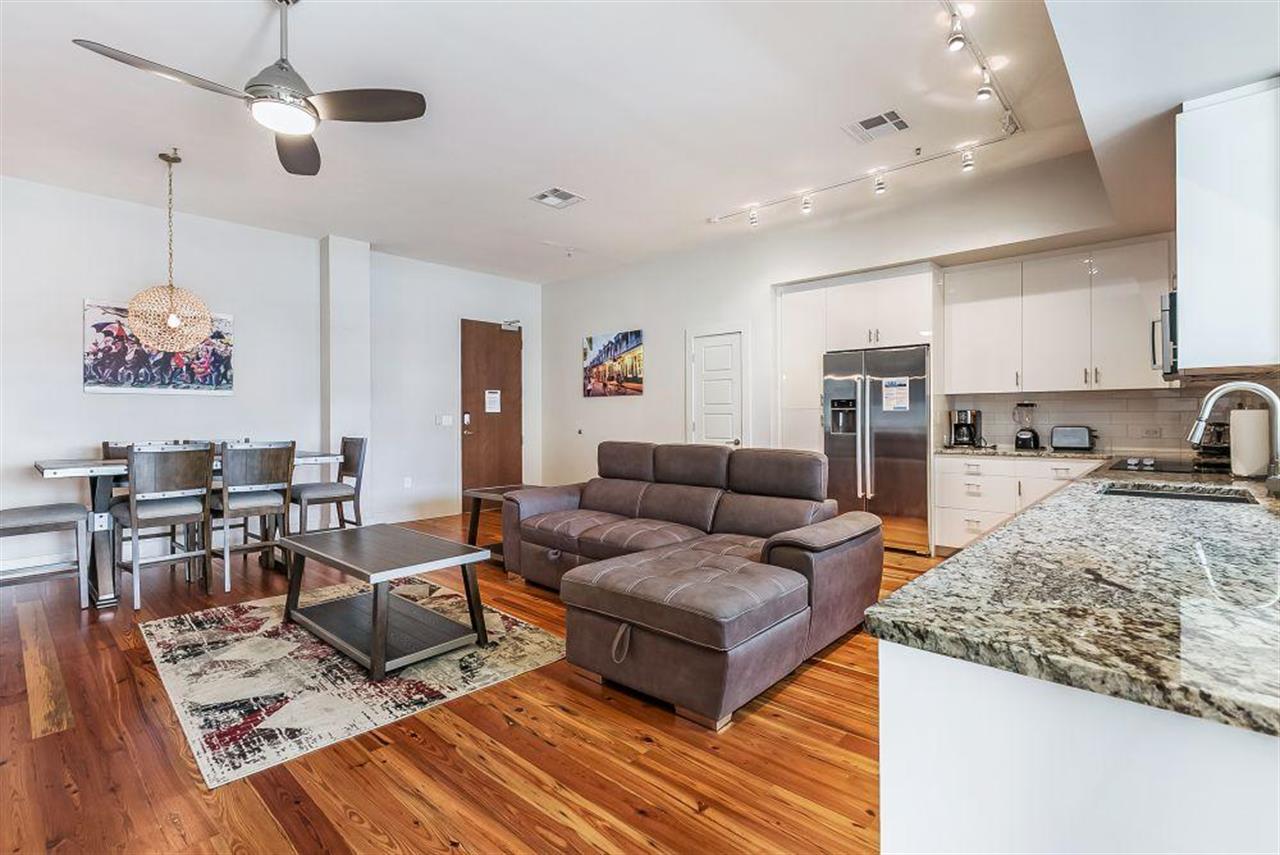 The penthouse features two levels with a living/dining room and a fully functional state of the art kitchen on the first level and bedrooms on the second level. The spacious terrace with NOLA skylines allows for a great small gathering of friends or a sunset watching for 2 on that special date night.