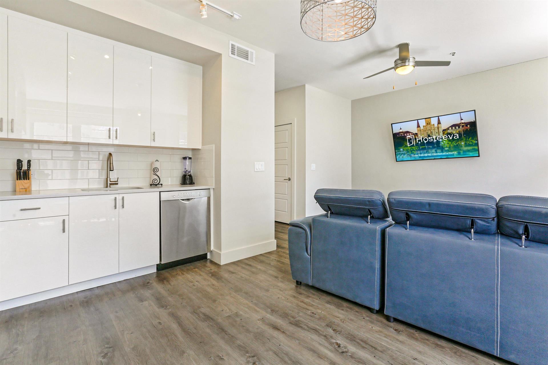 About Only a 5-min walking distance to the city's historic French Quarter, this California Building luxury condo by Hosteeva, fully furnished with custom interiors, modern appliances and handpicked furniture, puts you right in the heart of jazz, food and celebration of life. Everything New Orleans is known for!Famous for its vibrant nightlife and colorful buildings, you'll be steps away from Bourbon Street jazz clubs, Cajun eateries, bars and bistros. And if you prefer to say off the beaten path, quieter streets lead to the French Market, with gourmet food and local crafts. You can't miss taking a stroll down the Jackson Square where street performers put on unforgettable shows right in front of the gorgeous St. Louis Cathedral.