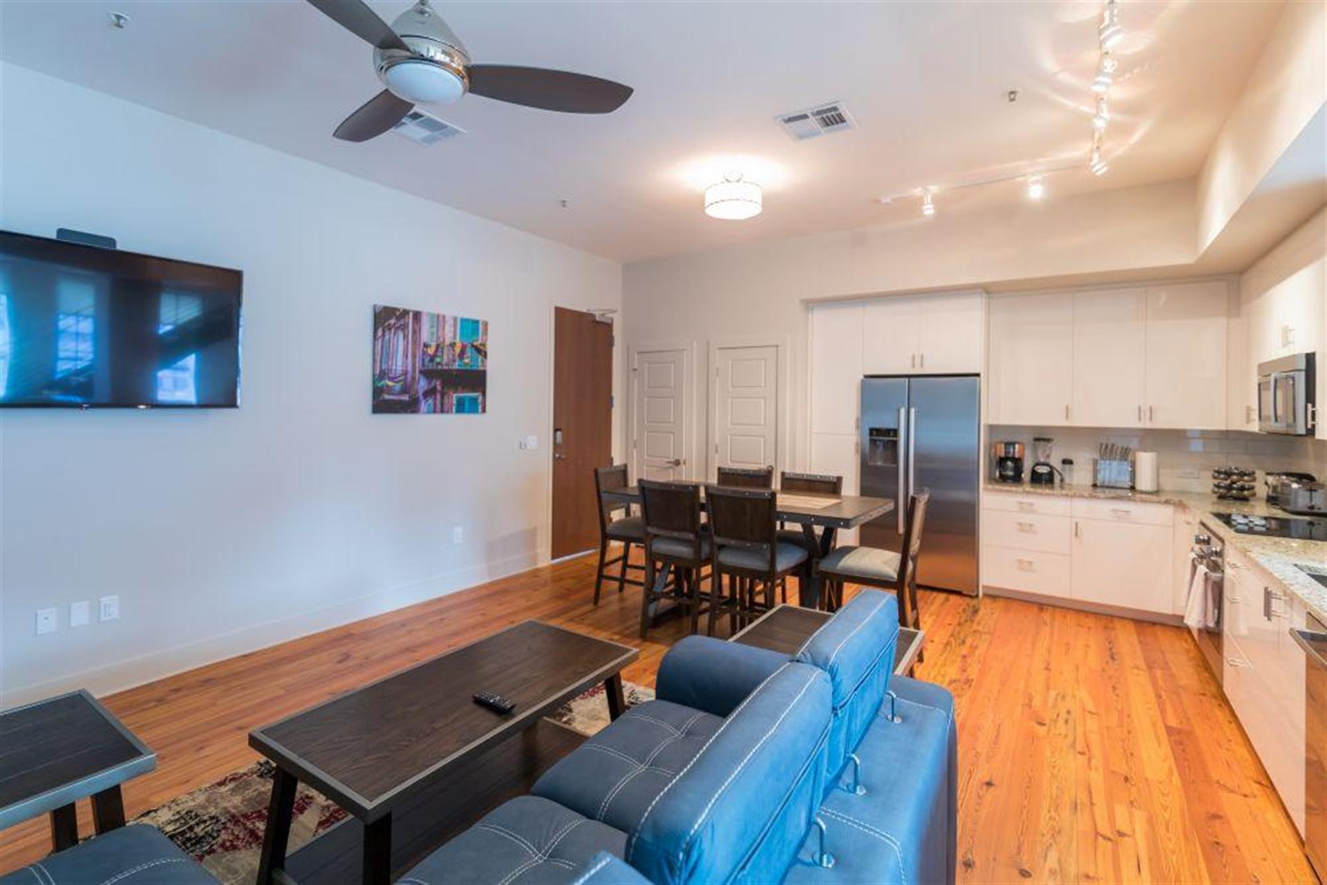The penthouse features two levels with a living/dining room and a fully functional state of the art kitchen on the first level and bedrooms on the second level. The spacious terrace with NOLA skylines allows for a great small gathering of friends or a sunset watching for 2 on that special date night.