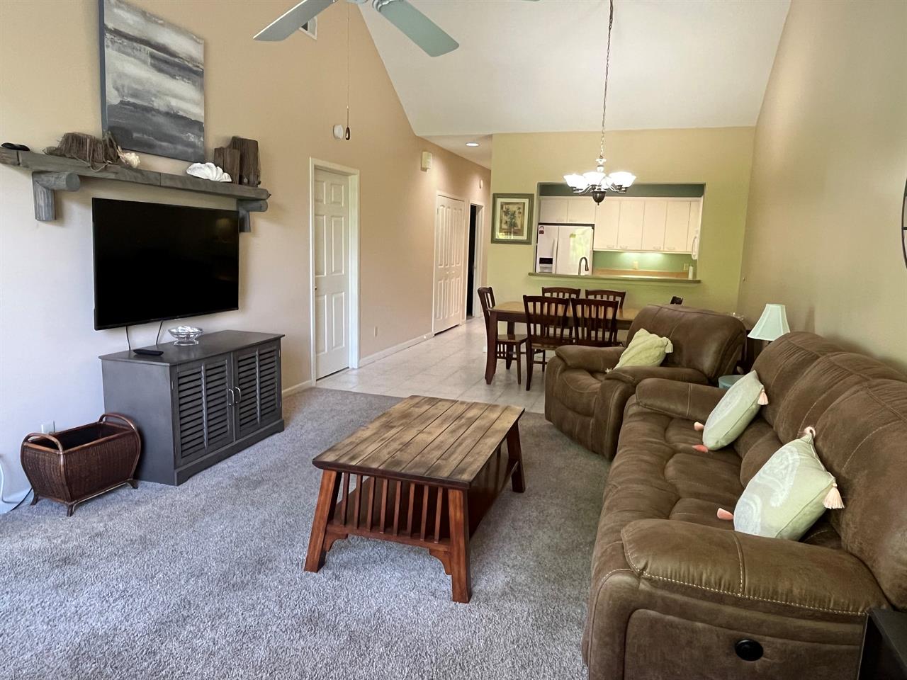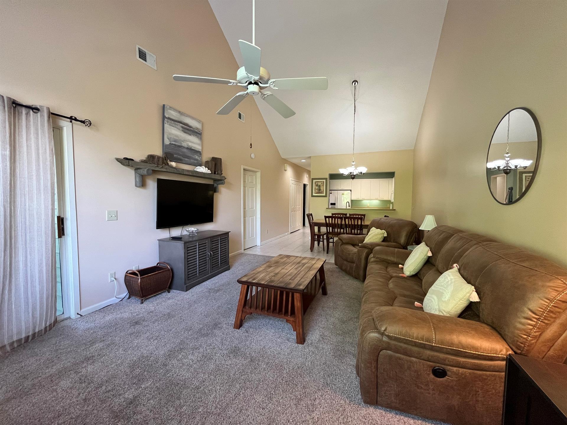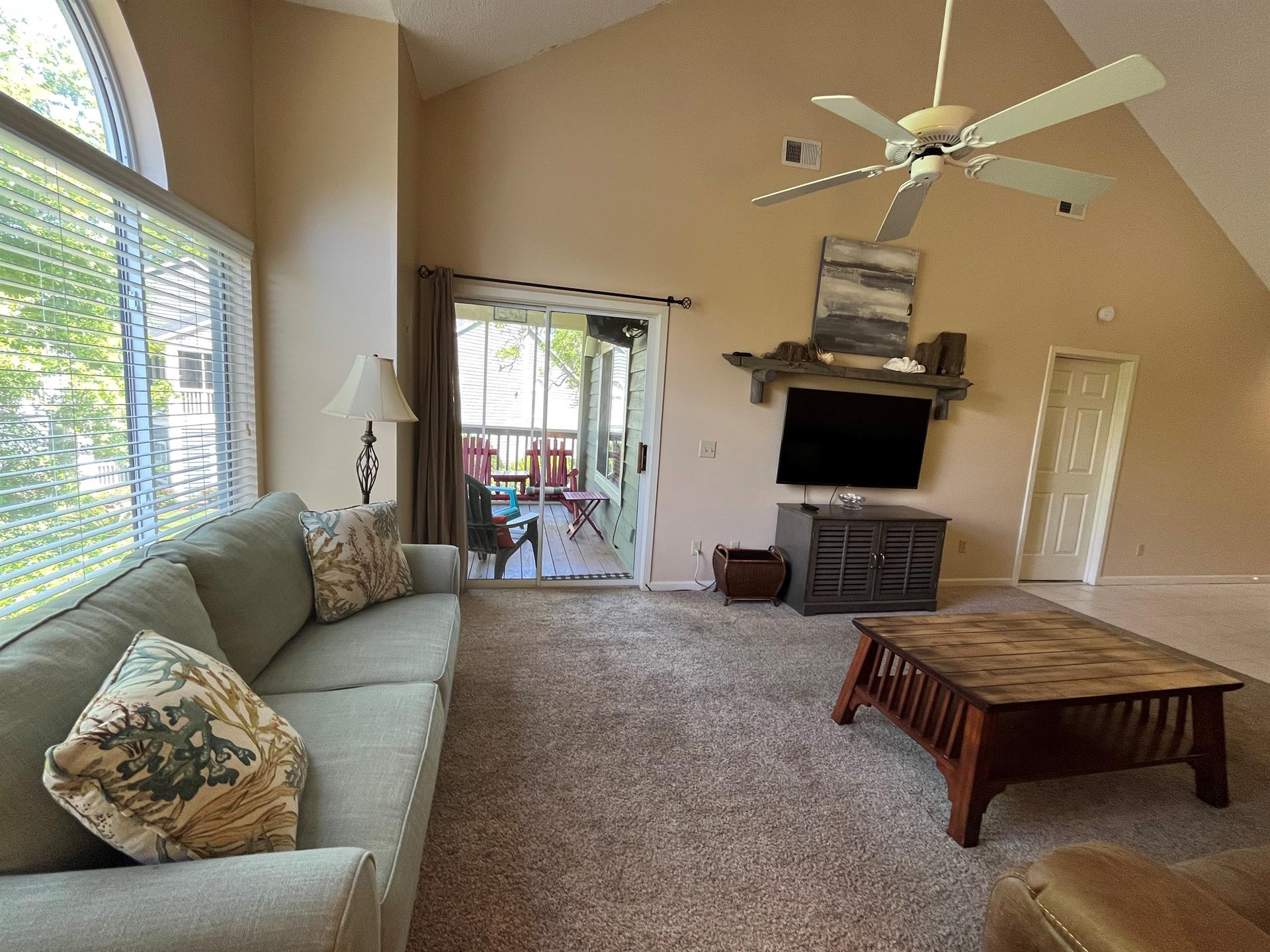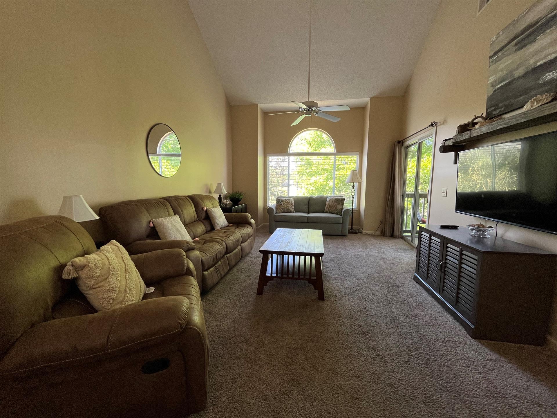 The living room in this vacation rental will provide guests a space to relax after a long blissful day soaking in the Myrtle Beach waves. There is a flat-screen television with cable and a sleeper sofa available in the living area. Enjoy a morning cup of coffee outside overlooking the Kingston Plantation lush greenery on your private patio.