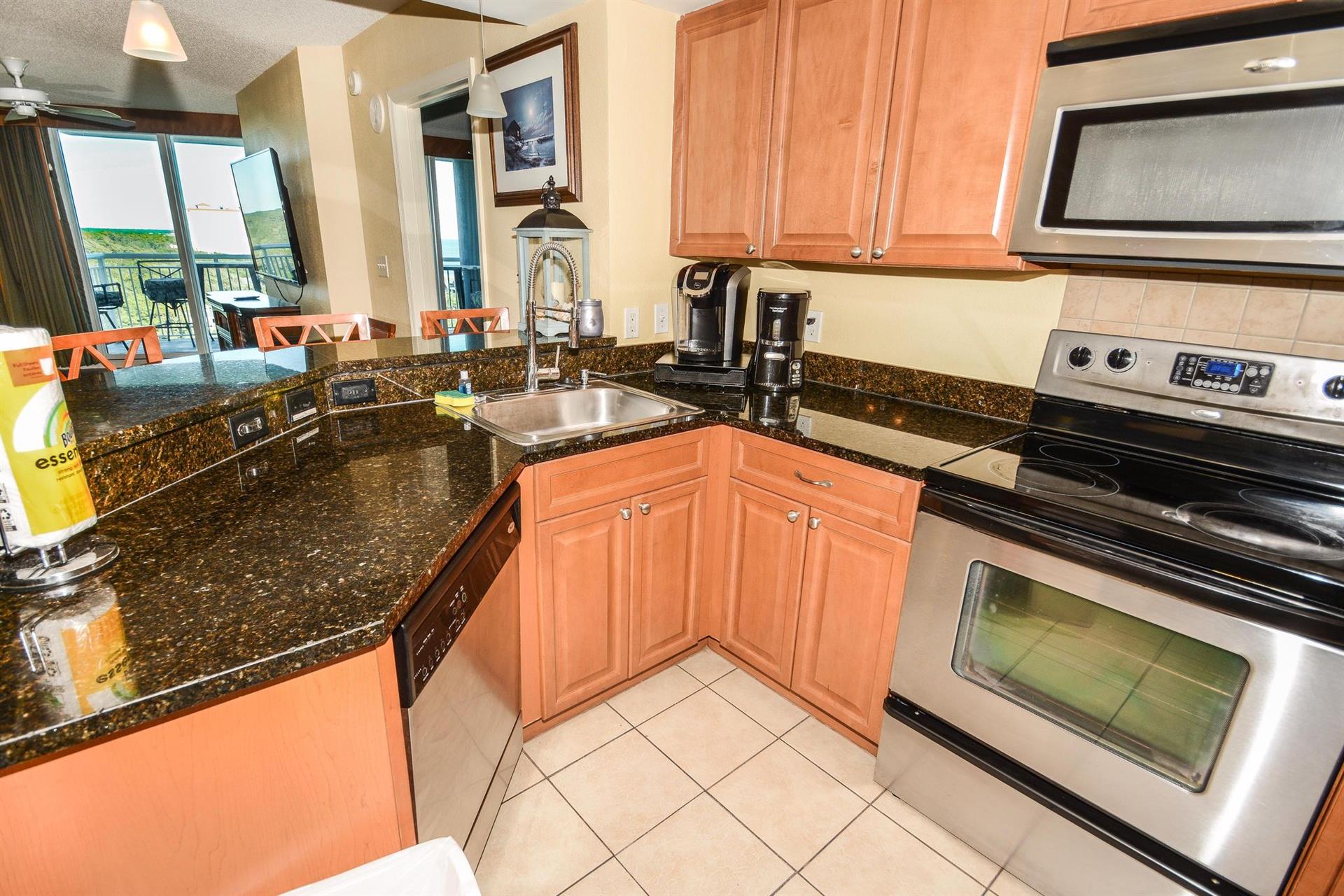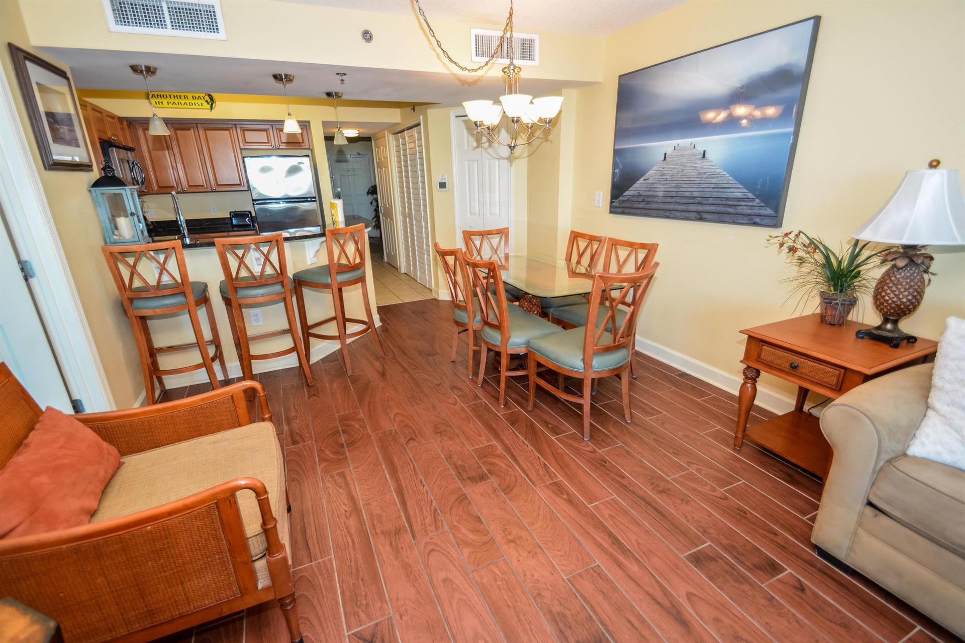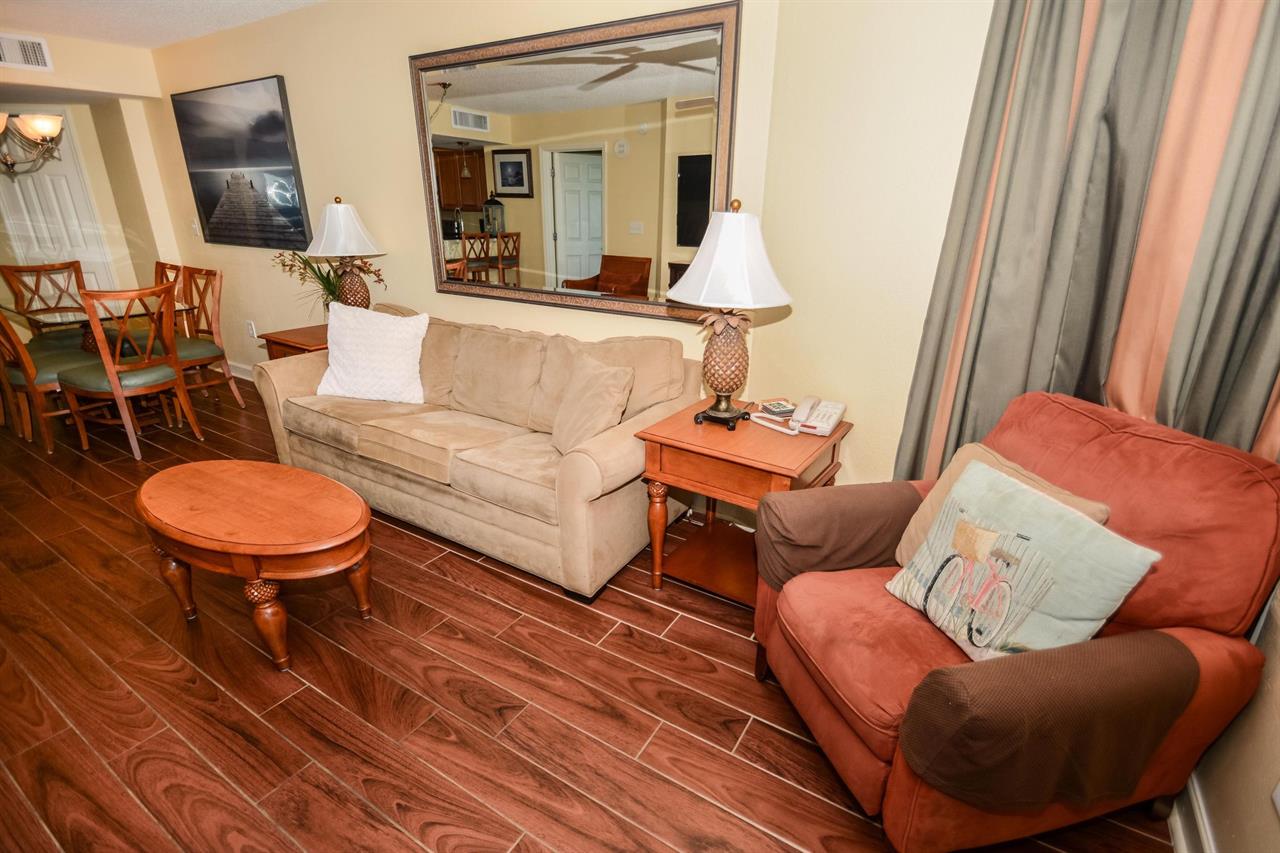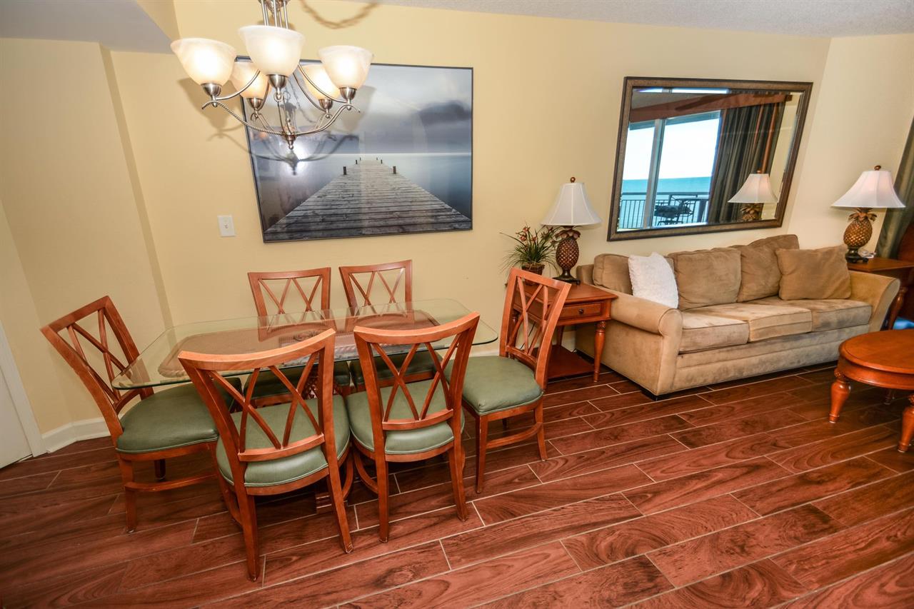 Enjoy the stainless steel appliances in this condos spacious kitchen before relishing in your meal at your six-person glass table. Relax on your comfortable couch while watching the morning news. The couch can become a sleeper sofa. A major bonus to staying in this Myrtle Beach vacation rental - the large 65” flat-screen TV fully-equipped with Netflix and Amazon!