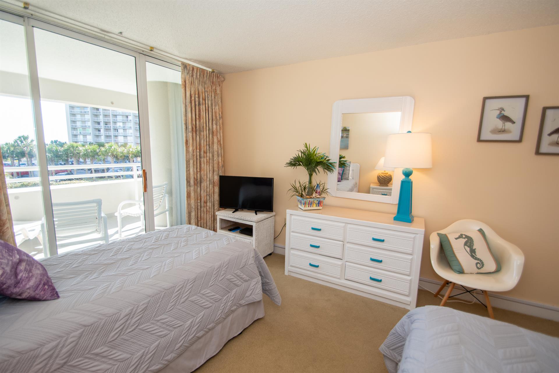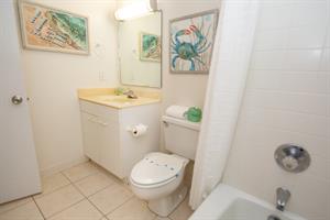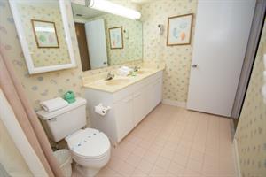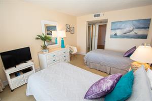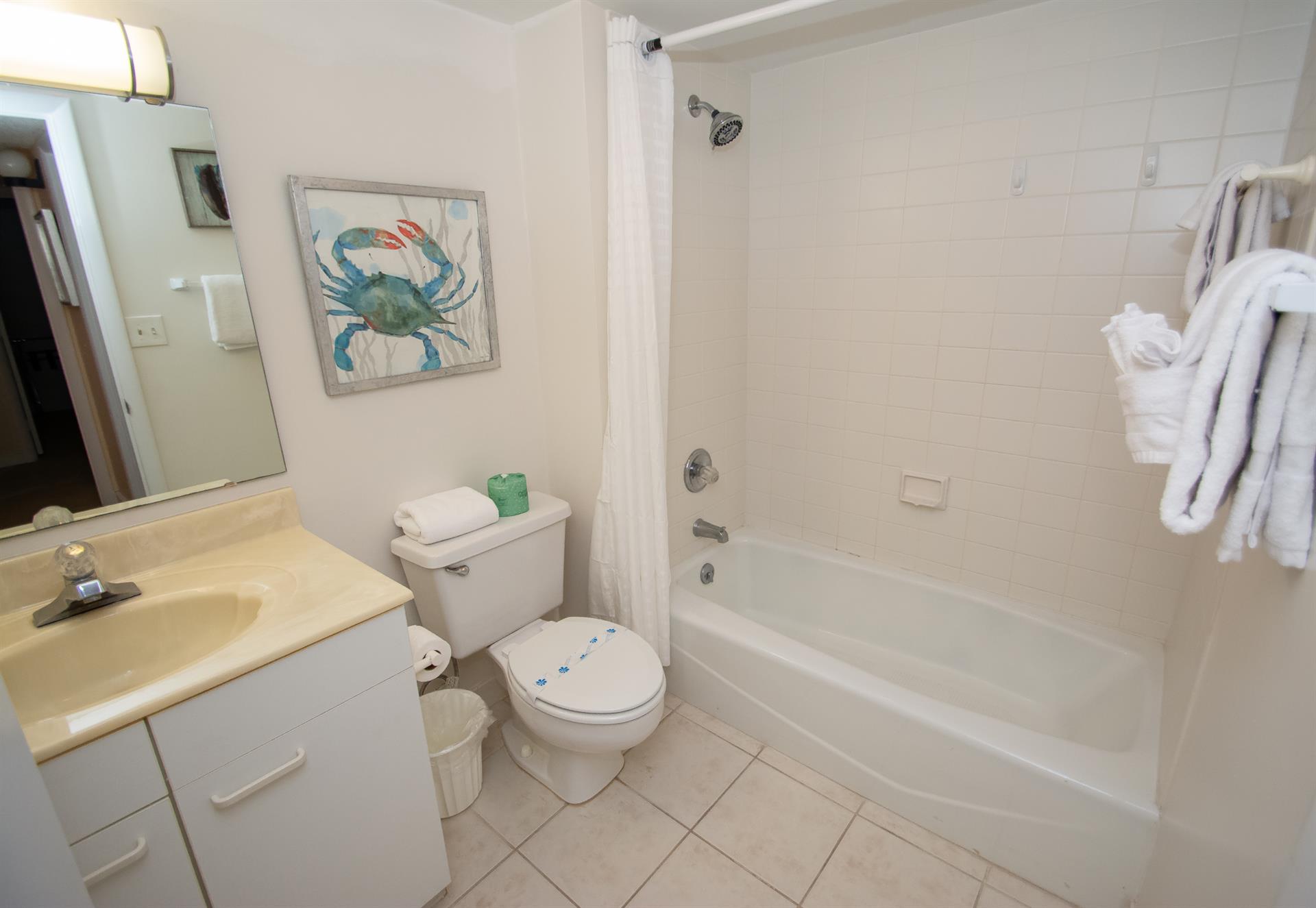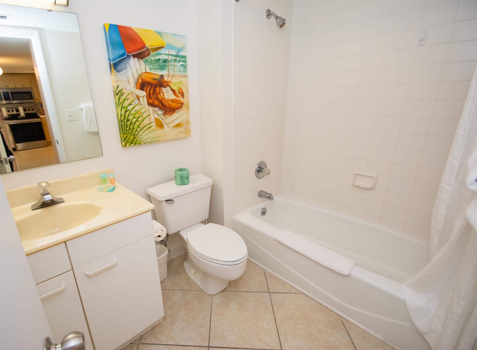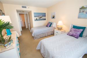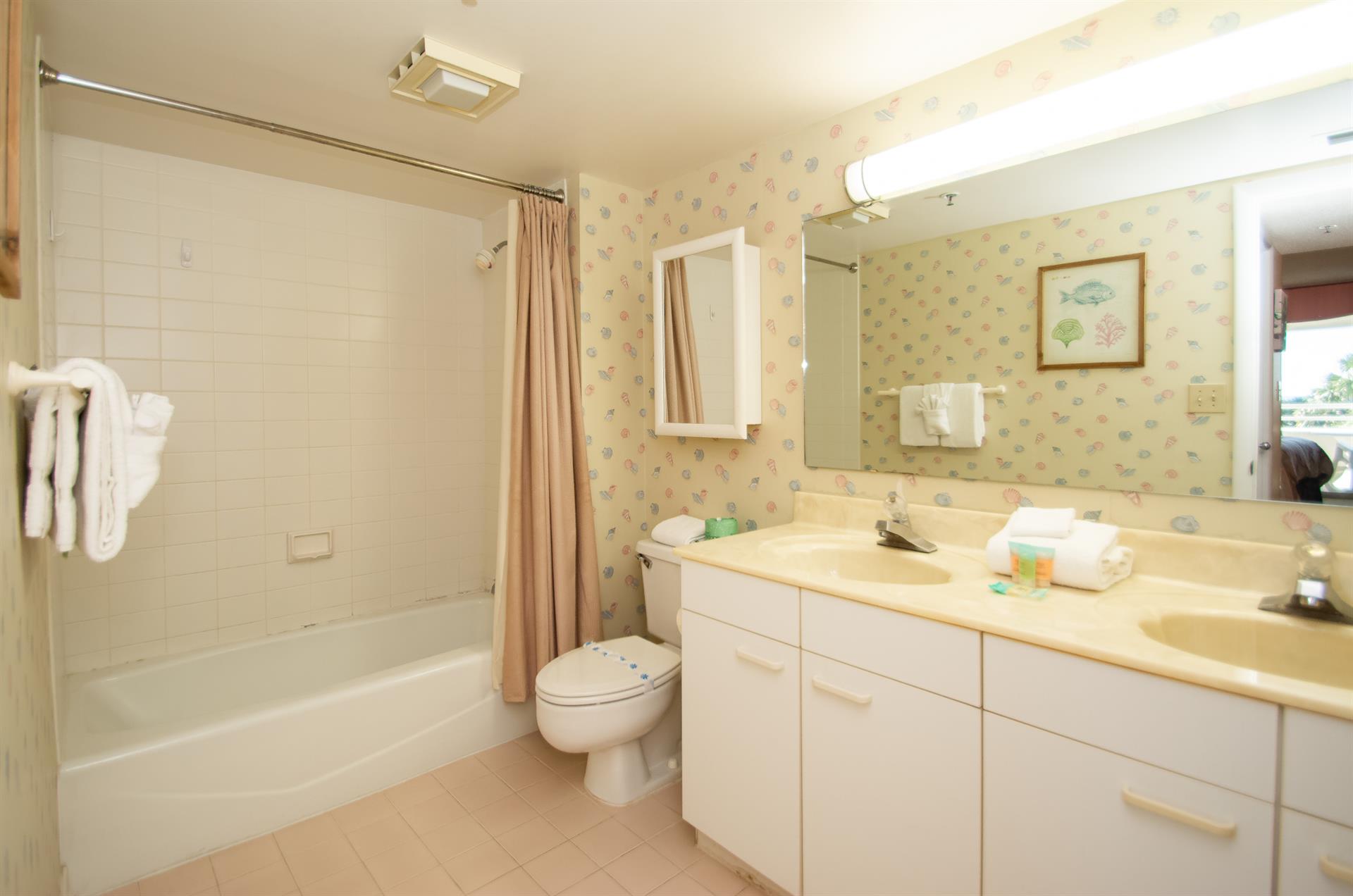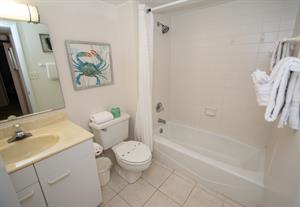 On the second floor of North Hampton 124, you will find the peaceful master and second bedroom suites. Sleep in bliss in your master king-size bed with incredible ocean views. In the master bathroom, you will find an extended vanity area and bath/tub shower combo. The shabby-chic style of the second bedroom comes with two twin size beds and an ample amount of space for your vacation belongings. The second bathroom next to this bedroom comes with a shower/tub combo too.