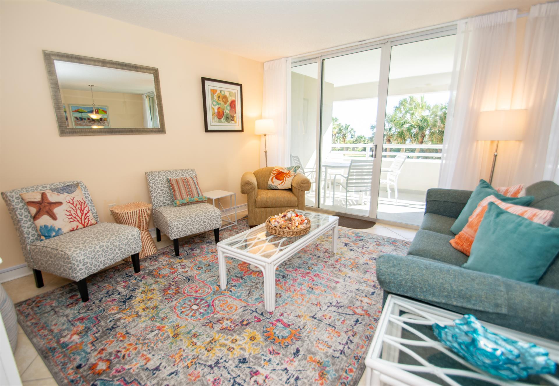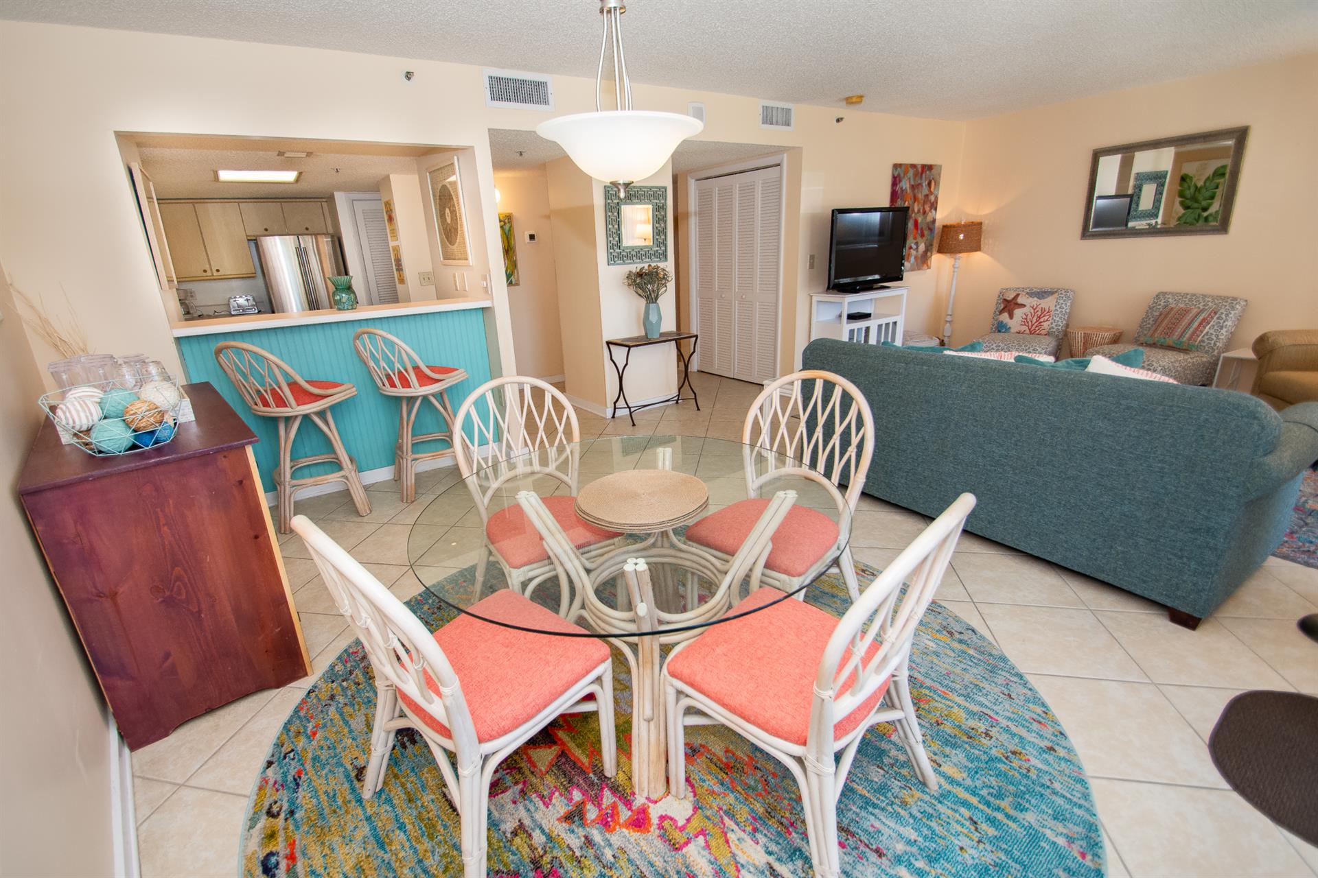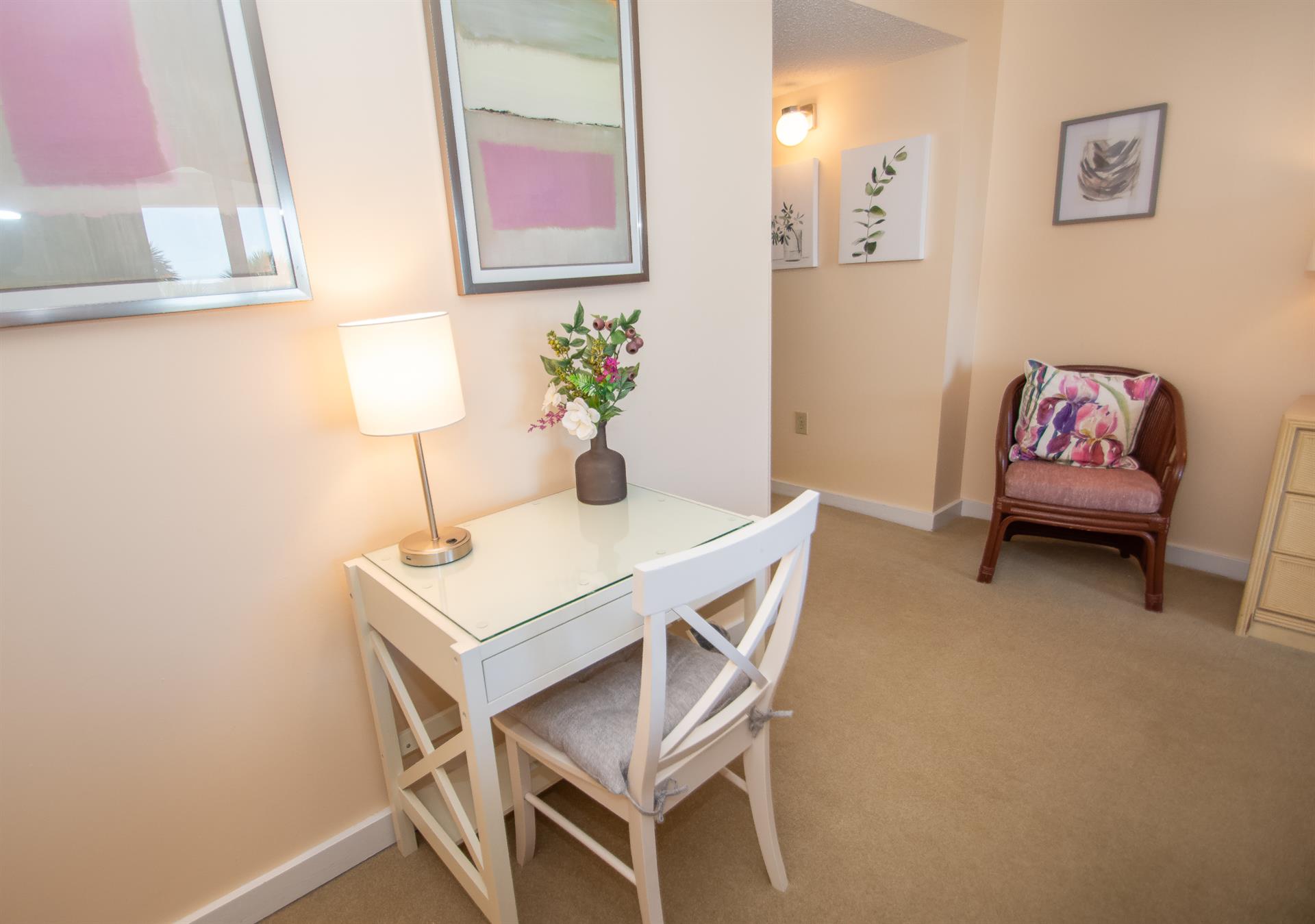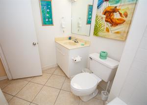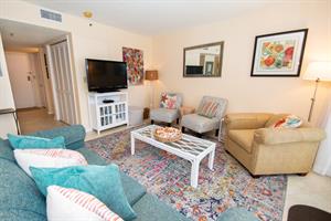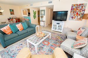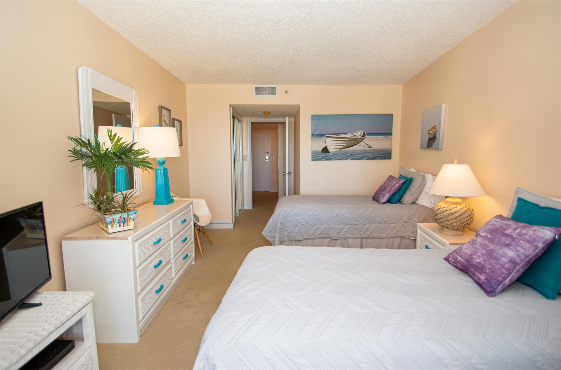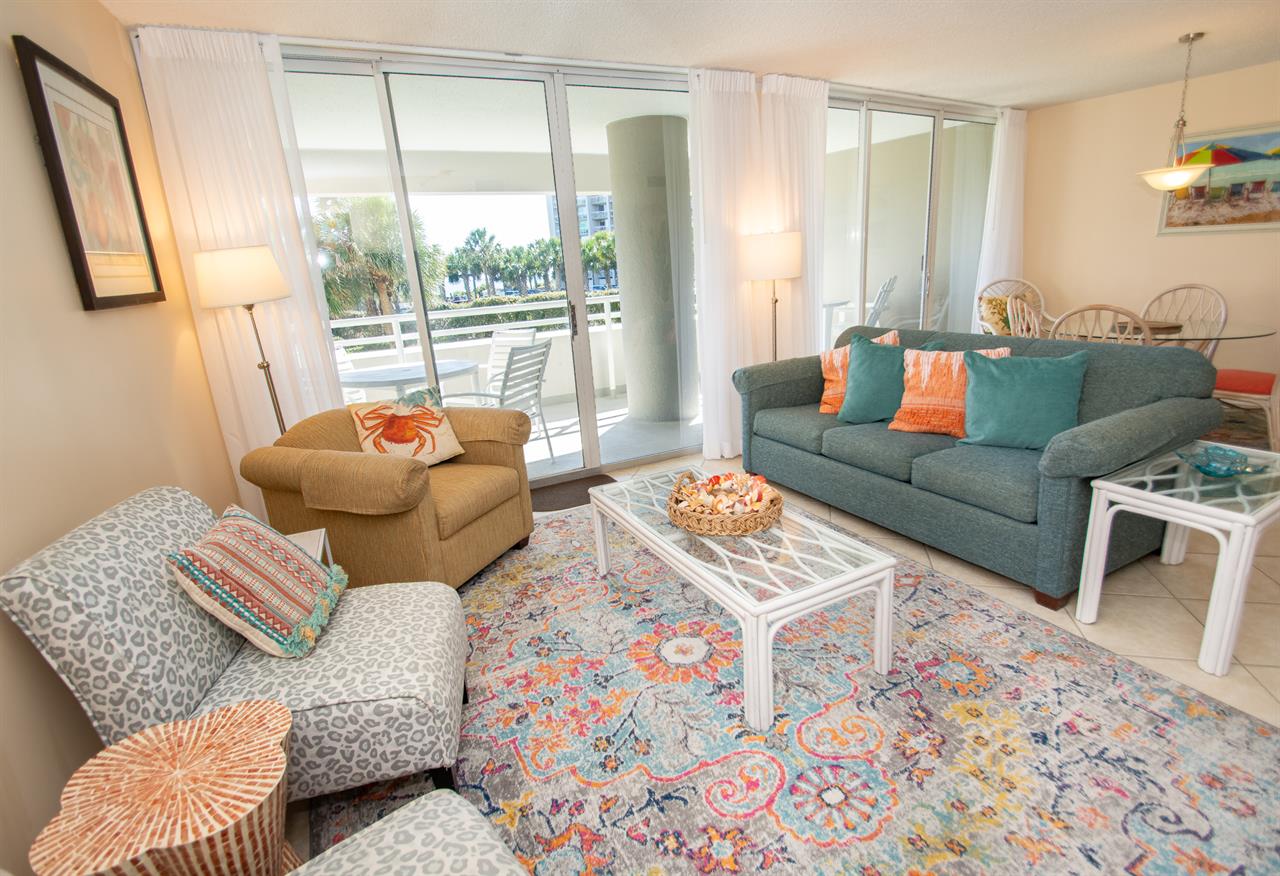 On the second floor of North Hampton 124, you will find the peaceful master and second bedroom suites. Sleep in bliss in your master king-size bed with incredible ocean views. In the master bathroom, you will find an extended vanity area and bath/tub shower combo. The shabby-chic style of the second bedroom comes with two twin size beds and an ample amount of space for your vacation belongings. The second bathroom next to this bedroom comes with a shower/tub combo too.
