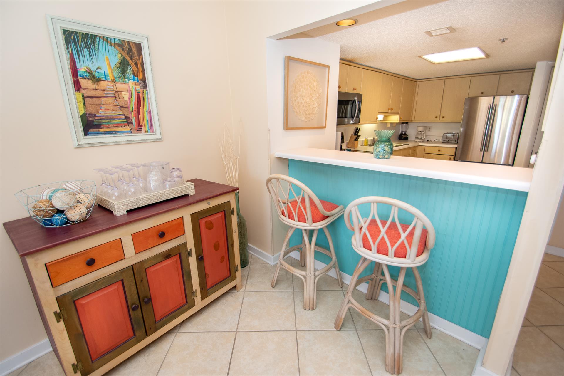 As you walk into North Hampton 124, you will first be captivated by the light and breezy interior- styled living area. Unwind in this space while overlooking the beautiful Kingston Resort area and water views from the six wide glass doors leading onto your private balcony. Wake up each morning to the Atlantic Ocean waves whistling by. At this Myrtle Beach vacation rental, you will have access to the two-story patio from the first-floor living space and second-floor bedrooms!