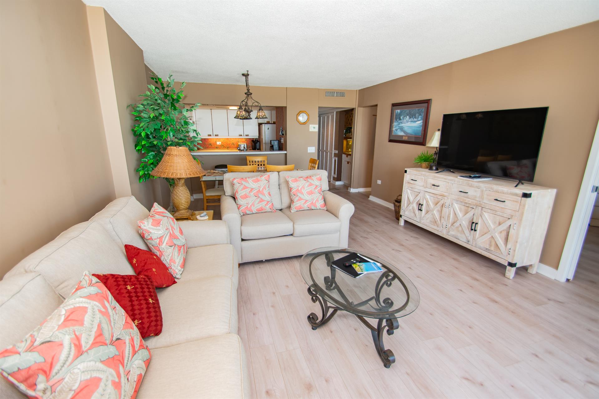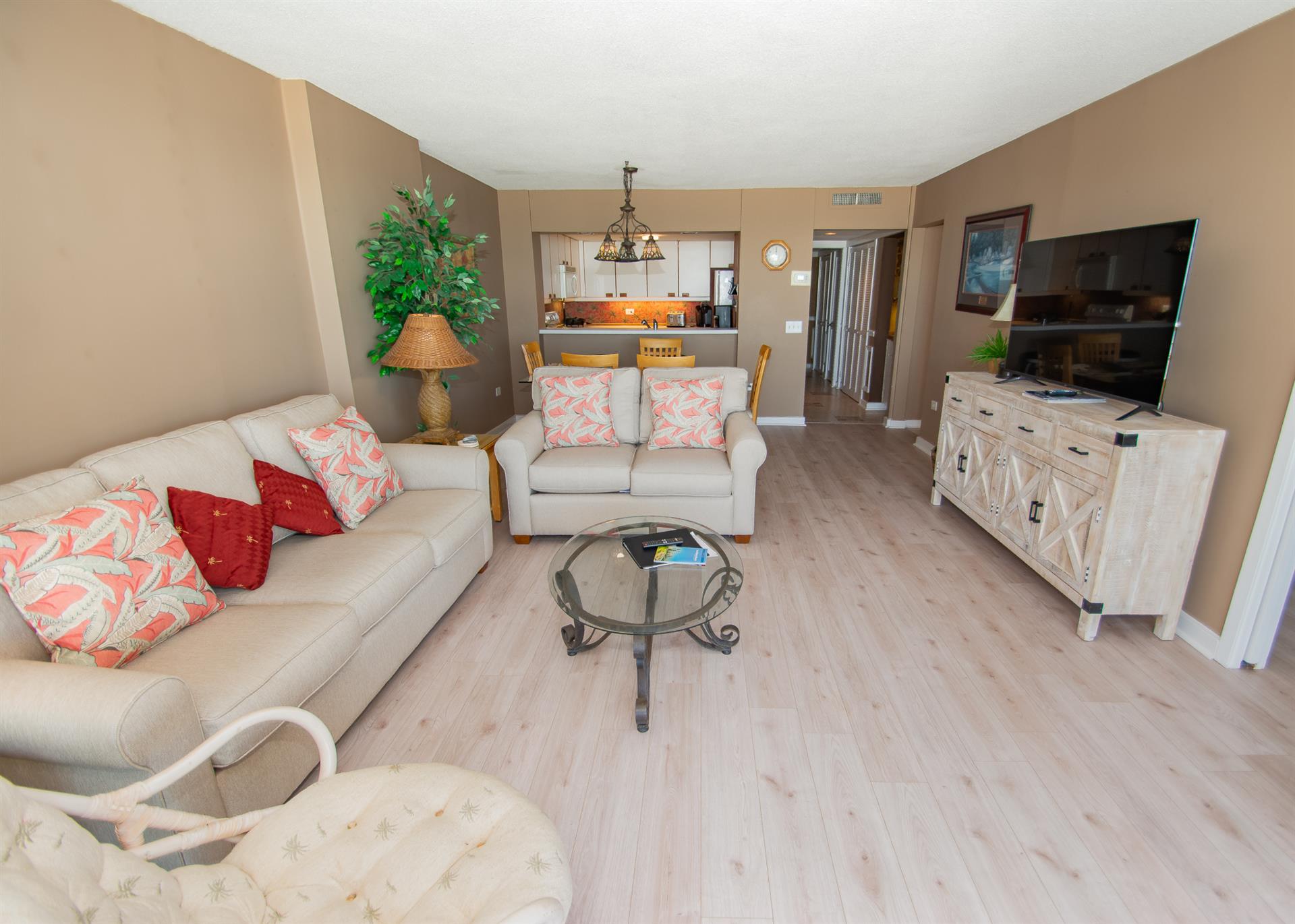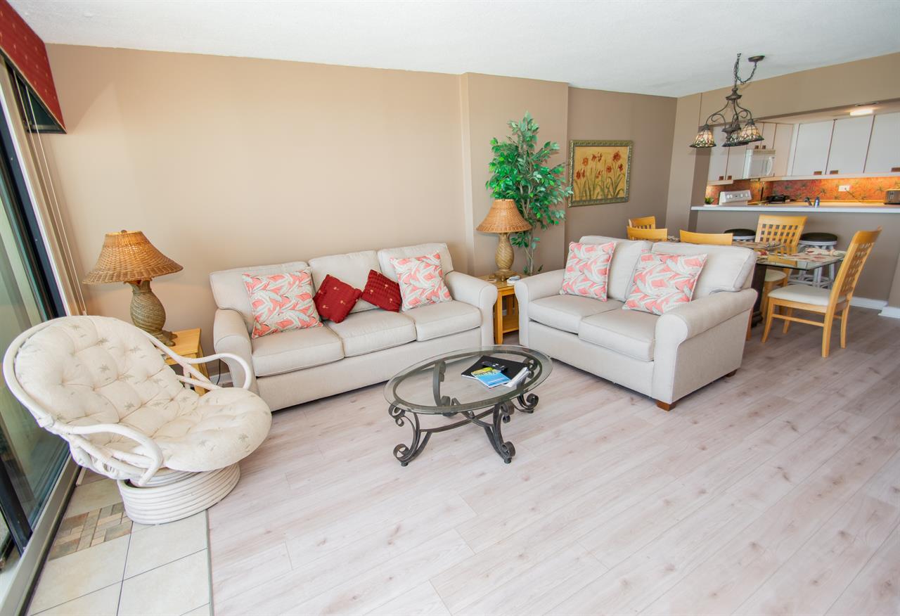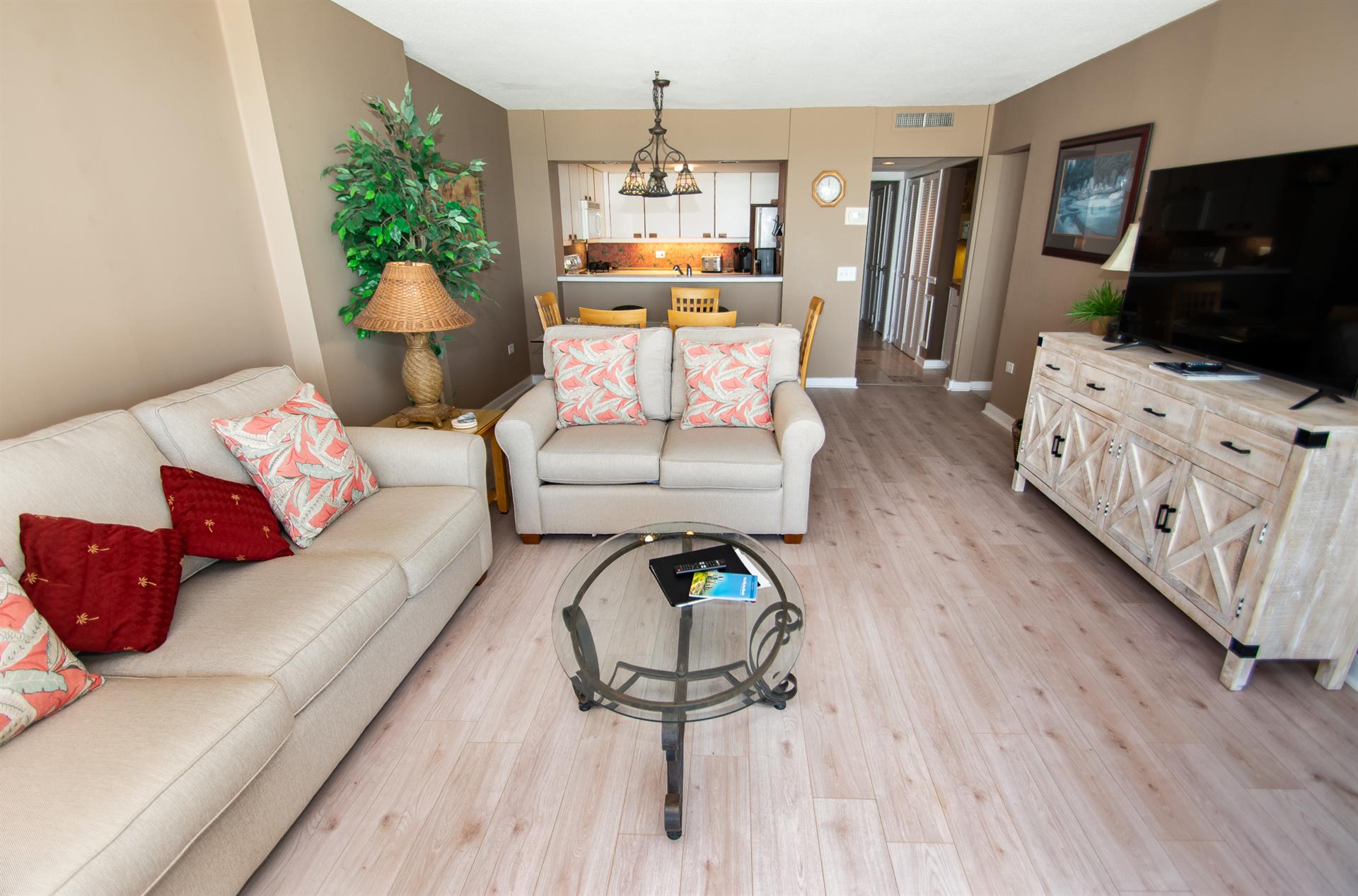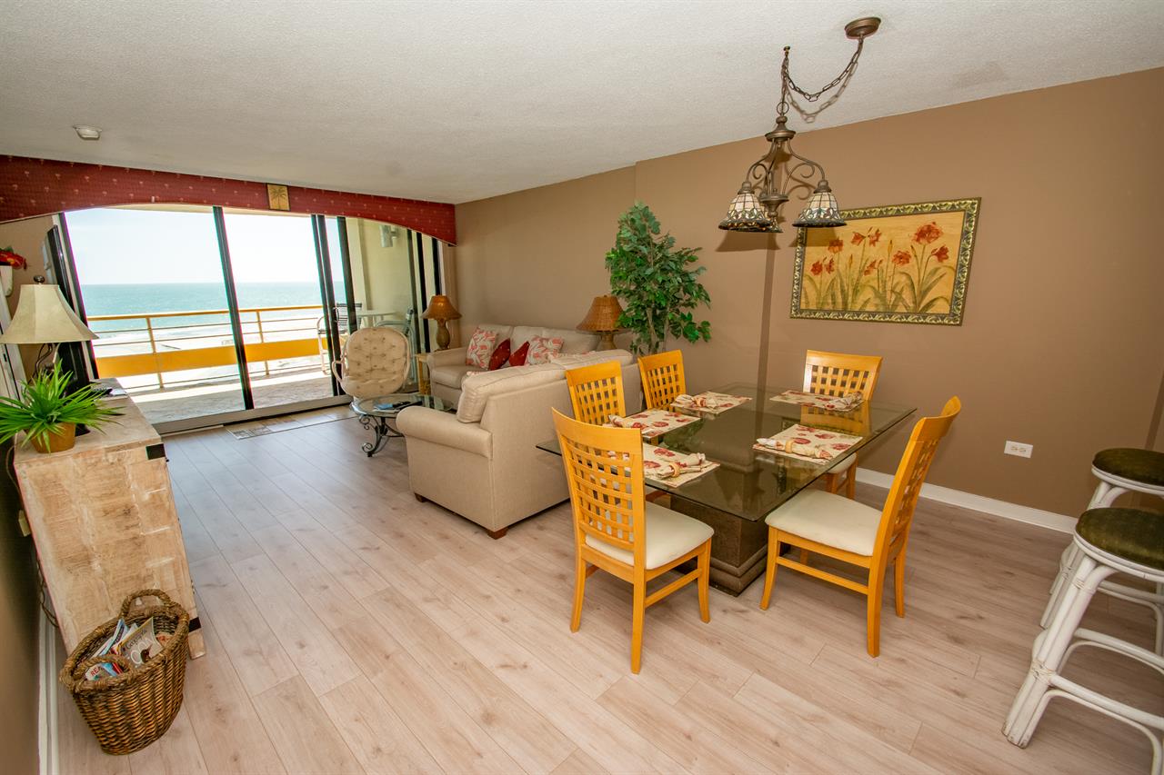 Relax in luxury in your spacious living room area with your very own flat-screen television while staying in F-11. This condo comes with a fully-equipped kitchen excellent for any cooking needs you might have during your beach stay. Delight in a tasteful meal around the six-seater glass table before soaking in the Myrtle Beach sun rays on your extended private balcony! A major bonus to staying at F-11 - your own private bar next to the kitchen.