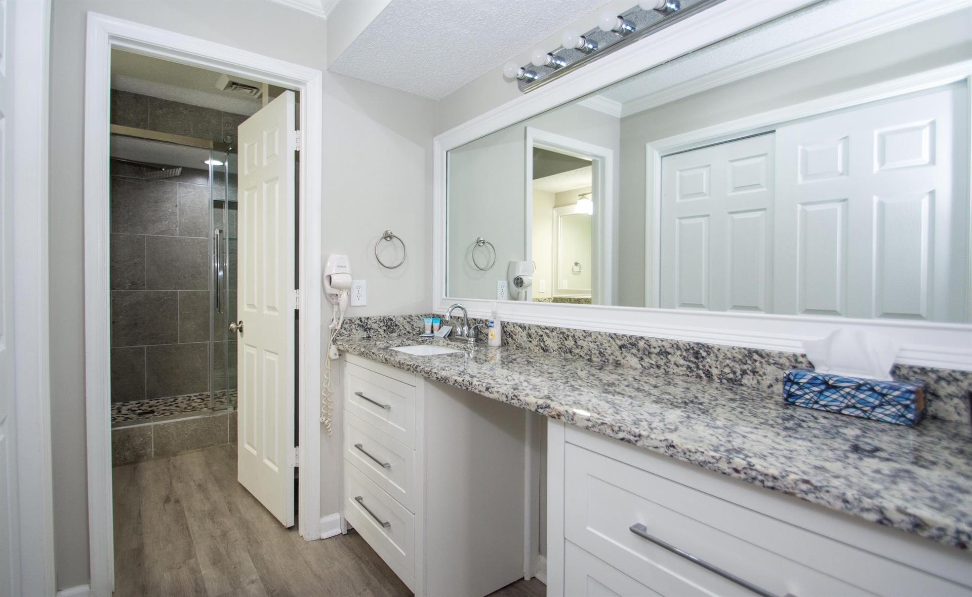 We thoroughly enjoyed our stay. The views were incredible. He Rain shower heads were amazing, just wish there was enough hot water. The place is beautifully remodeled. The parking garage leaves a little bit to be desired. We were lacking certain amenities that were not made clear to us ahead of time. Such as both pools being closed. The kitchen lacked hot pads, serving dishes, grilling equipment, dish towels. And there were not enough dishes to feed the amount of people that can stay in the condo for more than one meal. You will need to do dishes after every meal. The bathrooms like trash cans and some place to hang wet towels, beach or bath. Unfortunately you could tell that it was not as clean as one would like. There were dust bunnies under every bed or dresser. The beds make a ton of noise.