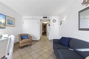 Wake up to the sound of waves you can hear and see right from your own private balcony. Your 1 bedroom condo includes a kitchenette with appliances and cookware. Because of the room layout, there is no counter space or table in the kitchen, but you will be able to use a nice 4-person dining room table located in the living/dining room area. Your condo comes with complimentary WiFi Internet access.