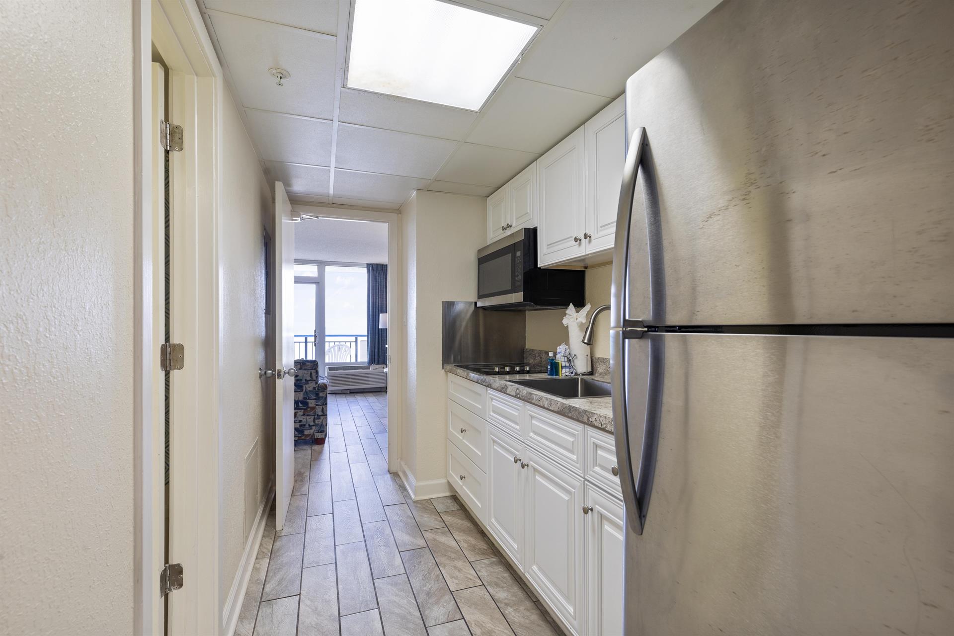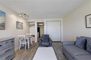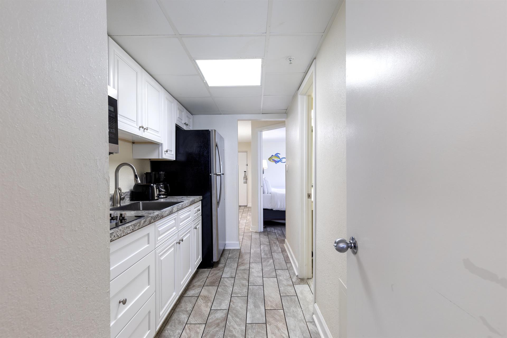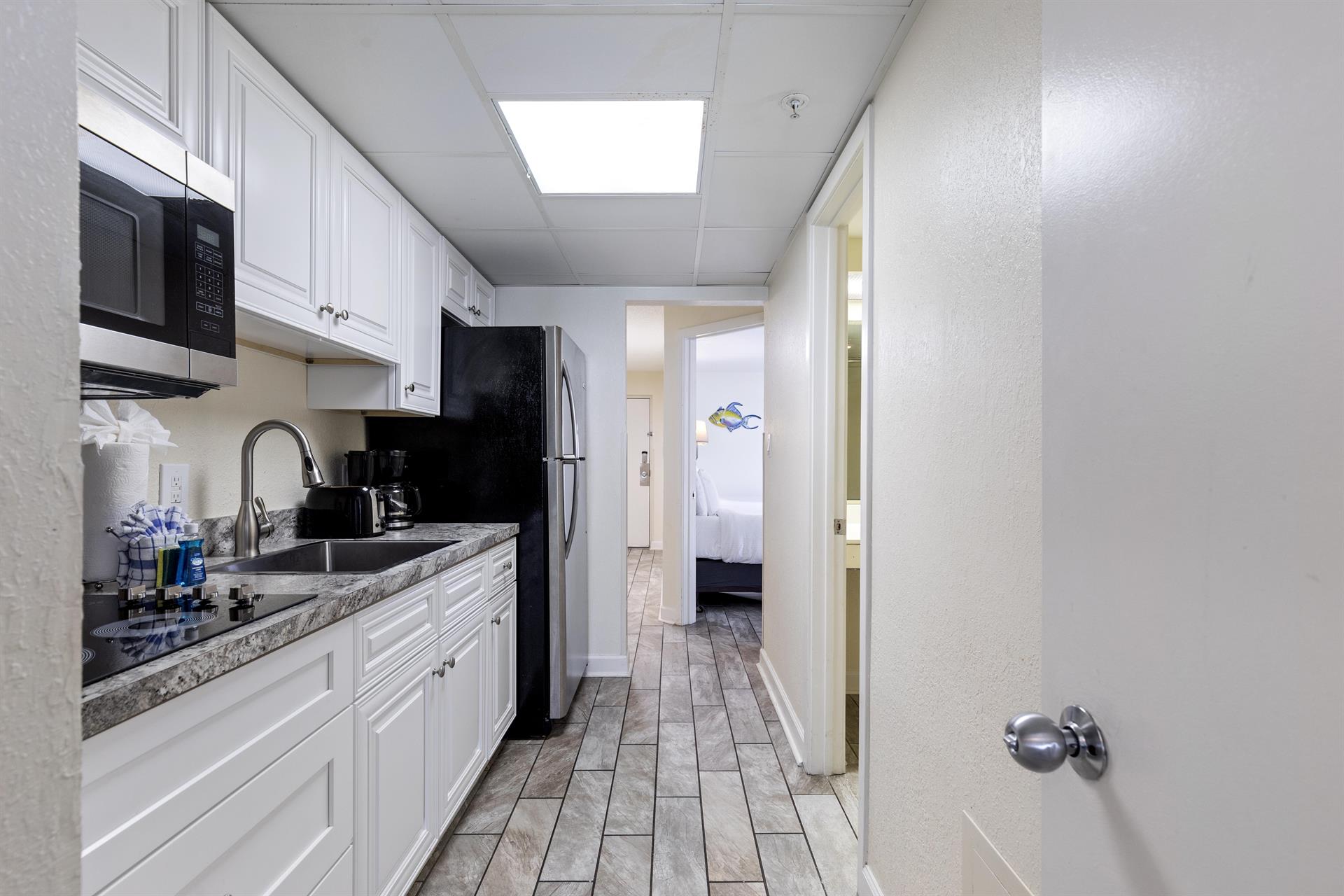 The condo has been totally remodeled with new kitchen, mattresses, luxury tile flooring and textured walls. There is a large 55-inch TV in the living room and a second 43-inch TV in the bedroom. The kitchen has all new cabinets, counters, and appliances, featuring a full-size microwave over the electric stove top.