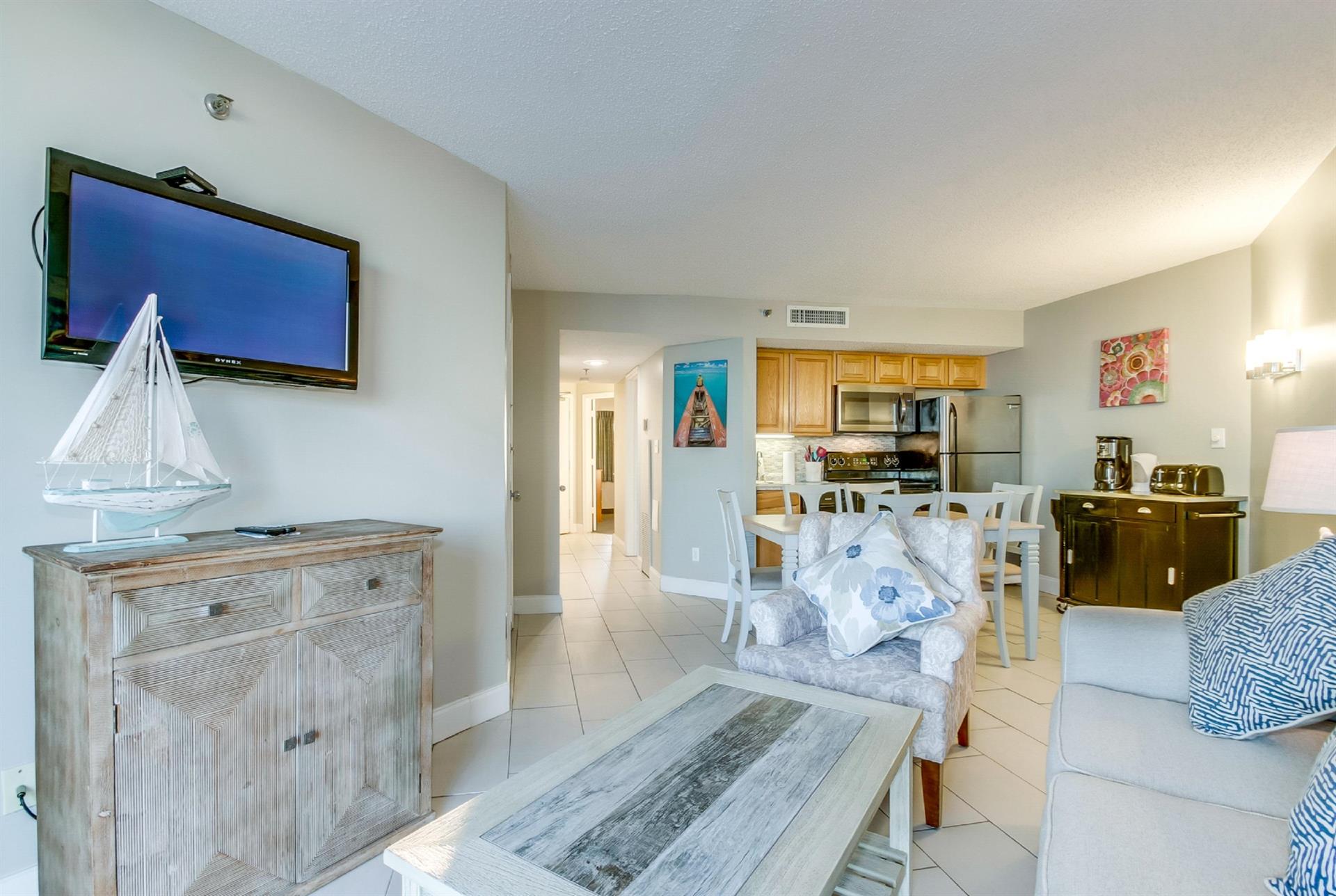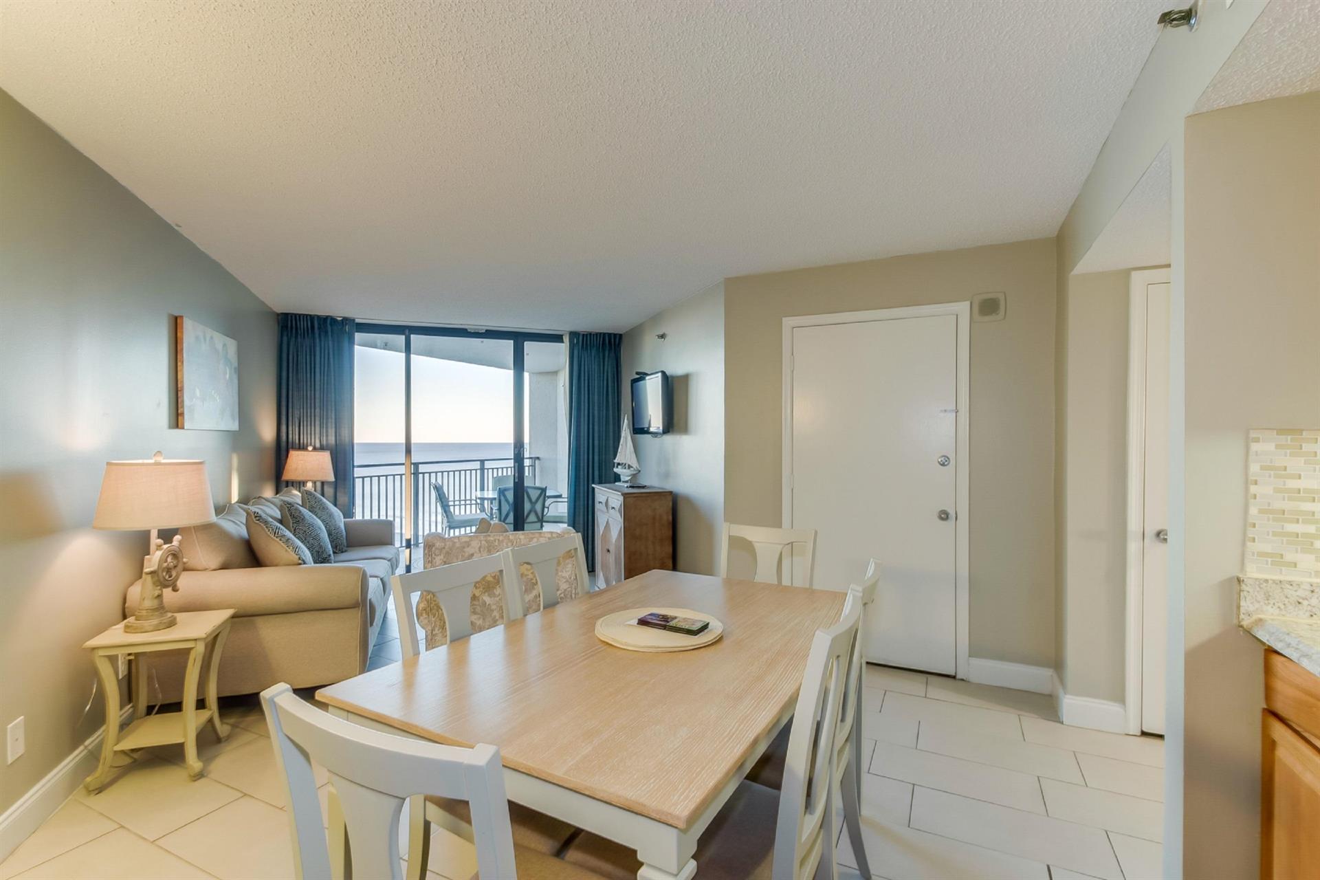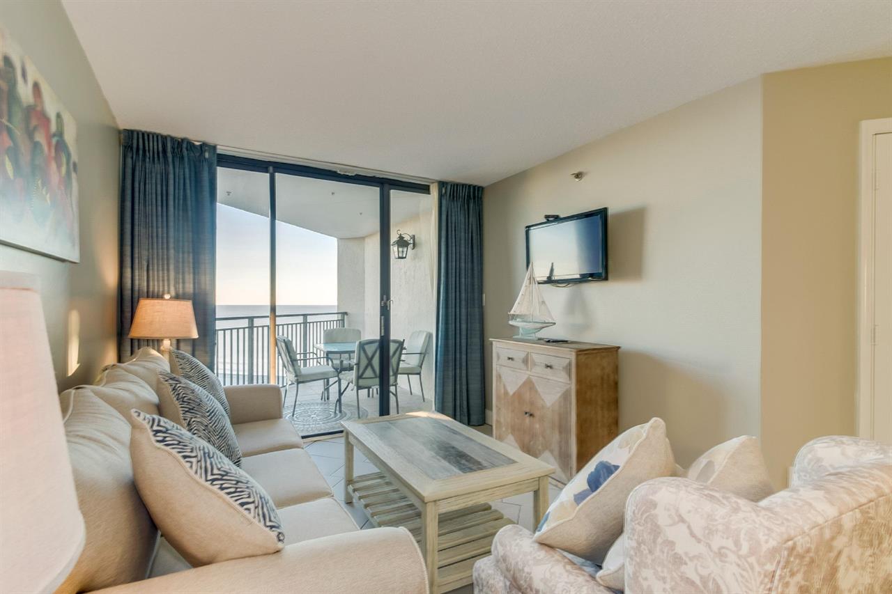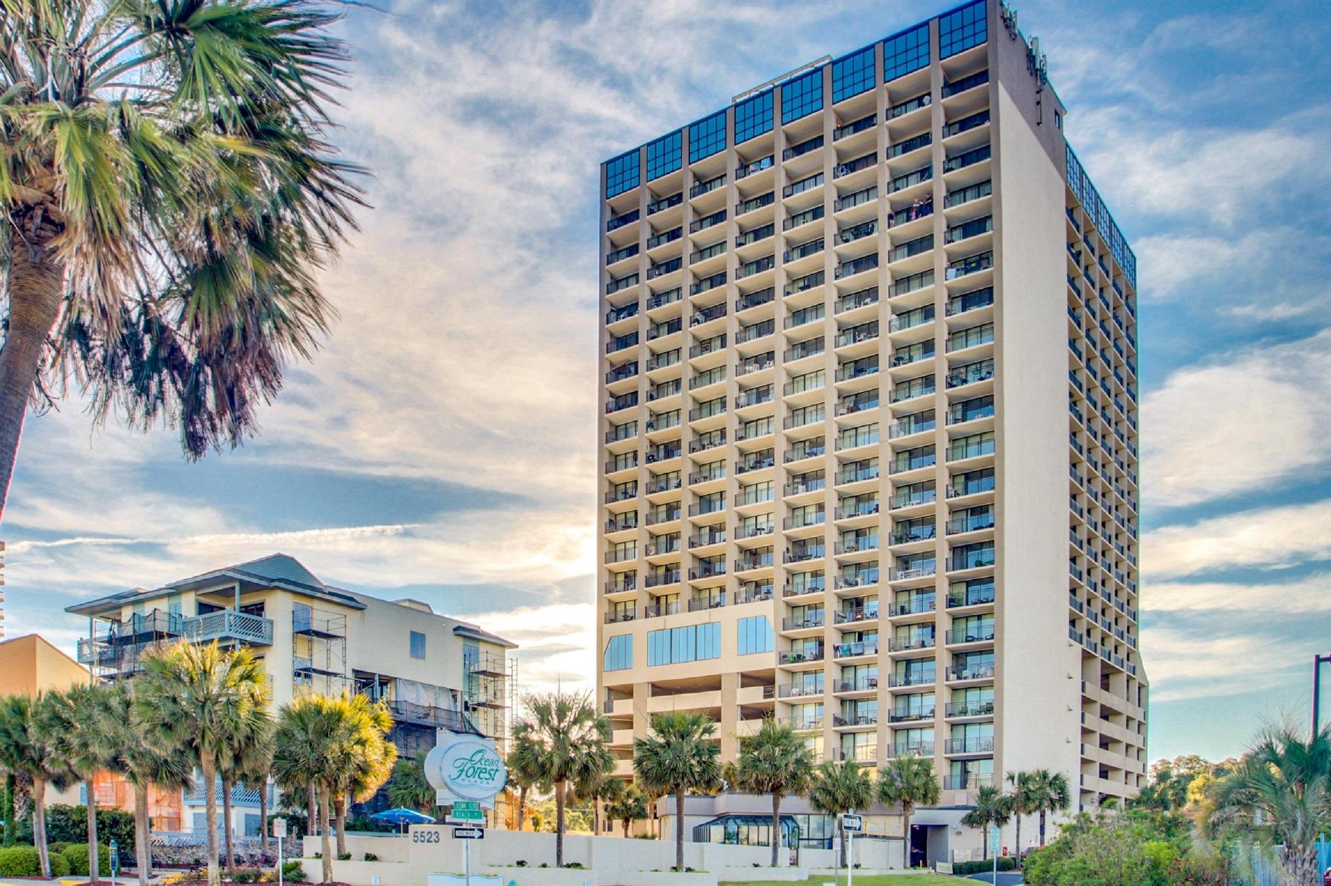 Located in the exclusive Ocean Forest neighborhood, Ocean Forest Plaza features the perfect getaway for couples, families and groups looking to avoid the noise and neon lights of the rows of hotels downtown. But Ocean Forest Plaza guests are only short driving distances away from the Myrtle Beach Boardwalk, Broadway at the Beach and Market Common. Take a short stroll across Ocean Boulevard and through the towering dunes to the most secluded stretch of oceanfront in Myrtle Beach, or kick back beside the on-site pools and soak up the sun and the scenery. Despite the tranquil atmosphere, the excitement and entertainment of the Grand Strand are only short drives away.Features and amenities • Light-filled living area overlooking the beach and the ocean