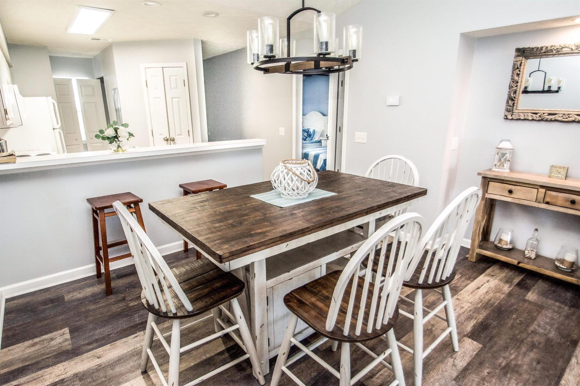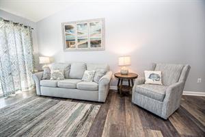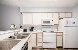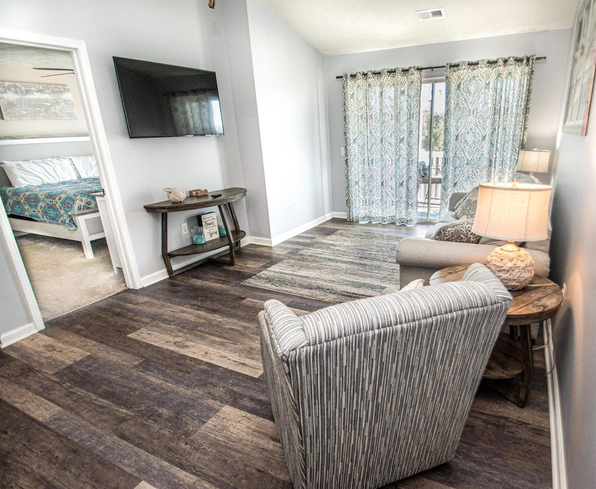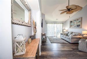 As you walk into Waterway Village 17-H, you will find a spacious and fully-stocked kitchen, dining room, and living room area. This unit was updated with classic hardwood floors and new furniture! In the living area, there is a wide flat-screen television and access to your private balcony! Whip up a delicious breakfast in your premier kitchen before savoring it around the four-seater dining room table. Better yet, enjoy your cuisine while relaxing on your beautiful and spacious patio overlooking the community pool and waterway!