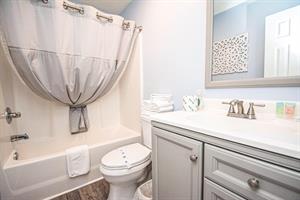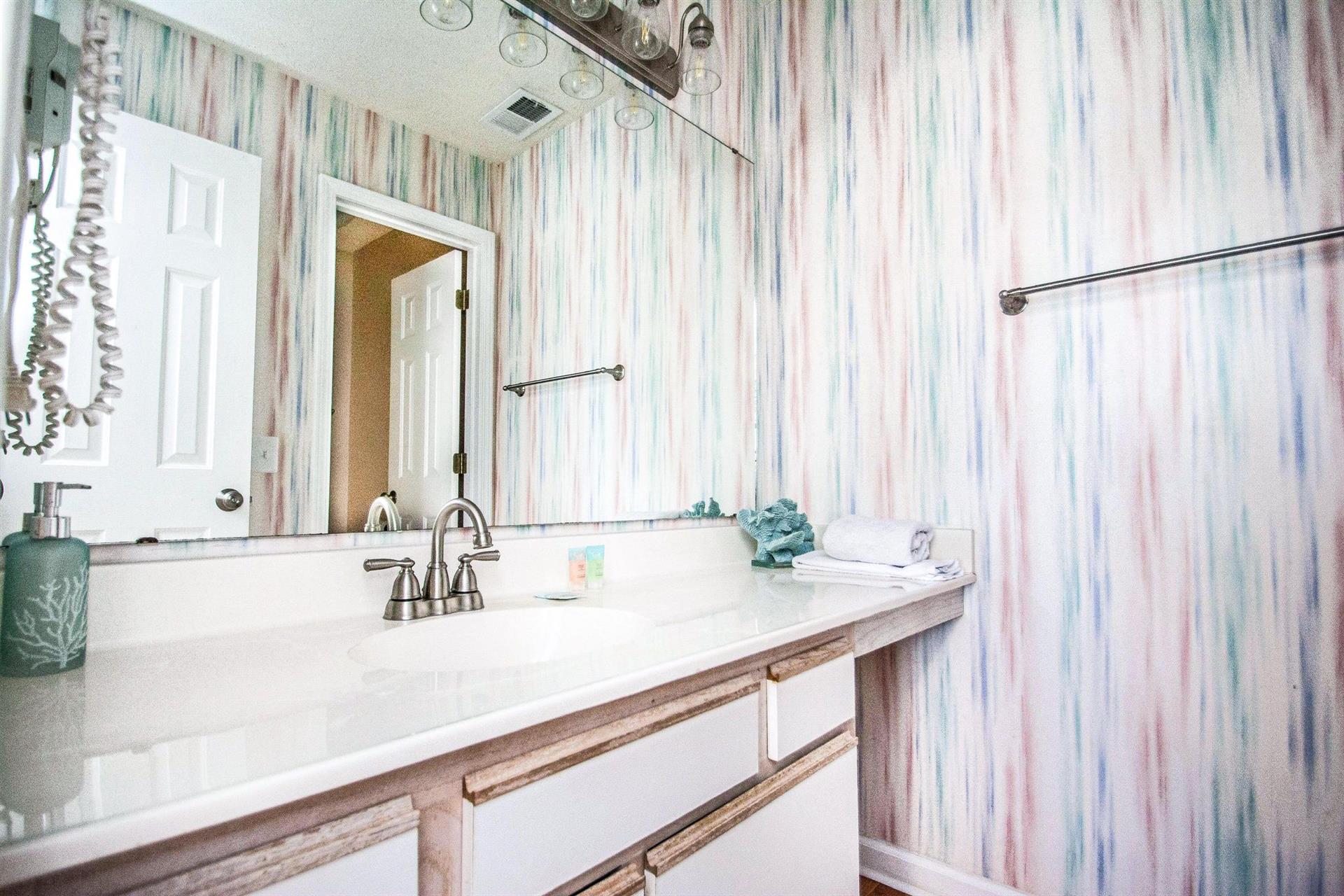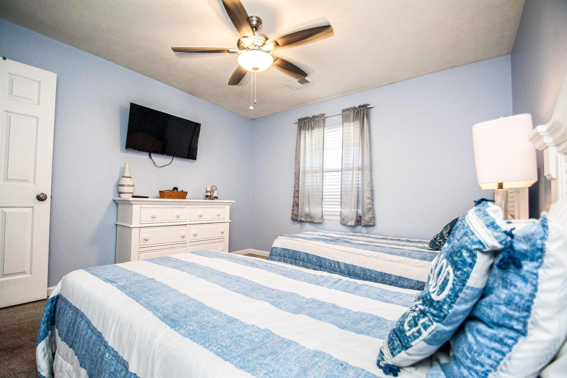 In the master bedroom, there is a king-size bed with a flat-screen television and an ample amount of space for your belongings. There is access to your private balcony with waterway views from this bedroom! The master bathroom has a spacious vanity area and a private bath/shower. In the second bedroom, there are two twin-size beds. The second bathroom is located right outside of the second bedroom and has a bath/shower combo. This unit also has a washer and dryer!