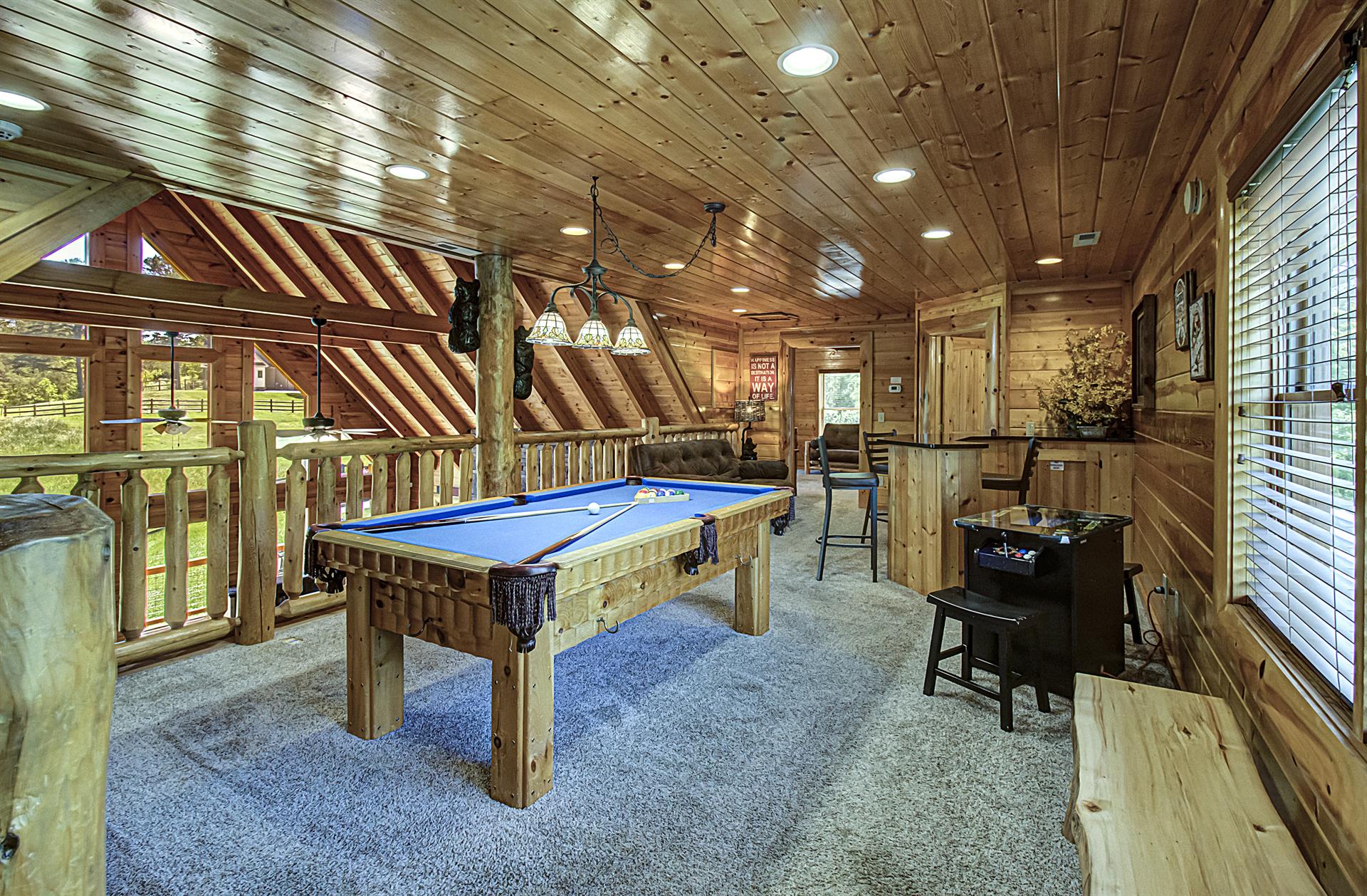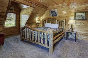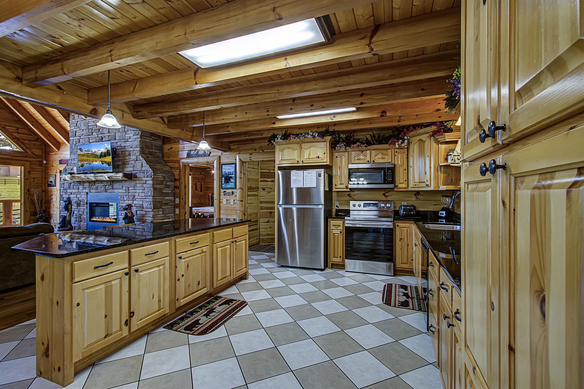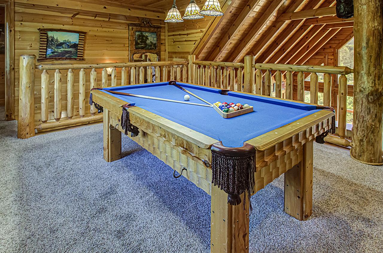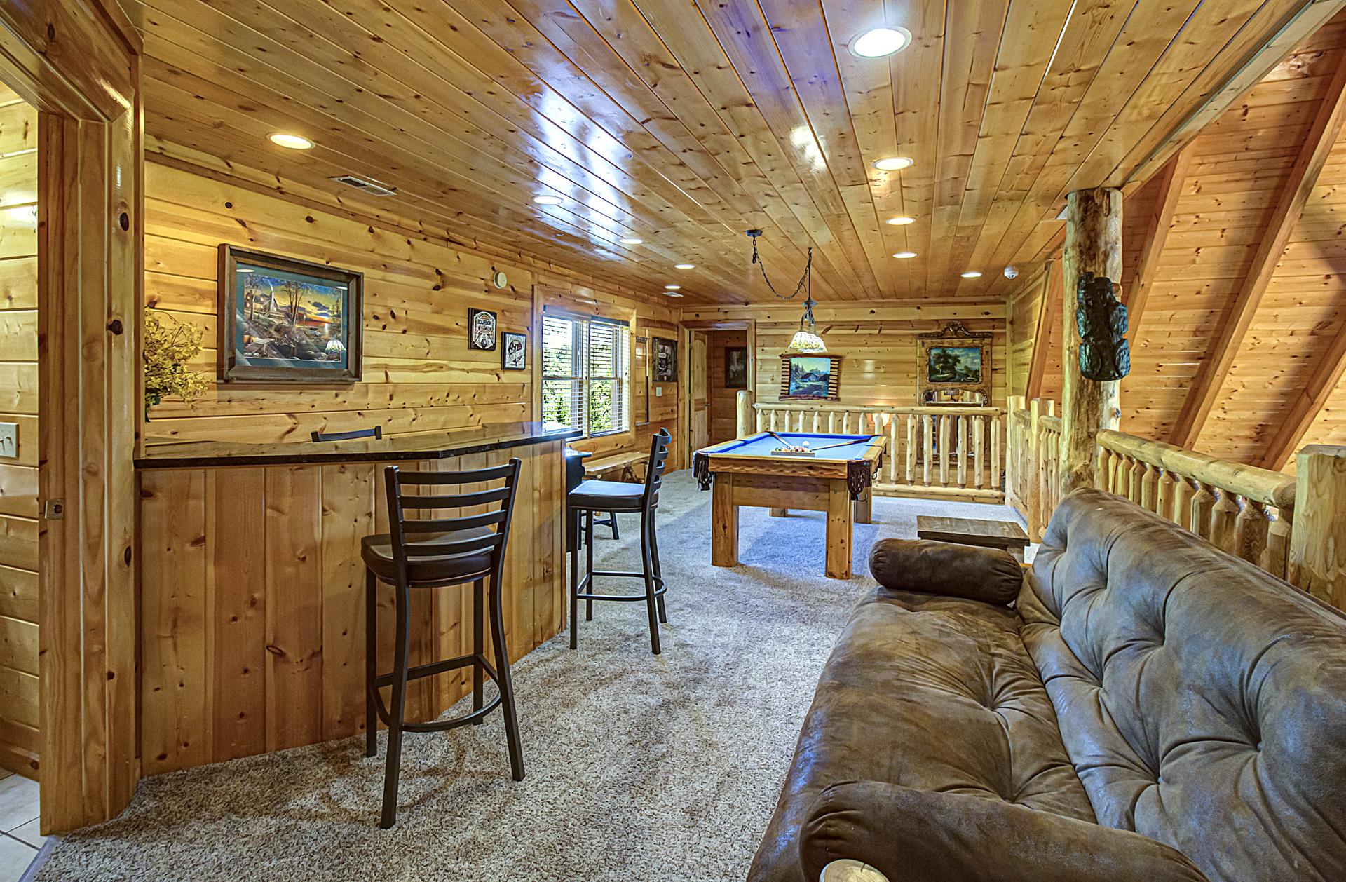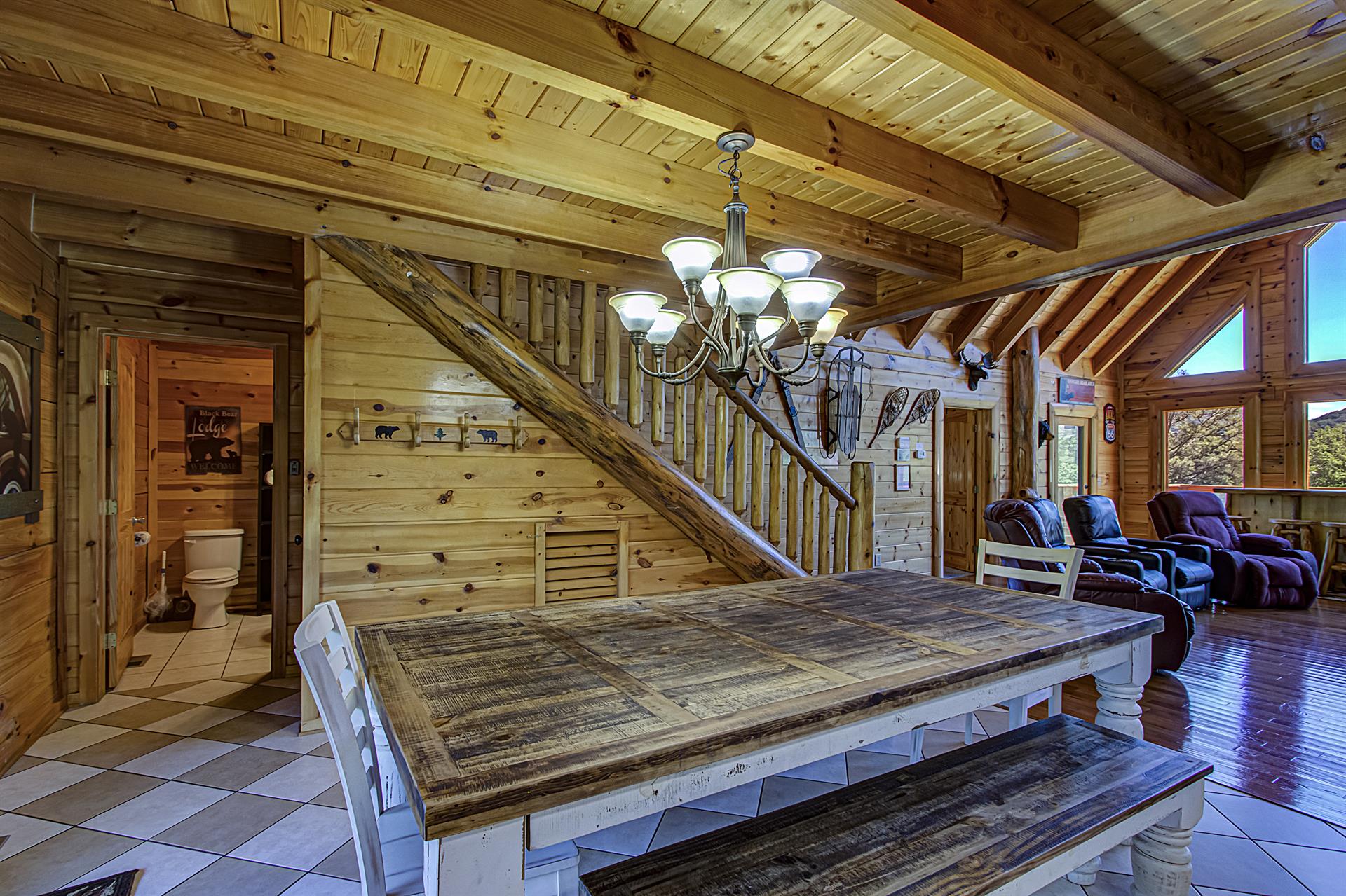 Your Dream vacation starts here with this beautifully decorated, spacious 4 bedroom cabin with all King size Log beds, offering 4 full bathrooms and 2 half bathrooms. Always Dreaming is exactly what you've been dreaming of when you imagine a Smoky Mountain Vacation. Offering a ramp-style entry way for easy access. Oversized for wheelchair accessibility. This luxury cabin is just minutes from Downtown Pigeon Forge and Dollywood. This cabin is furnished with spectacular furniture and all the amenities including HD Cable, High Speed Internet with WIFI. Enjoy the spacious luxury seating in the living area on the main floor with a huge Flat screen TV that sits above a beautiful contemporary indoor fireplace with color changing flames for year-round enjoyment and a sleeper sofa. Features a full kitchen with stainless steel appliances and granite counter tops with an Eat in Bar for extra seating that is adjacent to the Dining Room with a beautiful wood table and chairs. There are also 2 King bedrooms with ensuites on the main floor and a large laundry room with folding table, iron, and ironing board provided. Upstairs you can enjoy the game room equipped with a Pool Table and Bar and for your enjoyment! A futon is located in the game room with a half bath. Two King suites are located on the second floor too, one also has a futon. You may also enjoy the outdoor private covered hot tub and a spacious deck area with Rocking Chairs, a Park Grill located on the concrete outdoor patio area with seating for up to 12 guests, and a fire pit for your enjoyment. Let your Dream Begin!. Must be 25 years old to rent.
