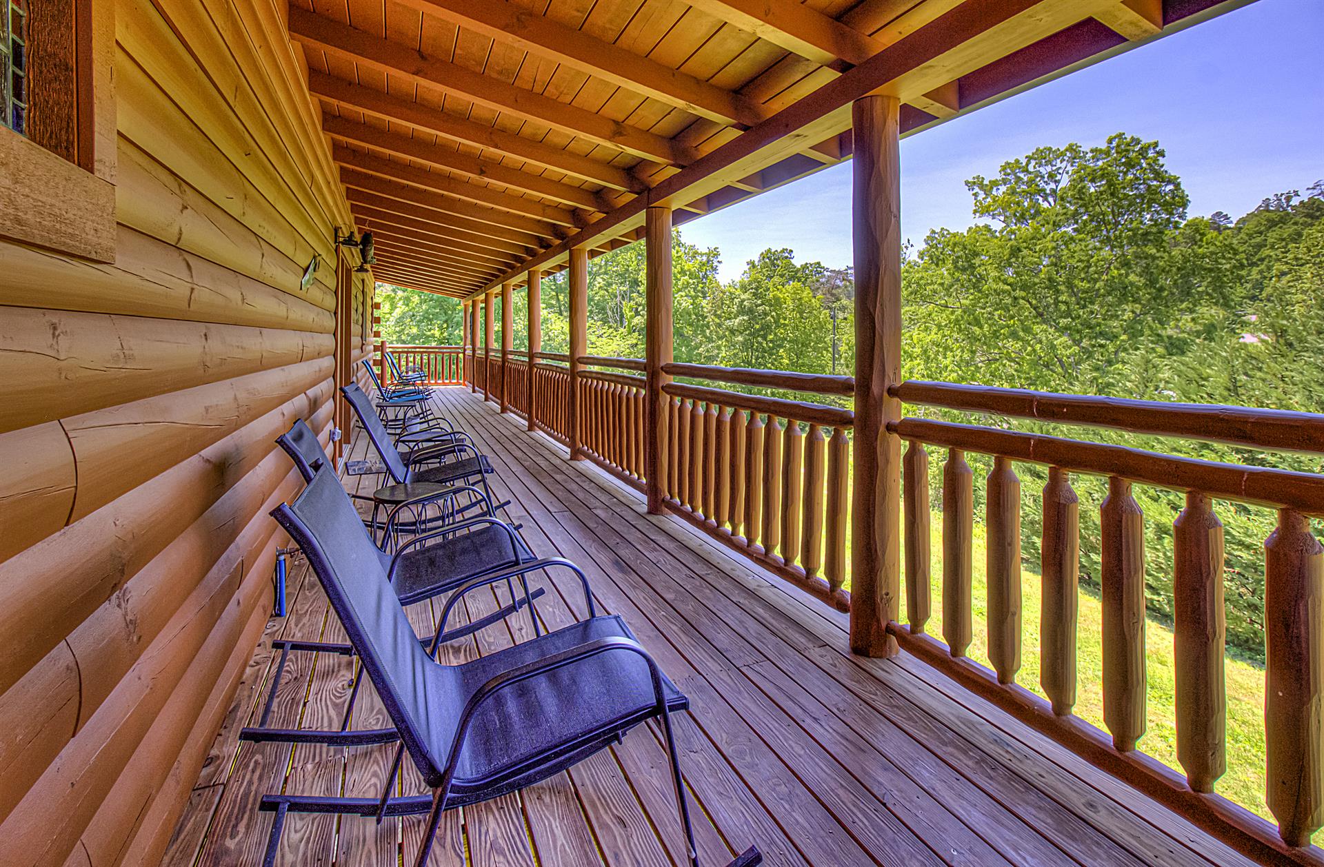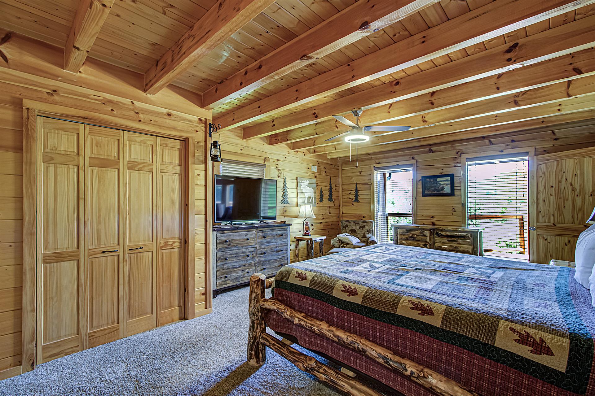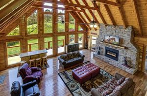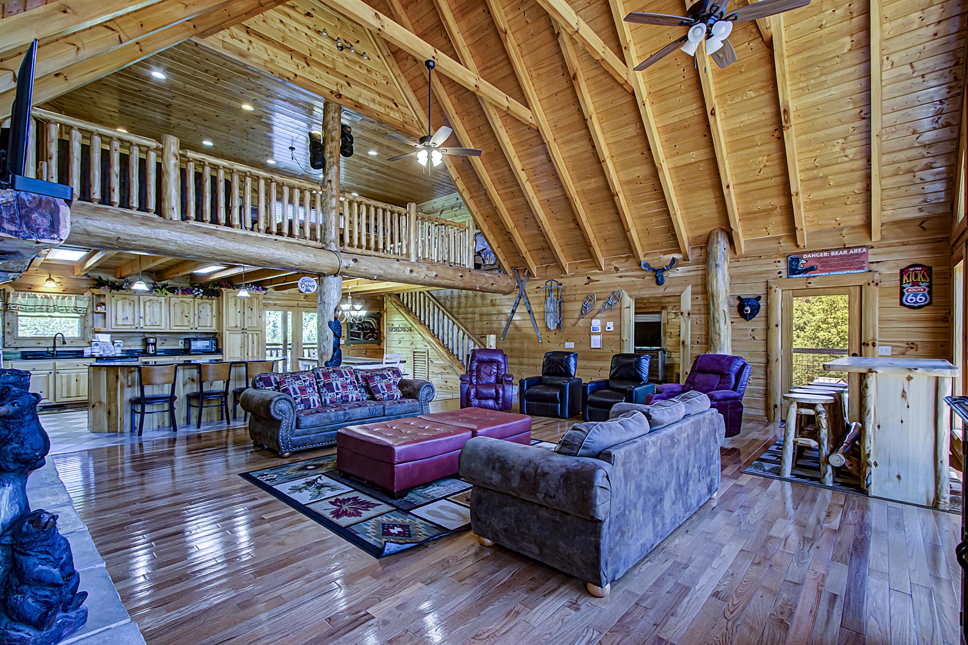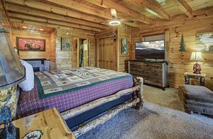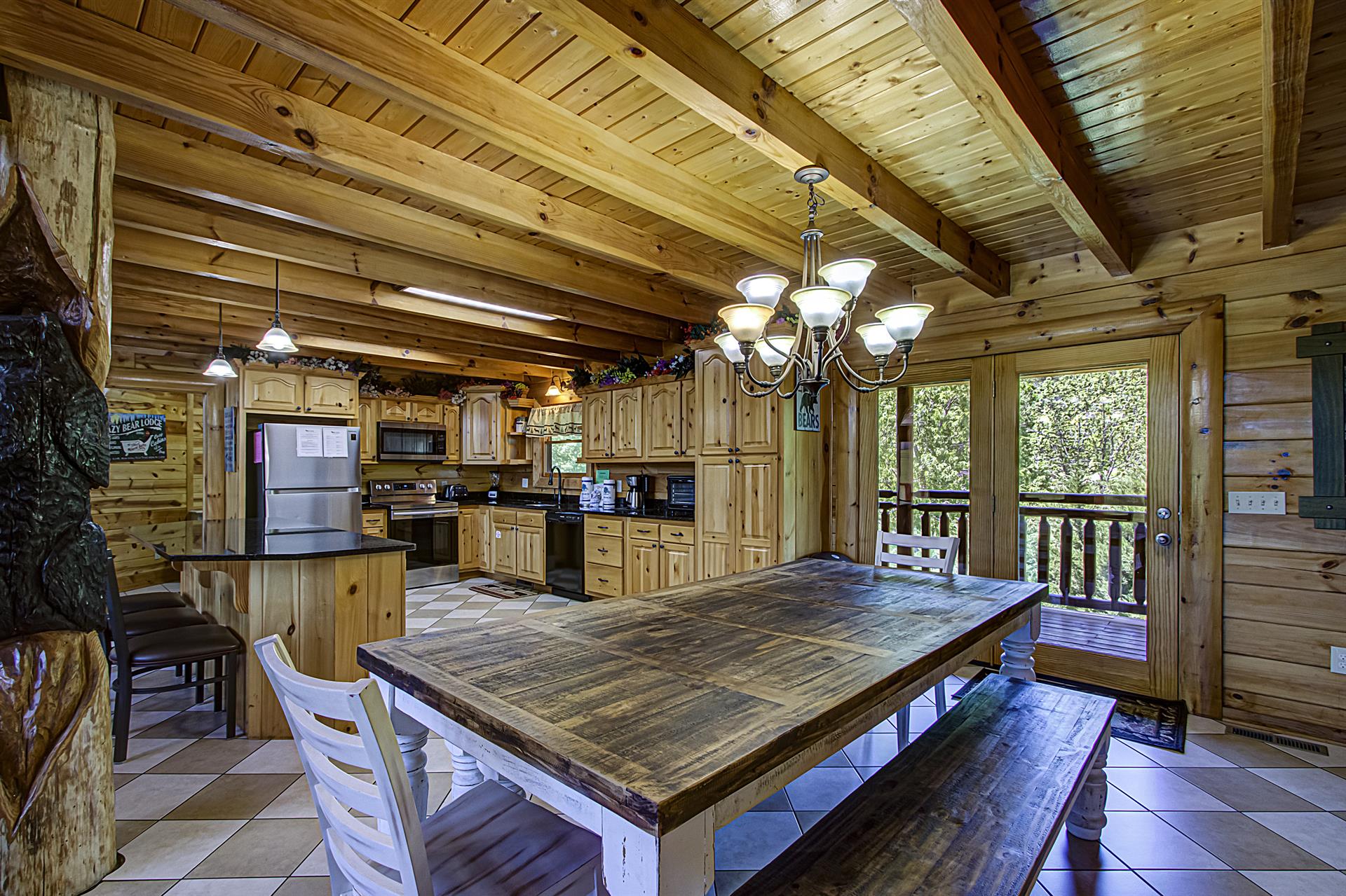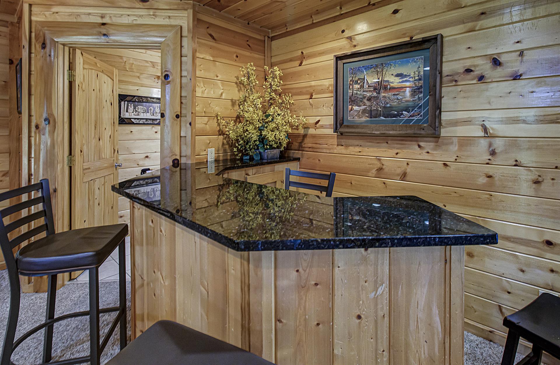 Your Dream vacation starts here with this beautifully decorated, spacious 4 bedroom cabin with all King size Log beds, offering 4 full bathrooms and 2 half bathrooms. Always Dreaming is exactly what you've been dreaming of when you imagine a Smoky Mountain Vacation. Offering a ramp-style entry way for easy access. Oversized for wheelchair accessibility. This luxury cabin is just minutes from Downtown Pigeon Forge and Dollywood. This cabin is furnished with spectacular furniture and all the amenities including HD Cable, High Speed Internet with WIFI. Enjoy the spacious luxury seating in the living area on the main floor with a huge Flat screen TV that sits above a beautiful contemporary indoor fireplace with color changing flames for year-round enjoyment and a sleeper sofa. Features a full kitchen with stainless steel appliances and granite counter tops with an Eat in Bar for extra seating that is adjacent to the Dining Room with a beautiful wood table and chairs. There are also 2 King bedrooms with ensuites on the main floor and a large laundry room with folding table, iron, and ironing board provided. Upstairs you can enjoy the game room equipped with a Pool Table and Bar and for your enjoyment! A futon is located in the game room with a half bath. Two King suites are located on the second floor too, one also has a futon. You may also enjoy the outdoor private covered hot tub and a spacious deck area with Rocking Chairs, a Park Grill located on the concrete outdoor patio area with seating for up to 12 guests, and a fire pit for your enjoyment. Let your Dream Begin!. Must be 25 years old to rent.