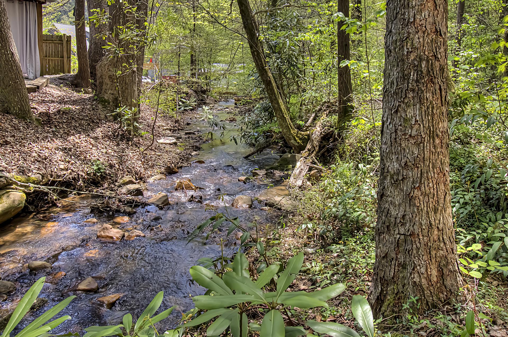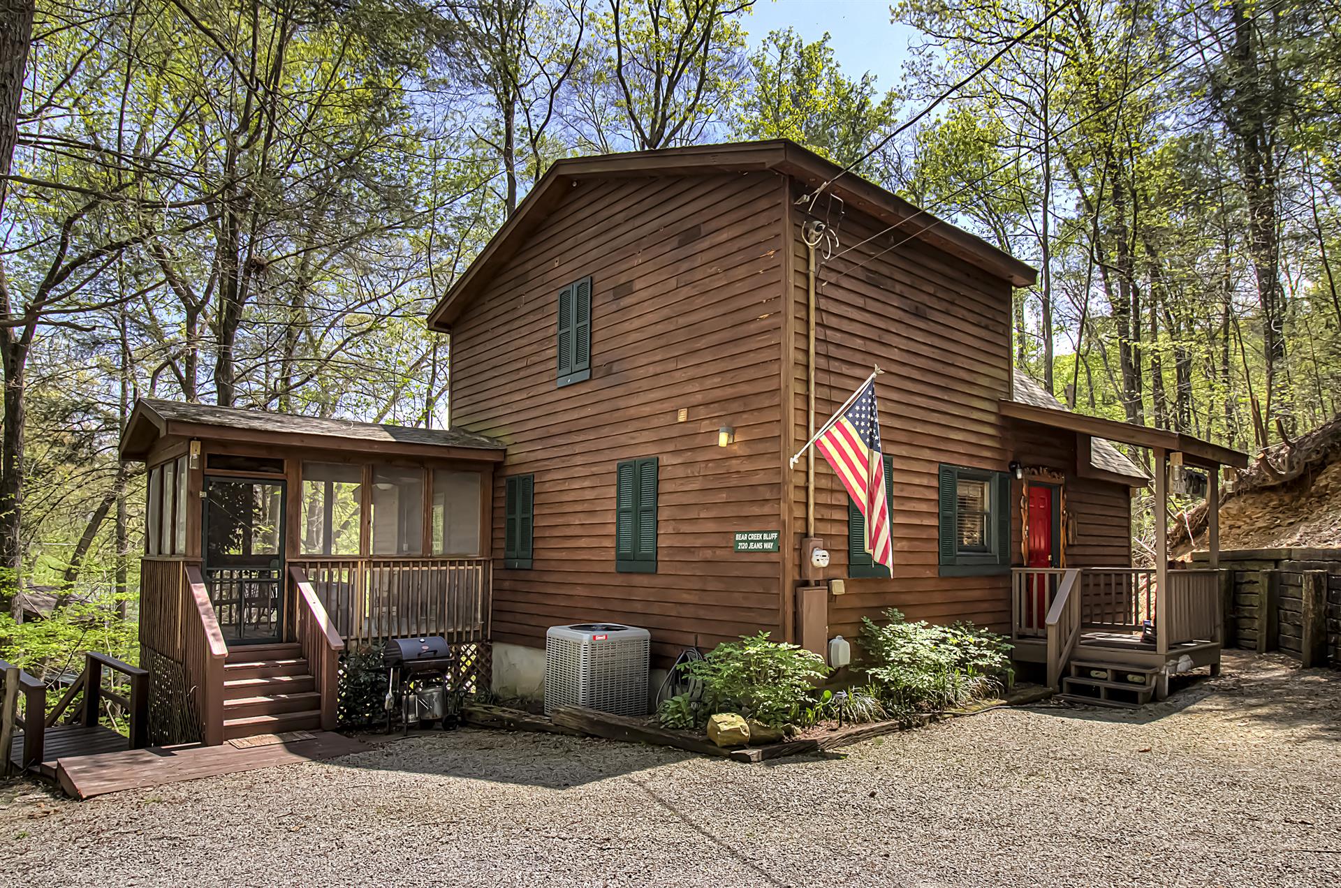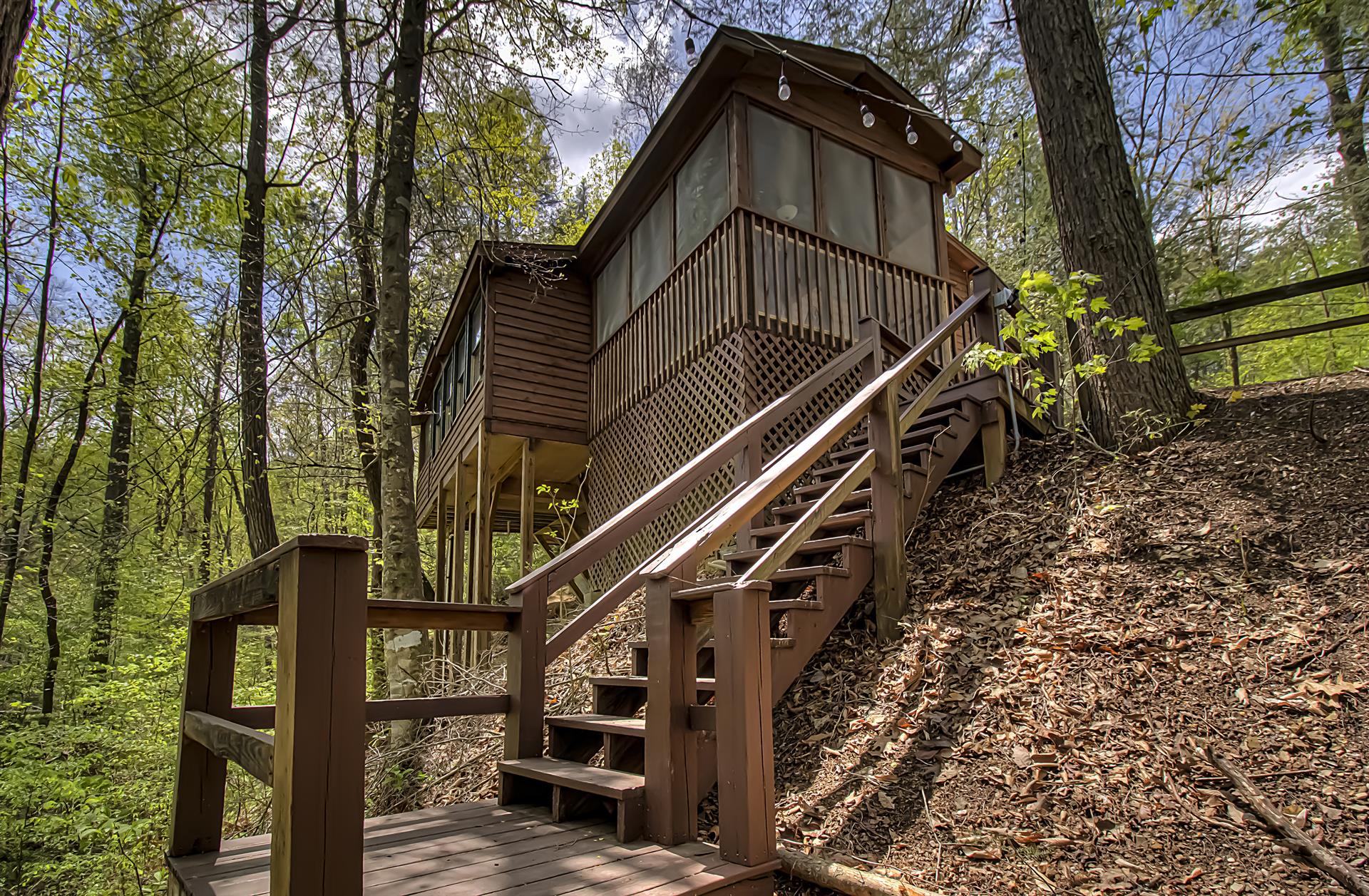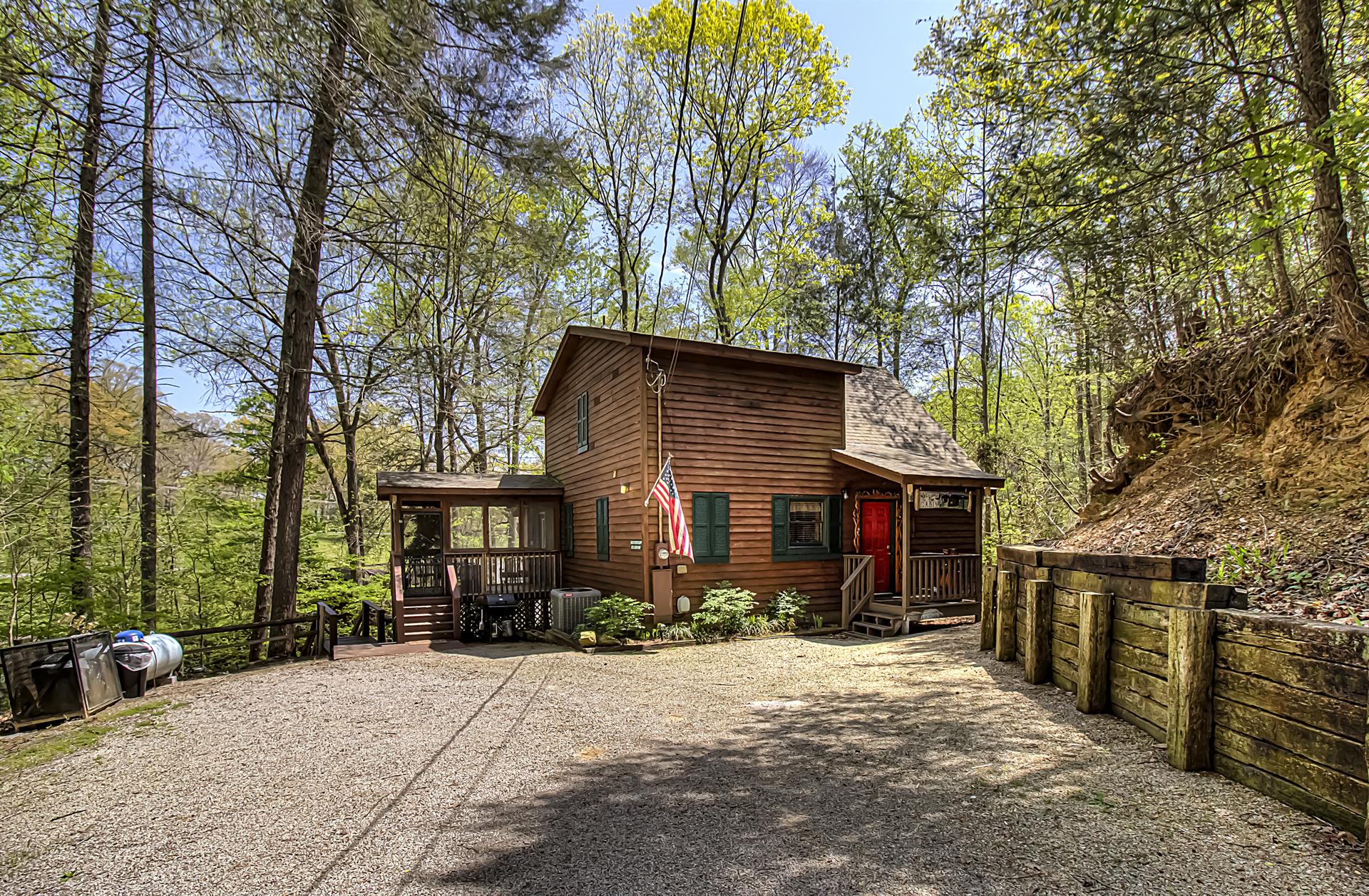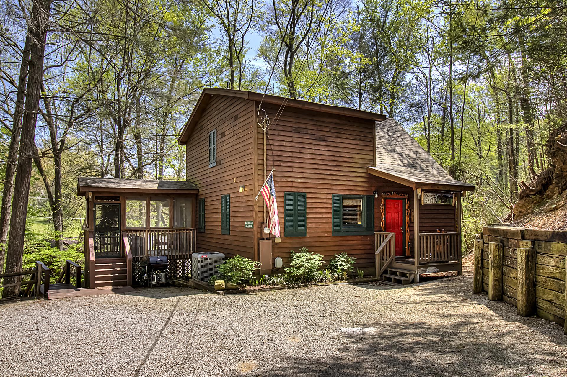 When you're ready to vacation in the Great Smokies, Bear Creek Ridge is your cabin! Located off of beautiful Wears Valley in Pigeon Forge, Bear Creek Ridge is a 2 bedroom - 2 bath log cabin in semi-private setting. Along with WIFI, Jacuzzi tub, and pool table. This cute two bedroom 2 bath cabin has it all with an enclosed Hot Tub and comfortable amenities. Beautiful NEW Firepit area to enjoy the relaxing sounds of the mountain brook and watch the stars. You will love sitting outside on the screened in deck in the comfy chairs - or use the stair access to a small creek below - or enjoy the big, bubbling hot tub - just soaking in the sights and sounds of nature surrounding you.