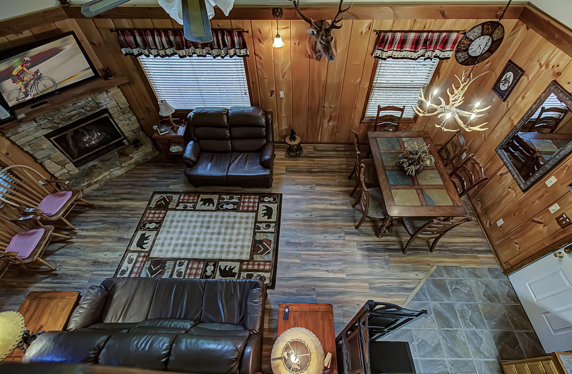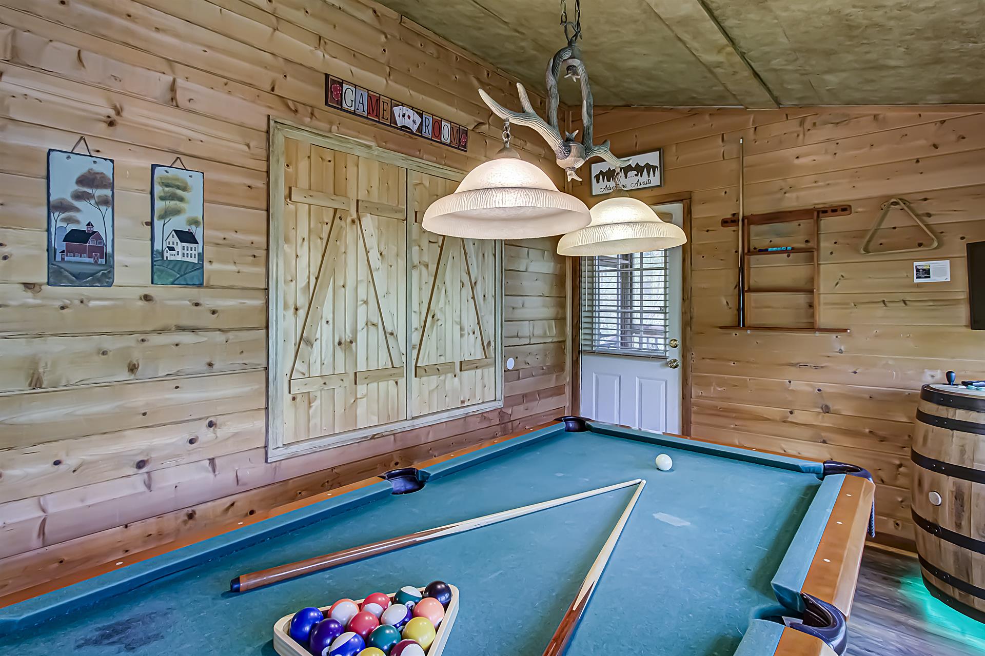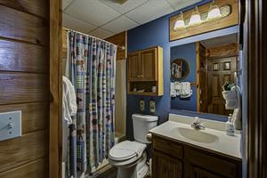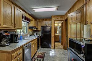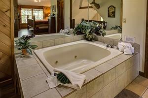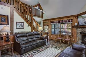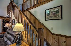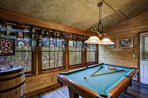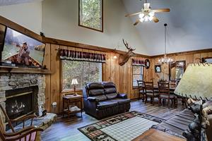 If you need little or no steps, this is the cabin for you. You can access the front porch with just three small steps up to the deck. The main of the house contains a kitchen and dining room / living room area with gas fireplace, flat screen TV with Xfinity cable service and sleeper sofa. Also on this floor is a Queen size bedroom with flat screen TV, Xfinity cable service and access to a full bathroom with a tub/shower combo. There is a separate game room off of the living area that houses the pool table as well as access to two screened in decks, one with a hot tub. Just off the kitchen is a washer and dryer for your convenience as well. Need a second bedroom? Upstairs loft area has a King size bed suite with flat screen TV, Xfinity cable service and large jacuzzi tub, as well as a full bathroom with tub/shower combo.