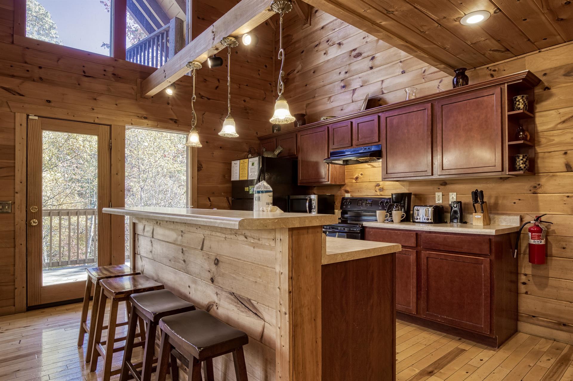 Fort Knox is located in between Pigeon Forge and Gatlinburg just minutes from all the excitement of the Great Smoky Mountains attractions! The cabin and surrounding area are very peaceful. You will enter on the second level and discover a cozy living area with all leather furniture and a recliner that sits next to the electric fireplace. Above the mantel sits a flat-screen TV with a blue ray DVD player. With the open floor plan with warm tones, you will find the nearby kitchen with sleek appliances and ample counter space to prepare tasty dinners for your family and friends. With a table that offers seating for up to four and a breakfast bar with three bar stools.