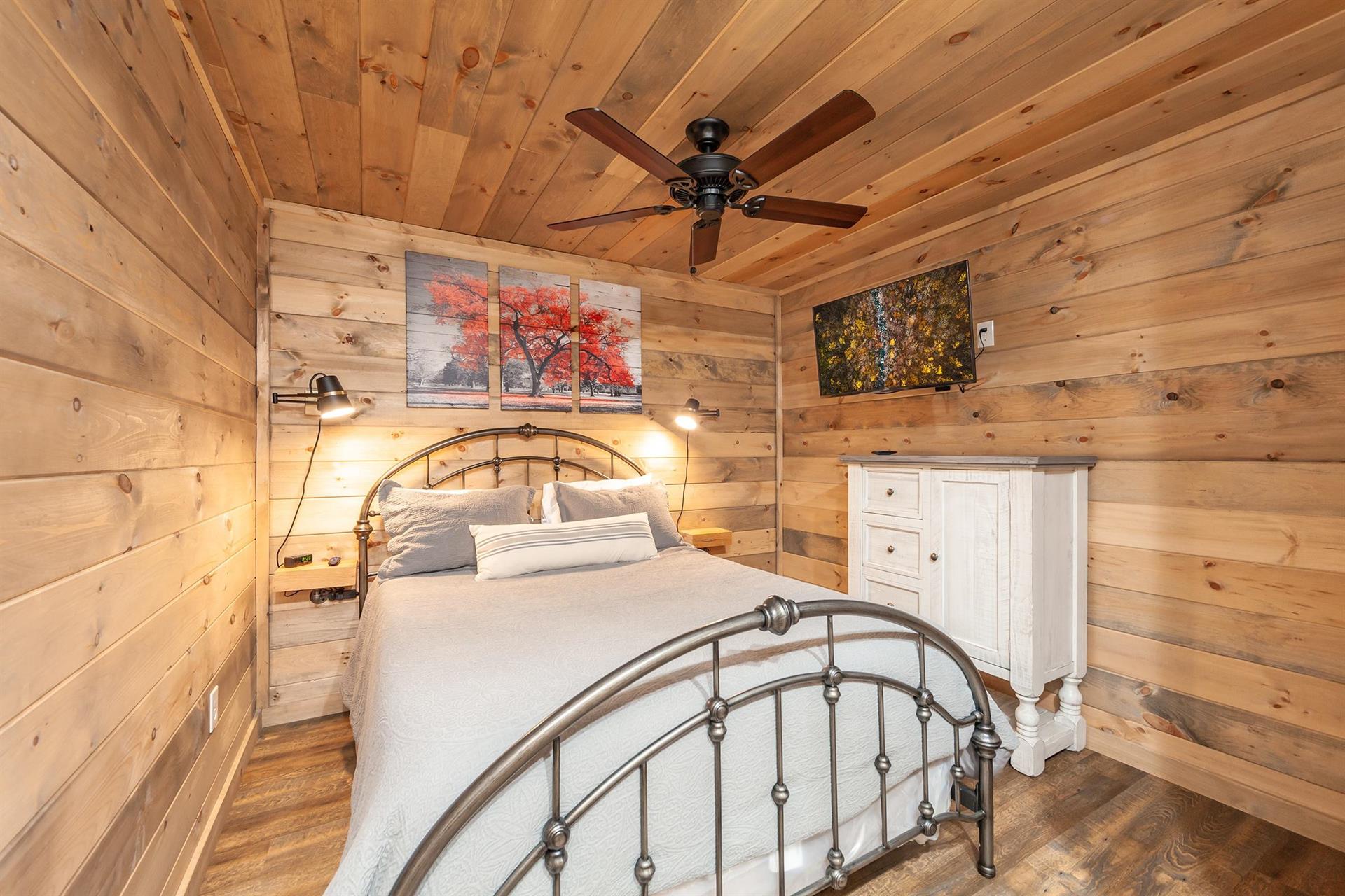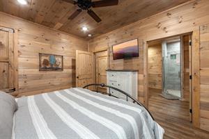 with a flat screen TV. The spacious bathroom is adjoining the queen bedroom.