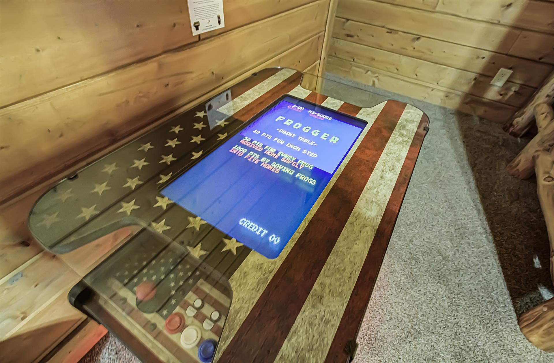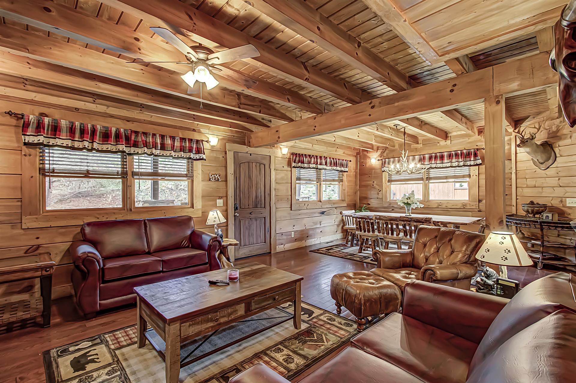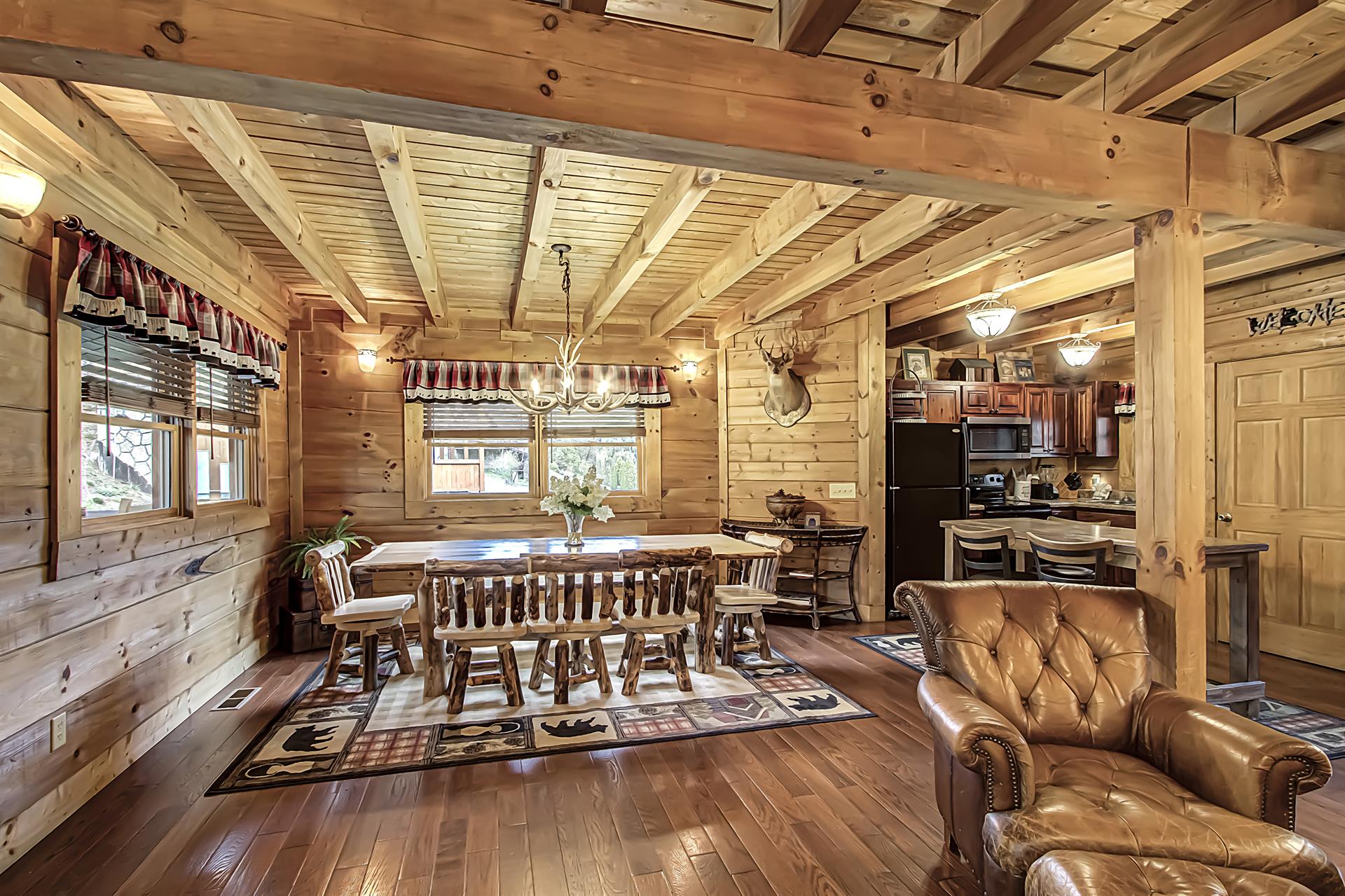 As you enter this beautifully designed antique barn cabin, you'll be greeted by a large master suite on the third floor, featuring a custom log king bed, in-room jacuzzi, sleeper sofa, indoor sitting area with television, and two private covered balconies where you can take in the fresh mountain air and breathtaking views. The second bedroom, located on the lower level, has two Queen Over Queen Custom Log Bunk Beds, a sitting area with an 85" HD television, pool table, and a multi-cade arcade game, making it great for families or groups of friends.