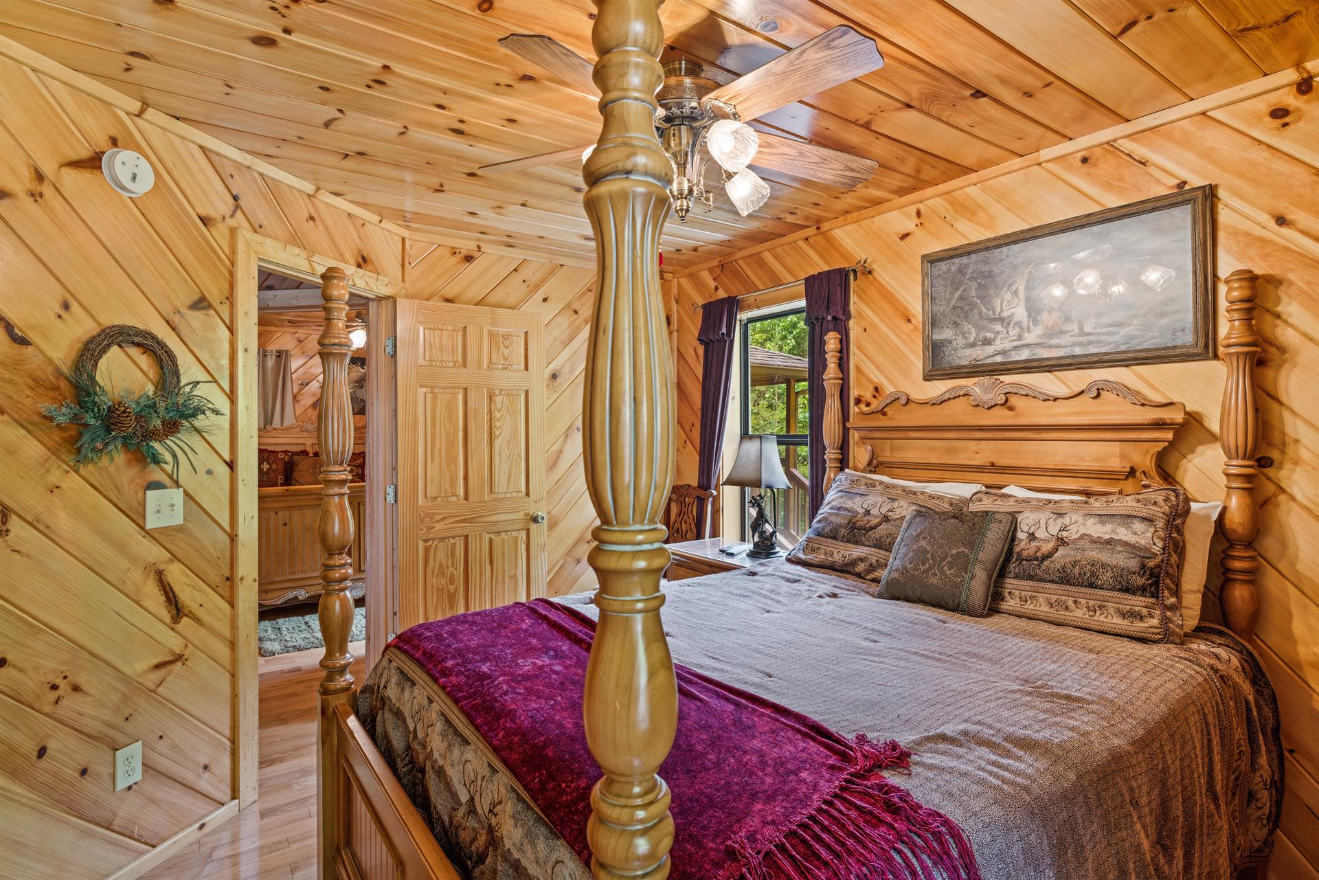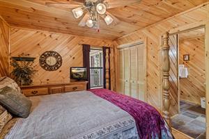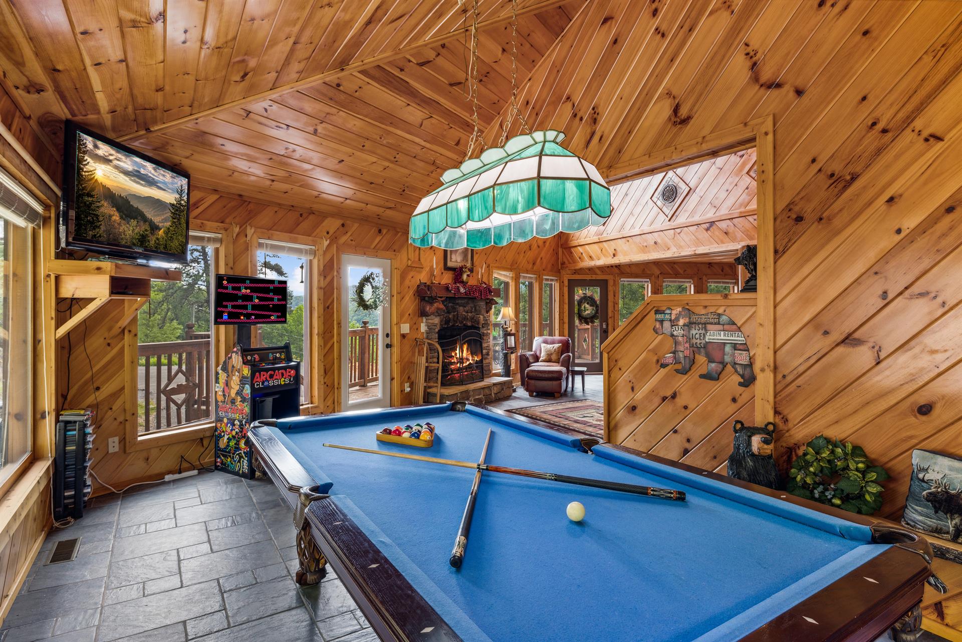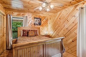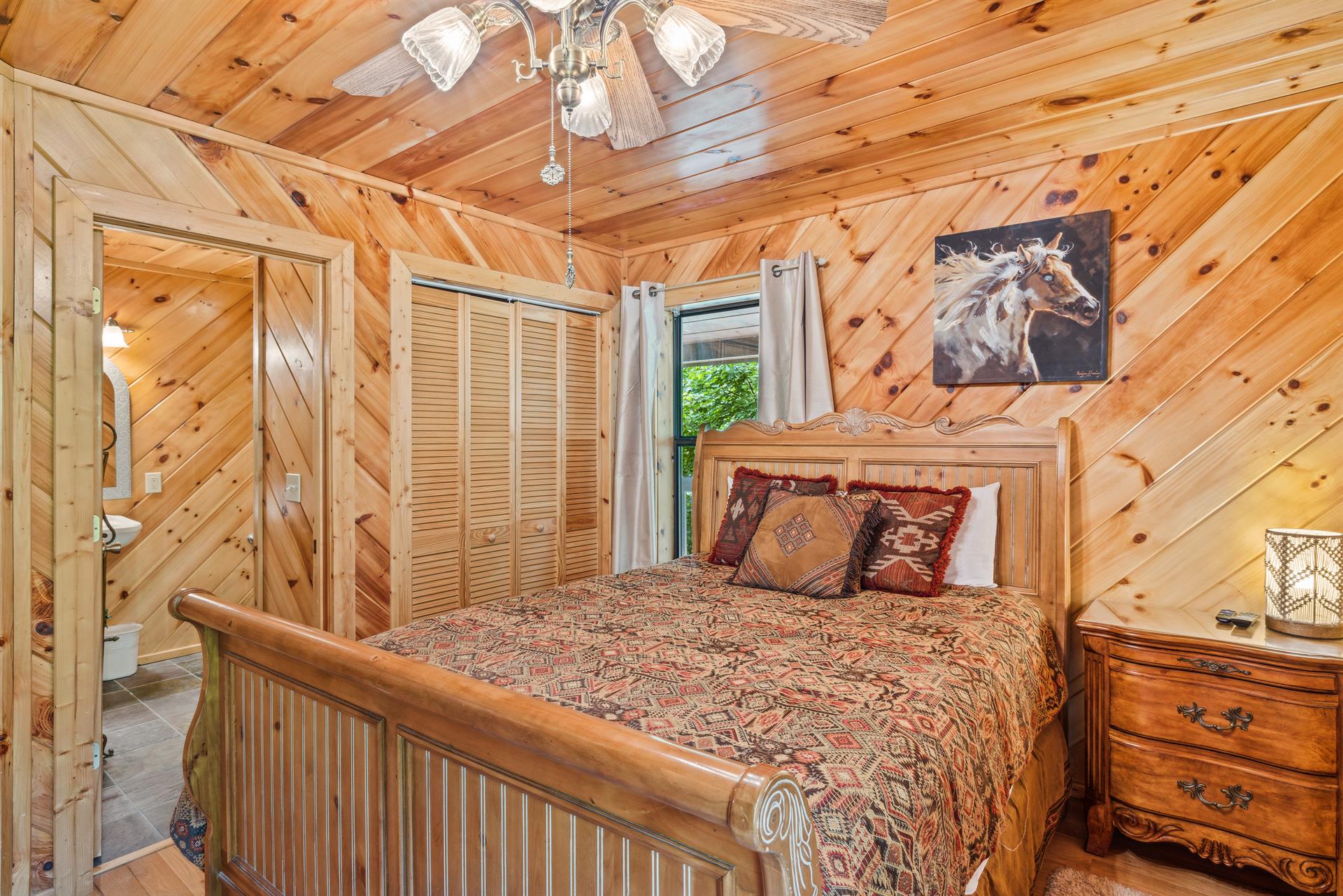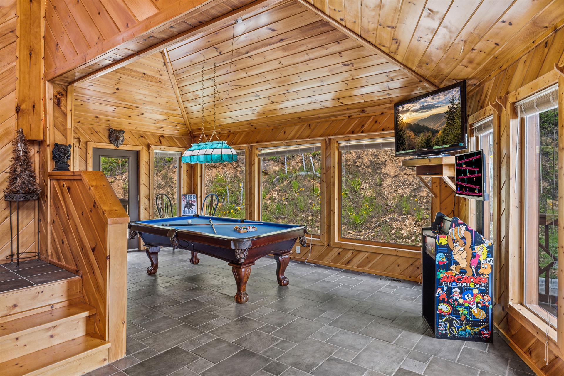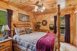 On the main level, there are two bedrooms, each with its own in-suite bathroom, flat screen TV, and comfortable beds - a poster bed in one and a sleigh bed in the other. There is also a game room with a pool table located just off the living room area, offering additional space for fun and entertainment! All the TVs in the cabin have brand new Roku on them, so you can access all your favorite shows with just your password.