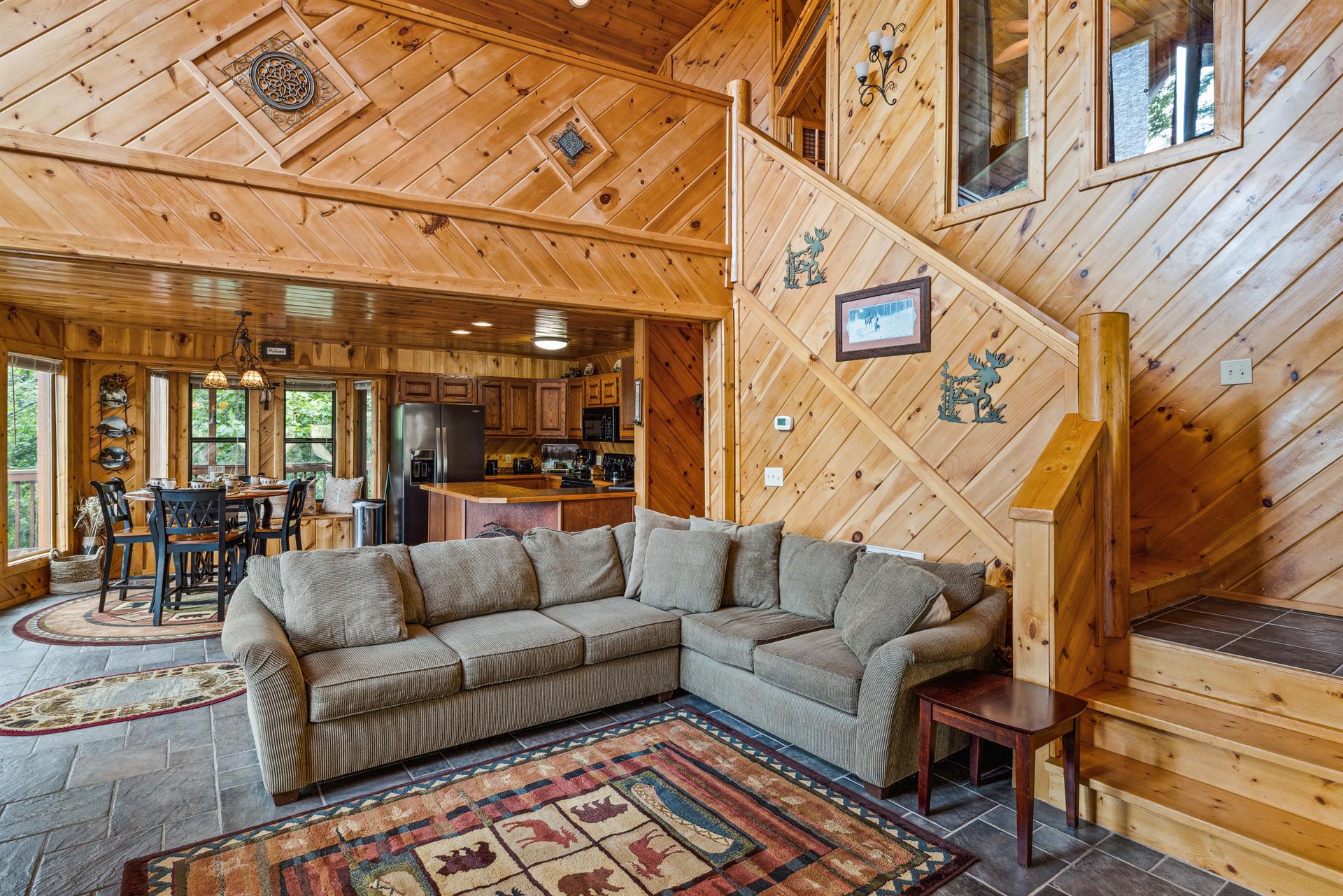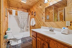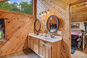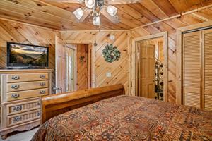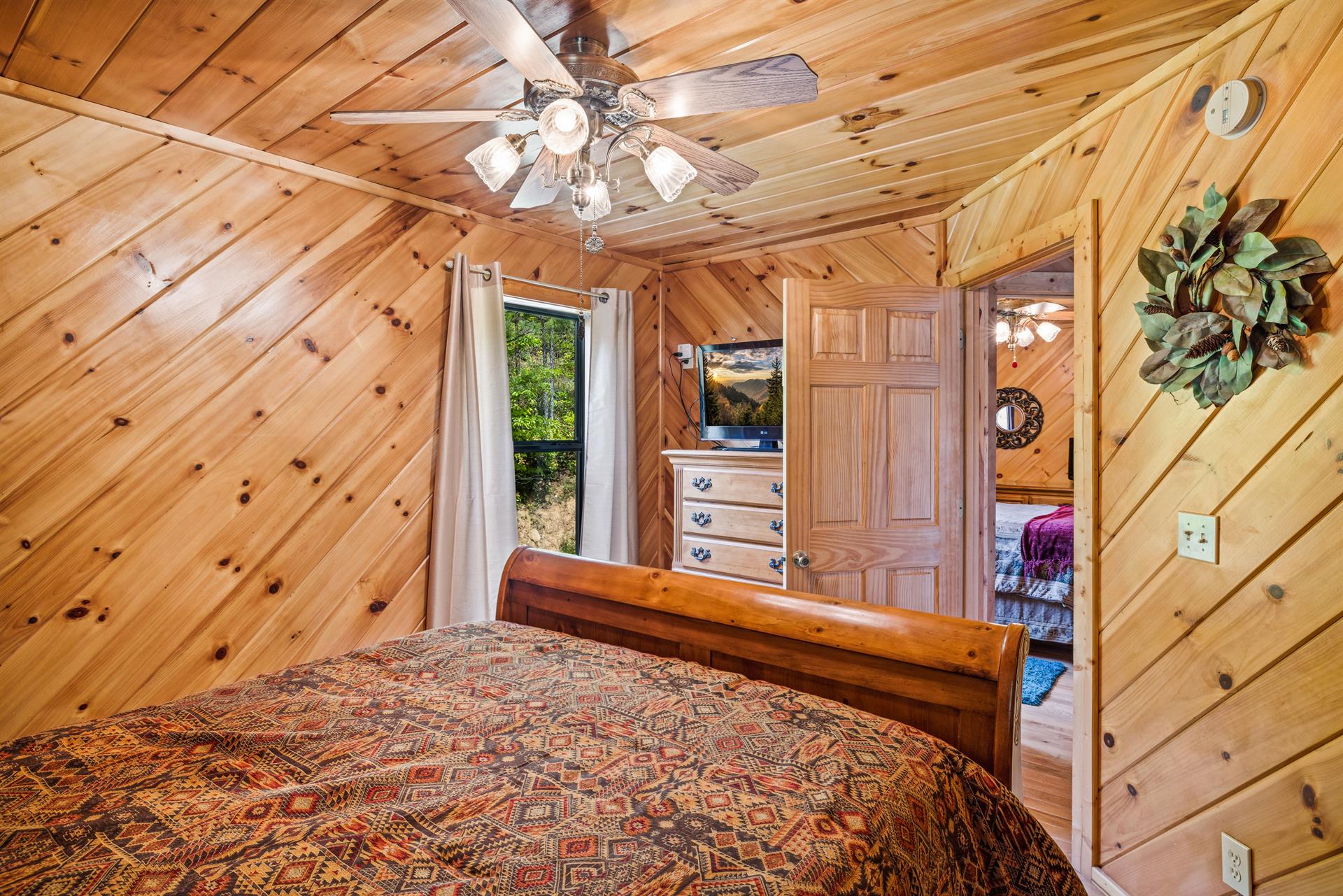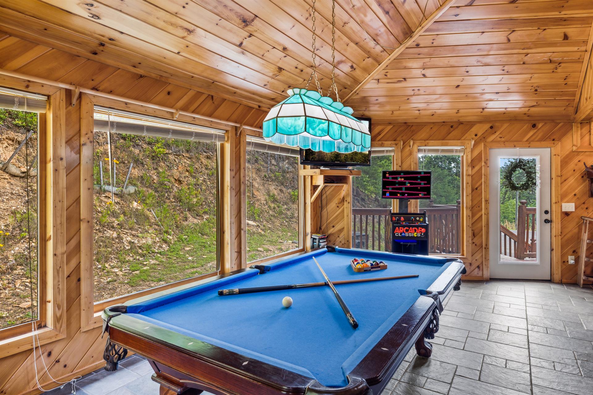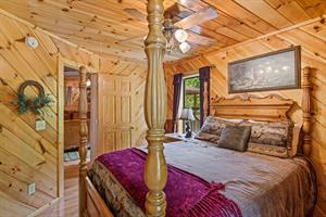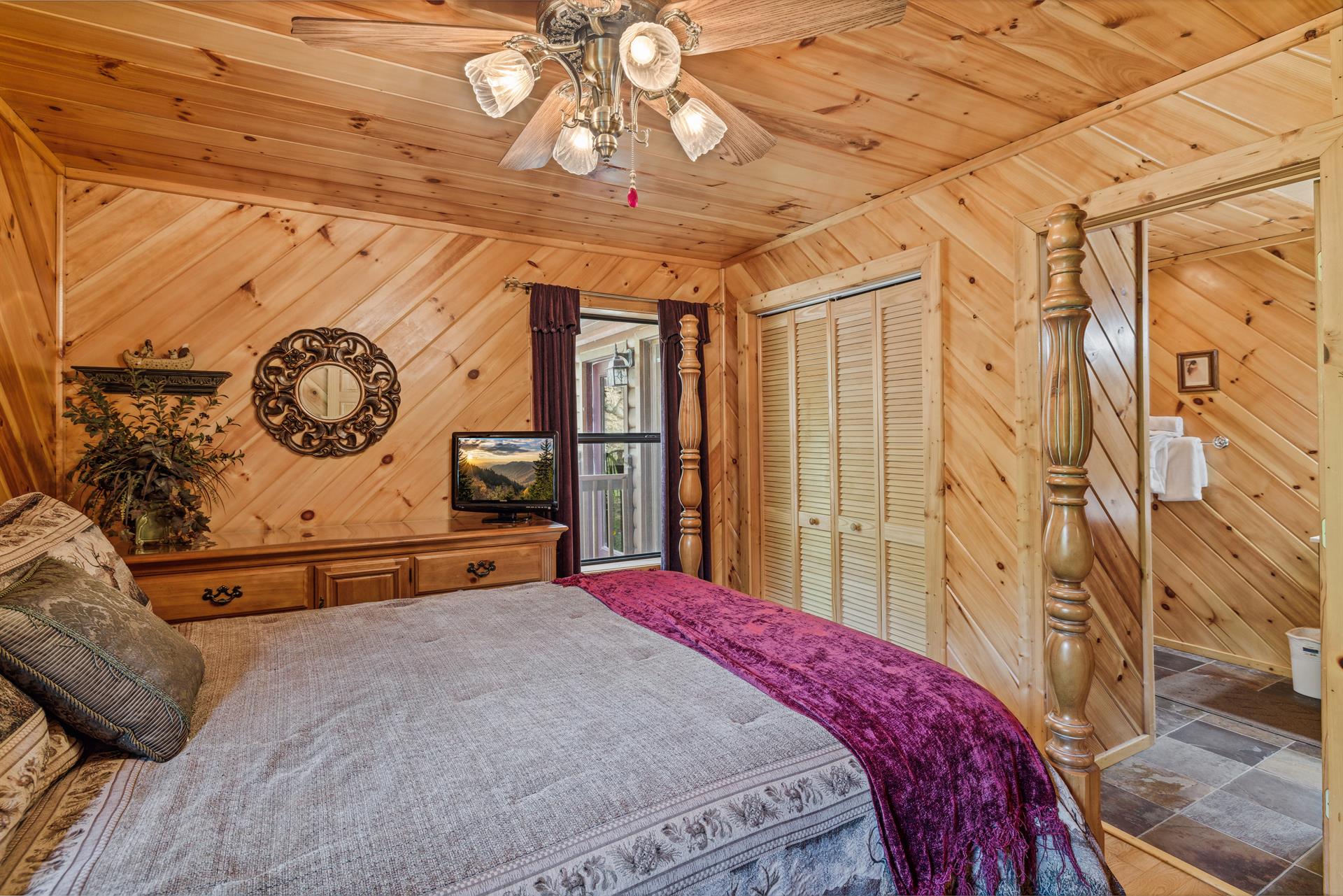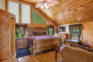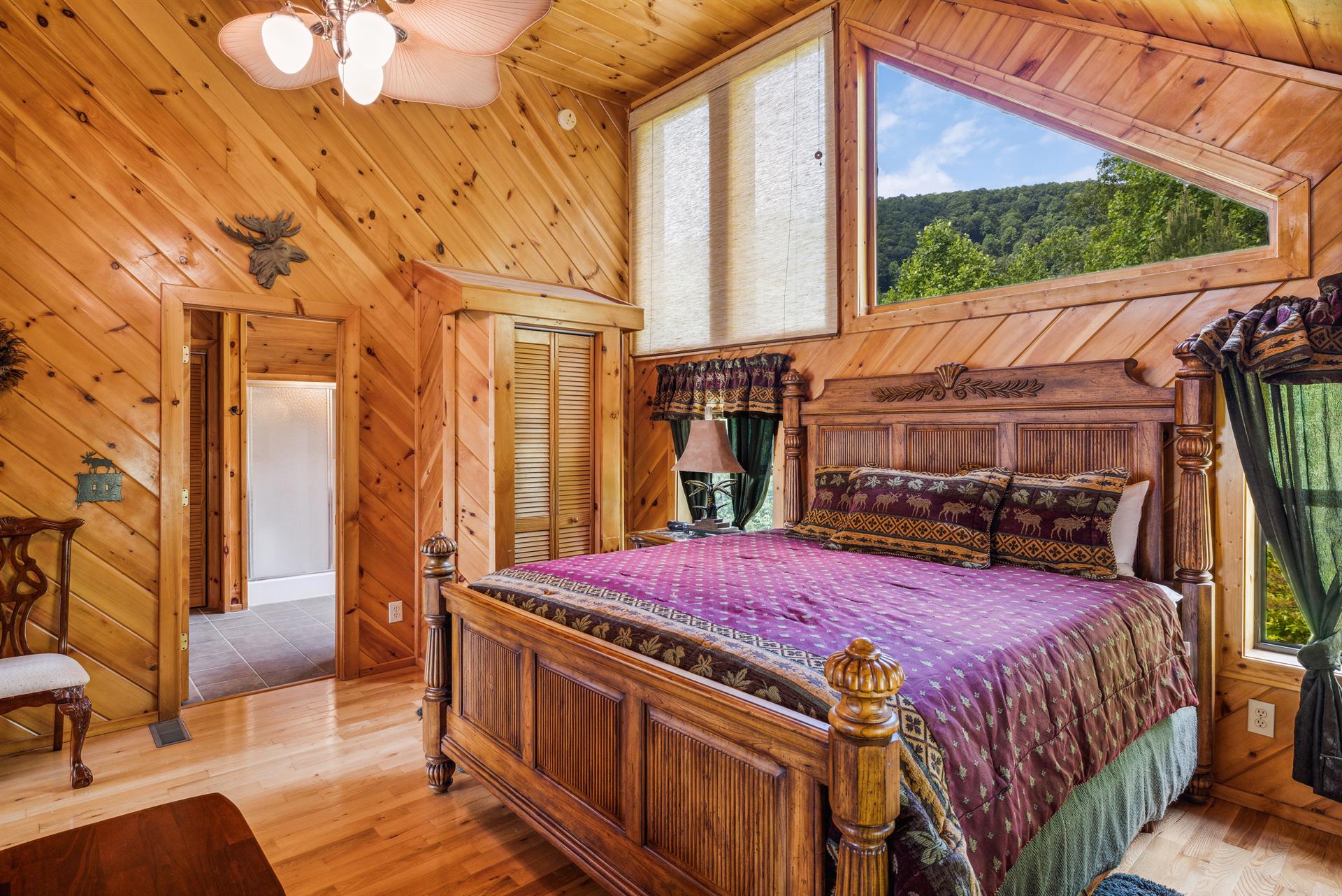 On the main level, there are two bedrooms, each with its own in-suite bathroom, flat screen TV, and comfortable beds - a poster bed in one and a sleigh bed in the other. There is also a game room with a pool table located just off the living room area, offering additional space for fun and entertainment! All the TVs in the cabin have brand new Roku on them, so you can access all your favorite shows with just your password.