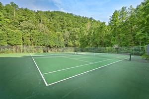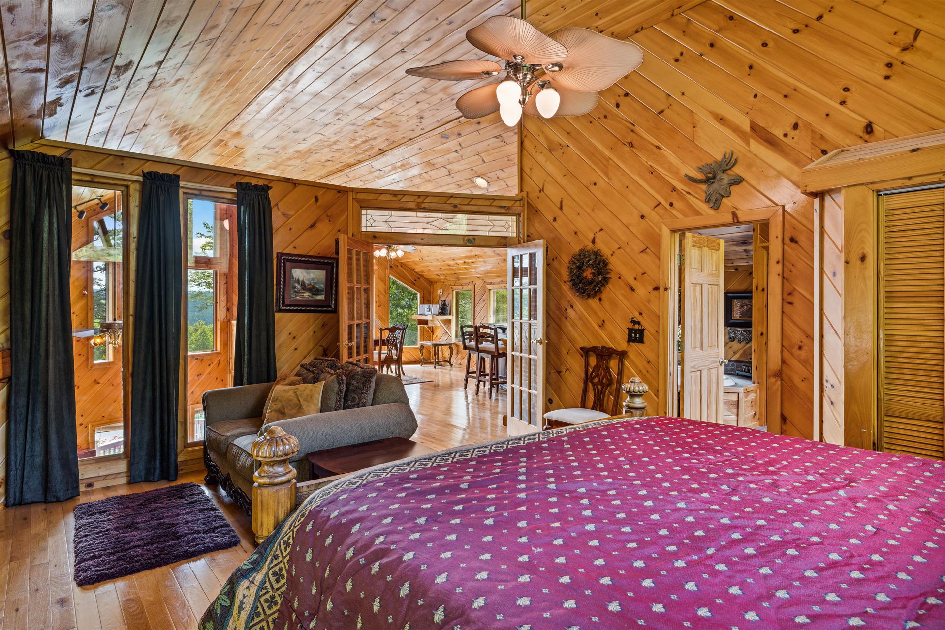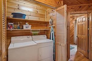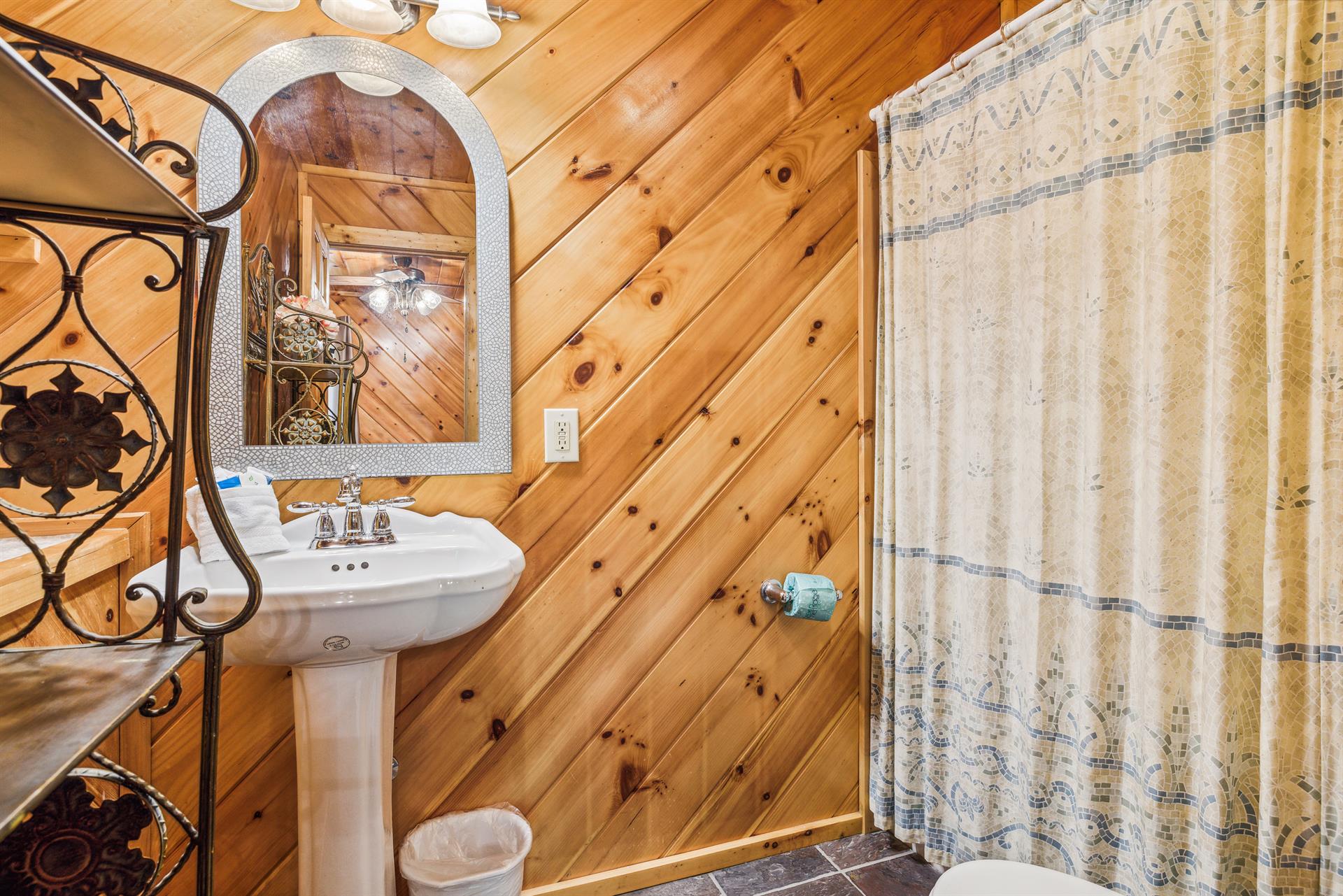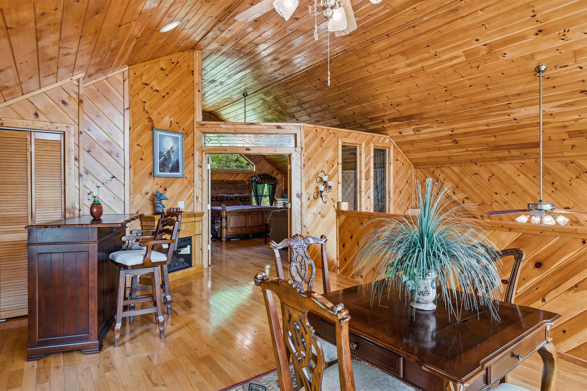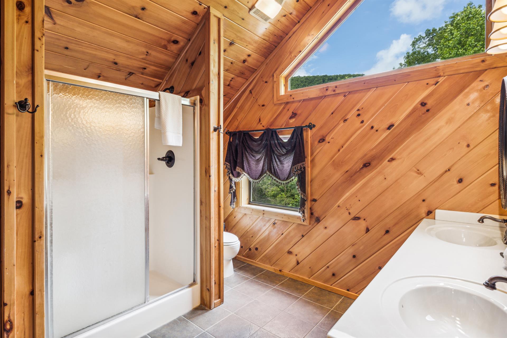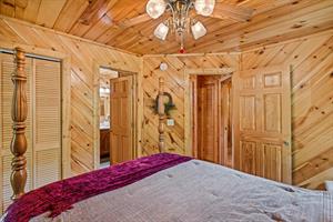 On the main level, there are two bedrooms, each with its own in-suite bathroom, flat screen TV, and comfortable beds - a poster bed in one and a sleigh bed in the other. There is also a game room with a pool table located just off the living room area, offering additional space for fun and entertainment! All the TVs in the cabin have brand new Roku on them, so you can access all your favorite shows with just your password.