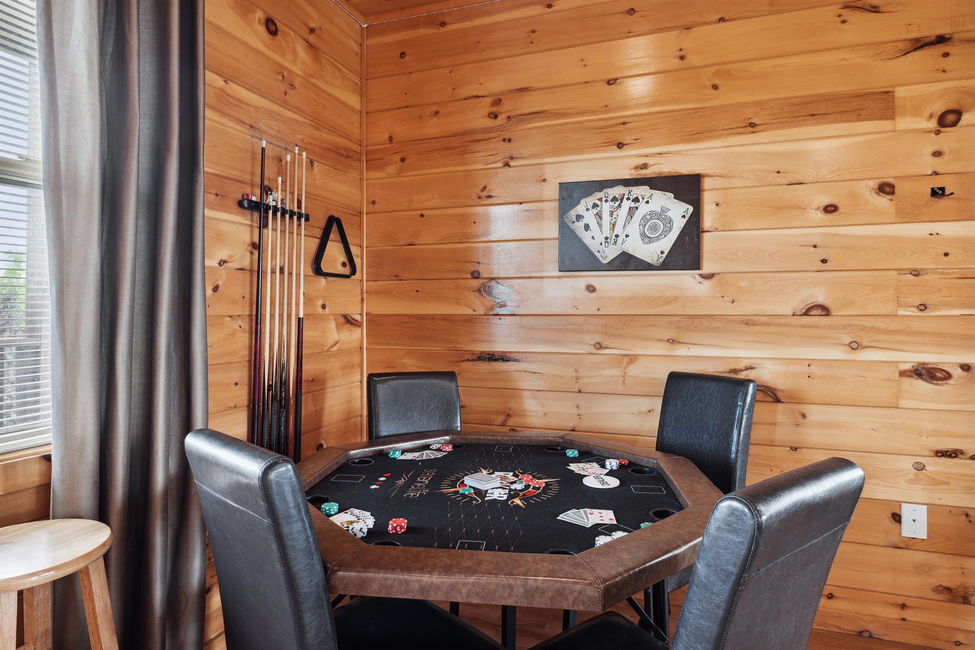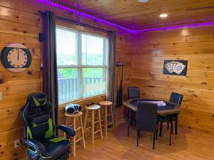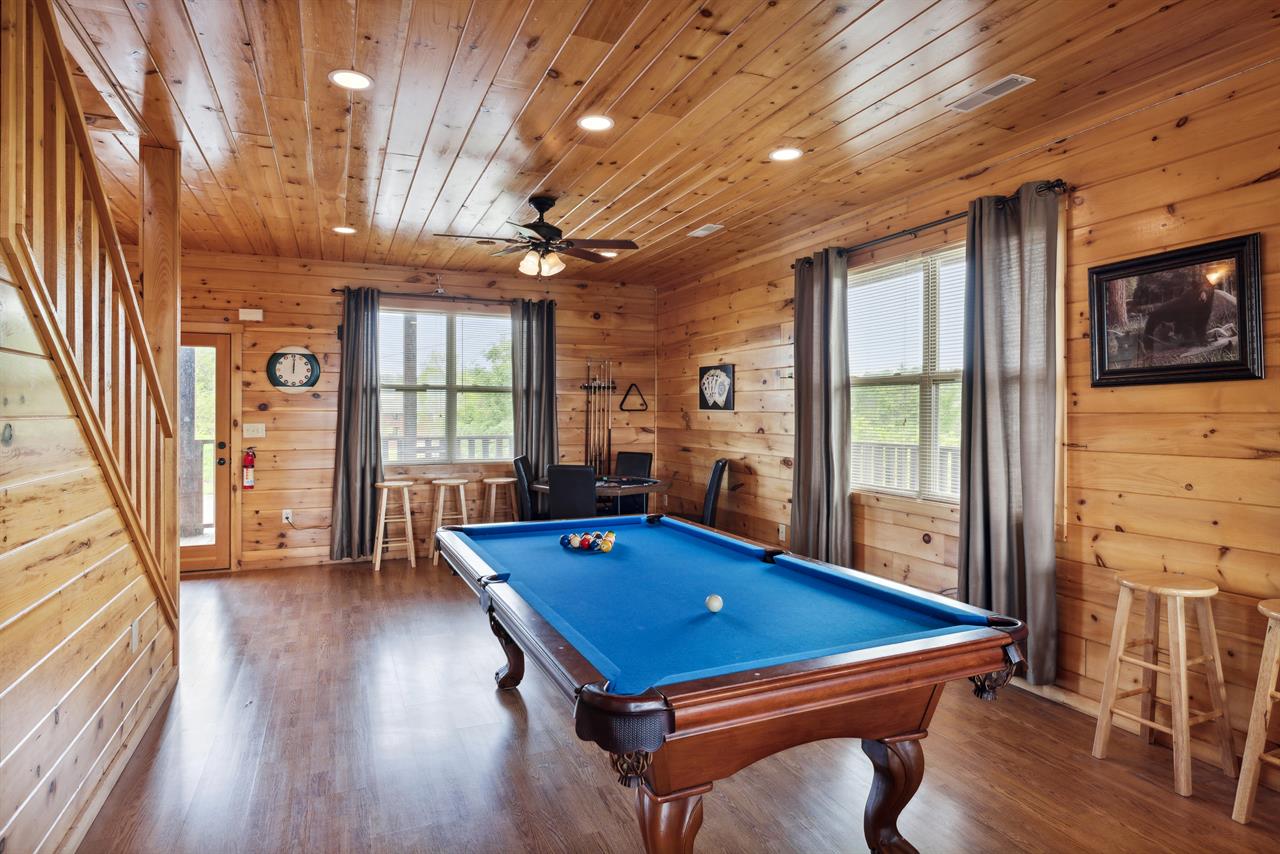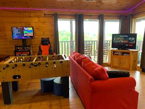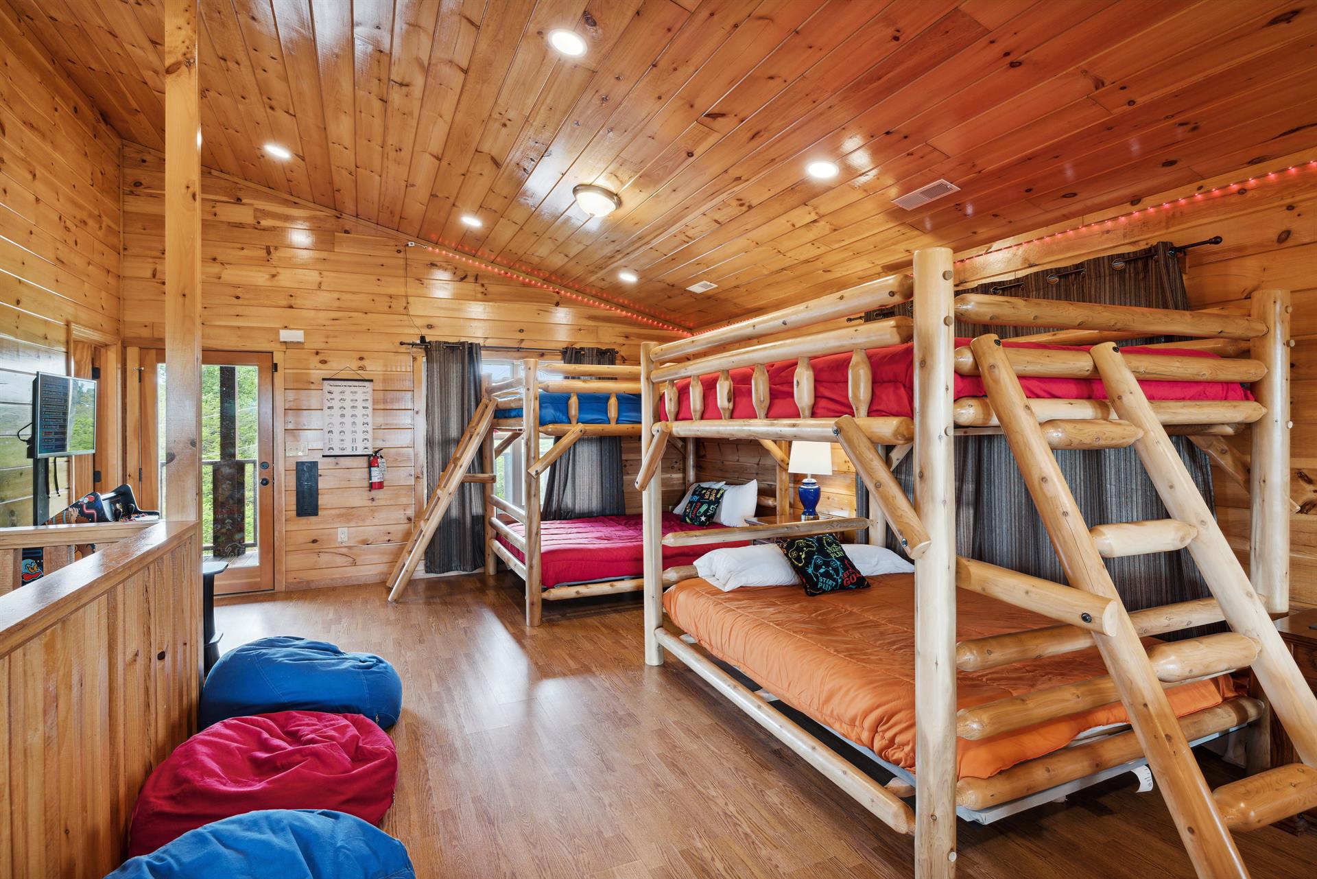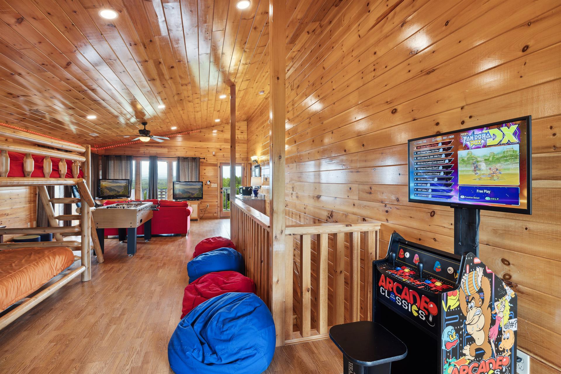 The cabin's three stories each feature two bedrooms with their own private bathroom, a comfortable living area with a sleeper sofa and TV, and a game room for endless entertainment. The main level of the cabin includes a fully equipped kitchen and dining area, perfect for preparing and sharing delicious meals with loved ones. The second level has a pool table, poker table, living area with large TV. The 3 floor is all about gaming! Brightly colored with 2 gaming chairs and TV's, the kids will never be bored. There are 2 queen over queen bunk beds in the game area, one king bedroom and one bedroom with queen over queen bunks and private baths. This cabin is professionally decorated with kids in mind! Enjoy the video arcade games and let the adults enjoy the poker table or hot tub.