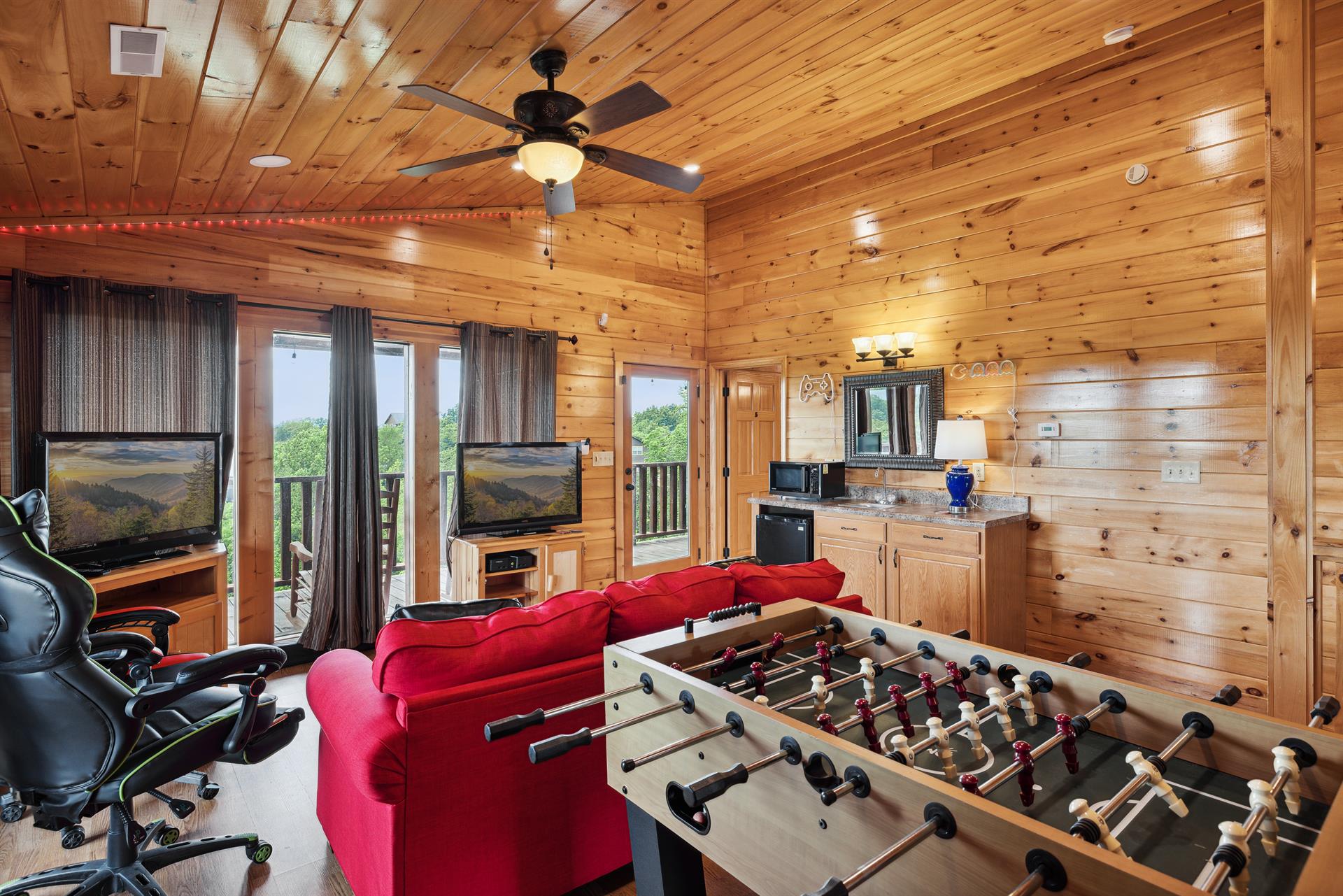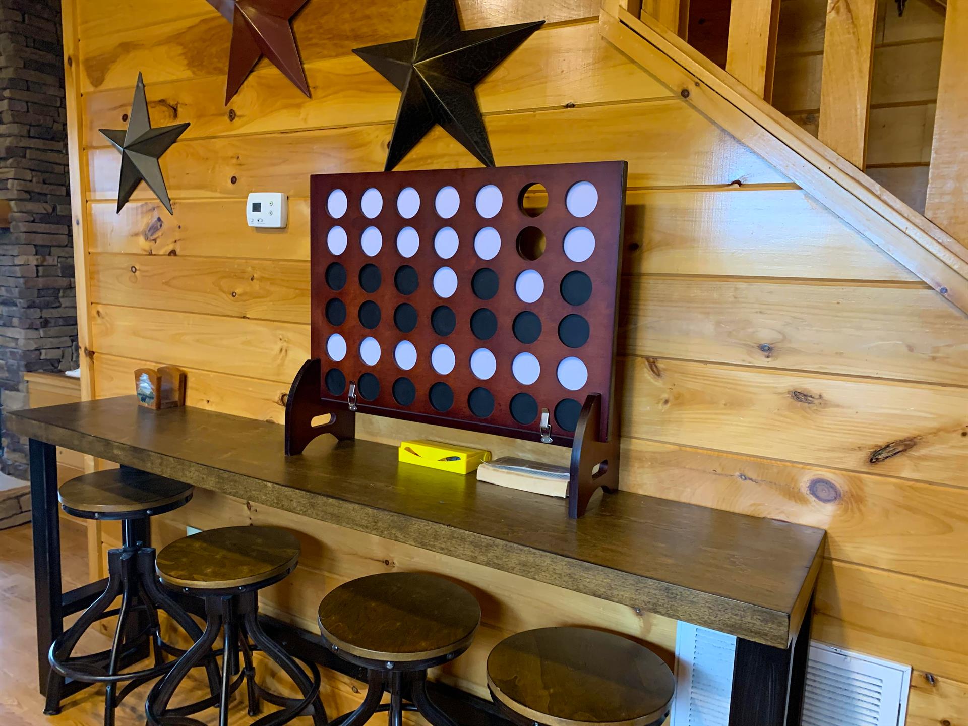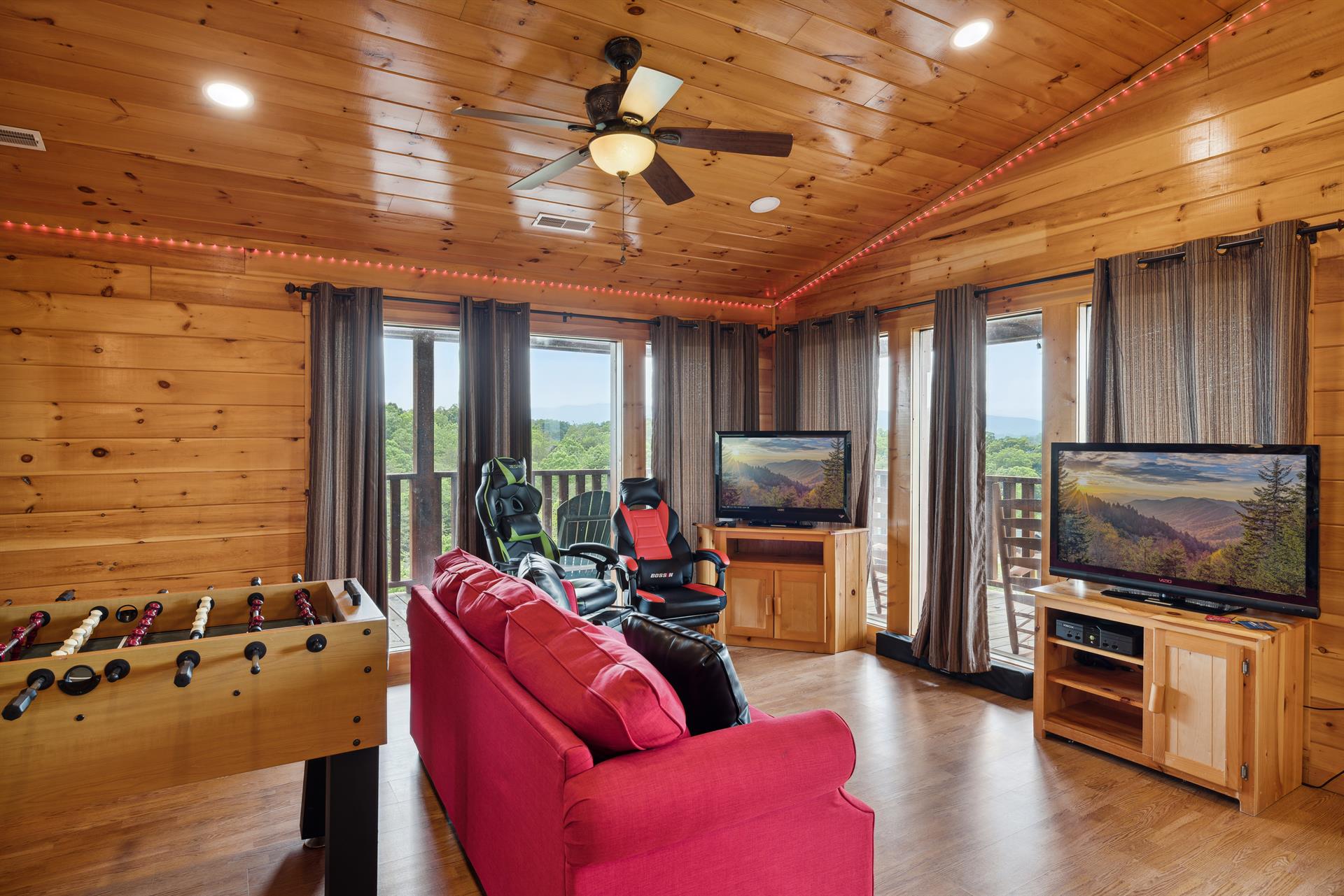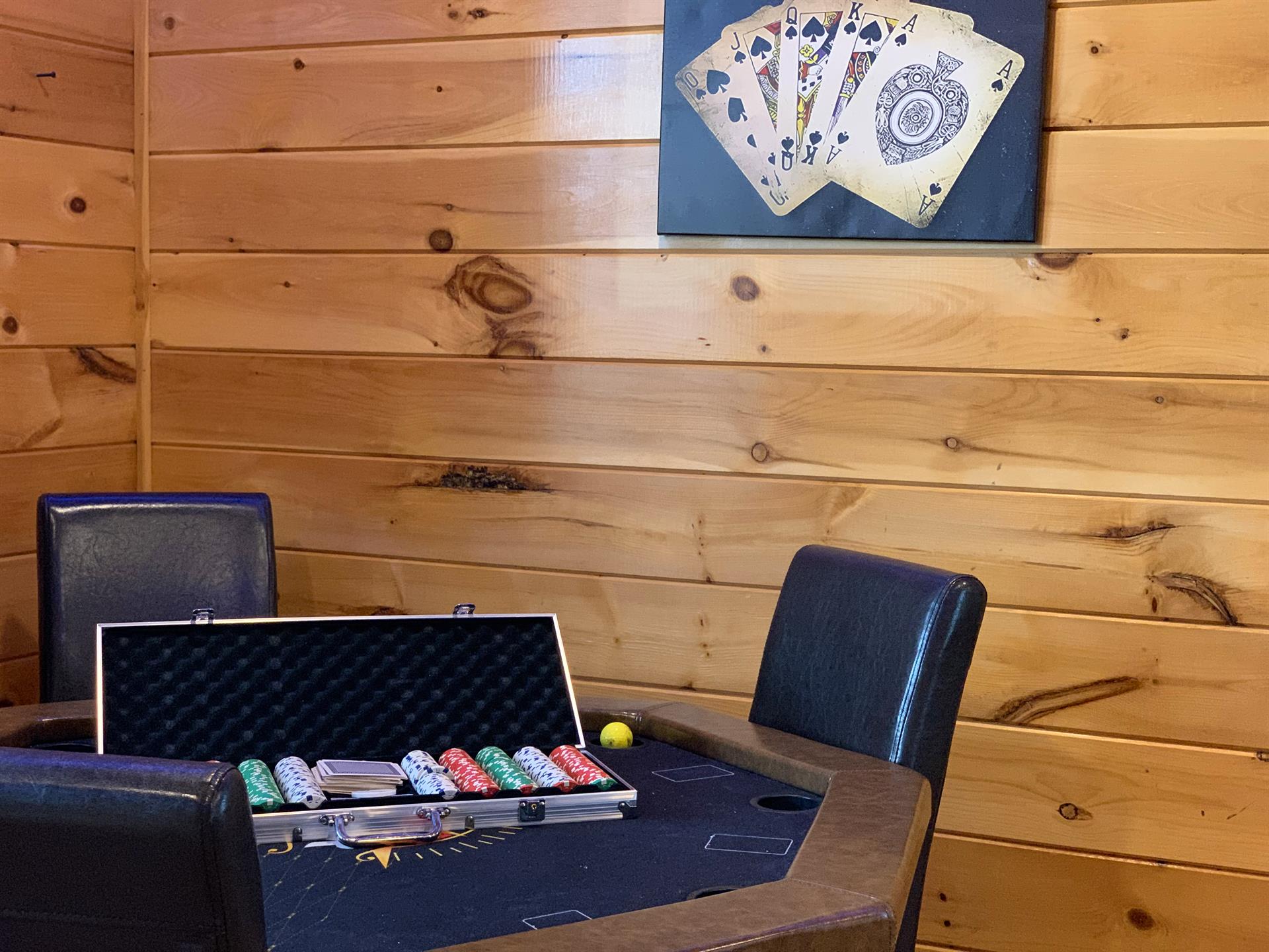 The cabin's three stories each feature two bedrooms with their own private bathroom, a comfortable living area with a sleeper sofa and TV, and a game room for endless entertainment. The main level of the cabin includes a fully equipped kitchen and dining area, perfect for preparing and sharing delicious meals with loved ones. The second level has a pool table, poker table, living area with large TV. The 3 floor is all about gaming! Brightly colored with 2 gaming chairs and TV's, the kids will never be bored. There are 2 queen over queen bunk beds in the game area, one king bedroom and one bedroom with queen over queen bunks and private baths. This cabin is professionally decorated with kids in mind! Enjoy the video arcade games and let the adults enjoy the poker table or hot tub.