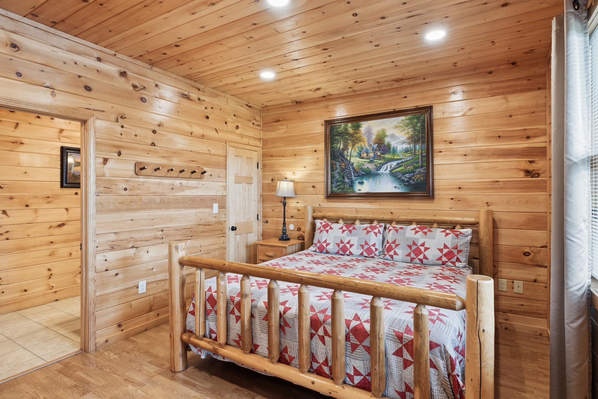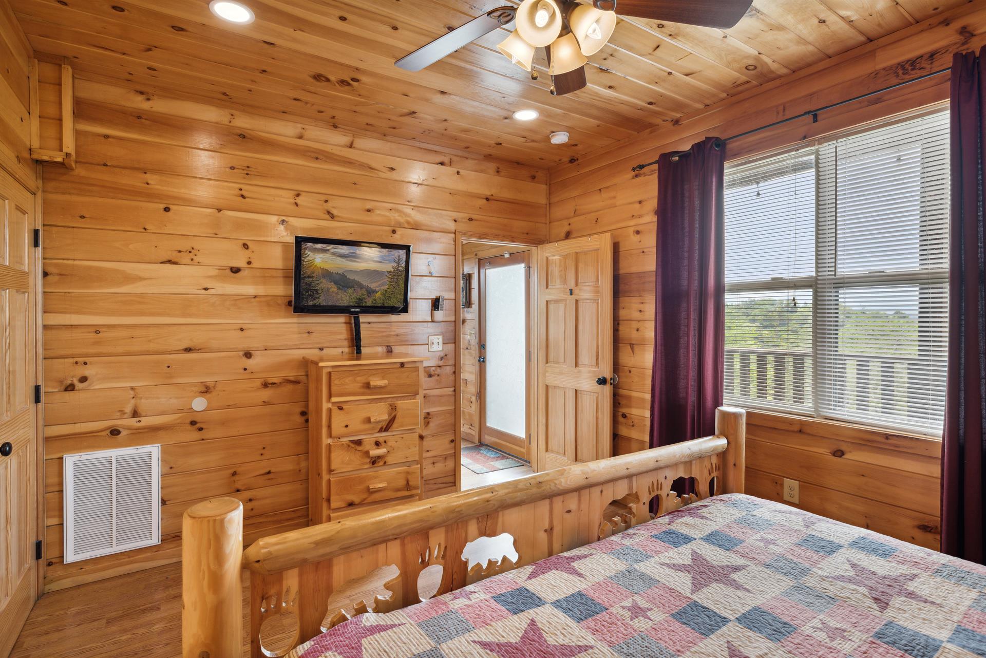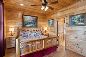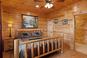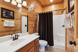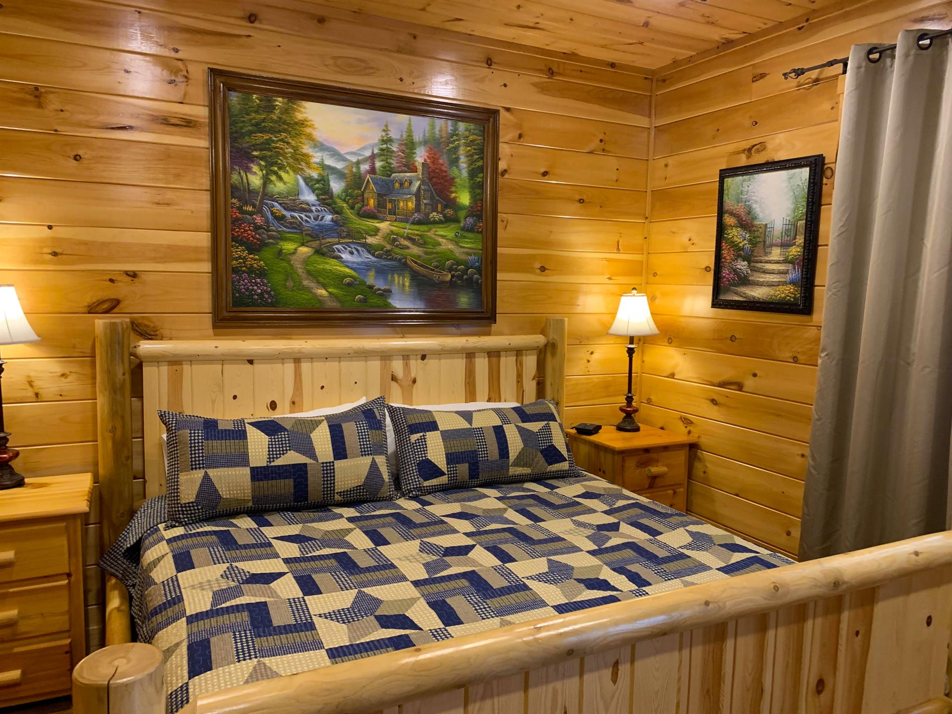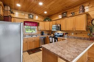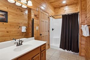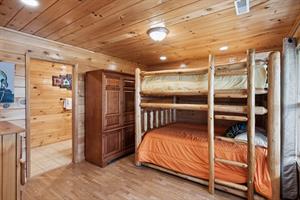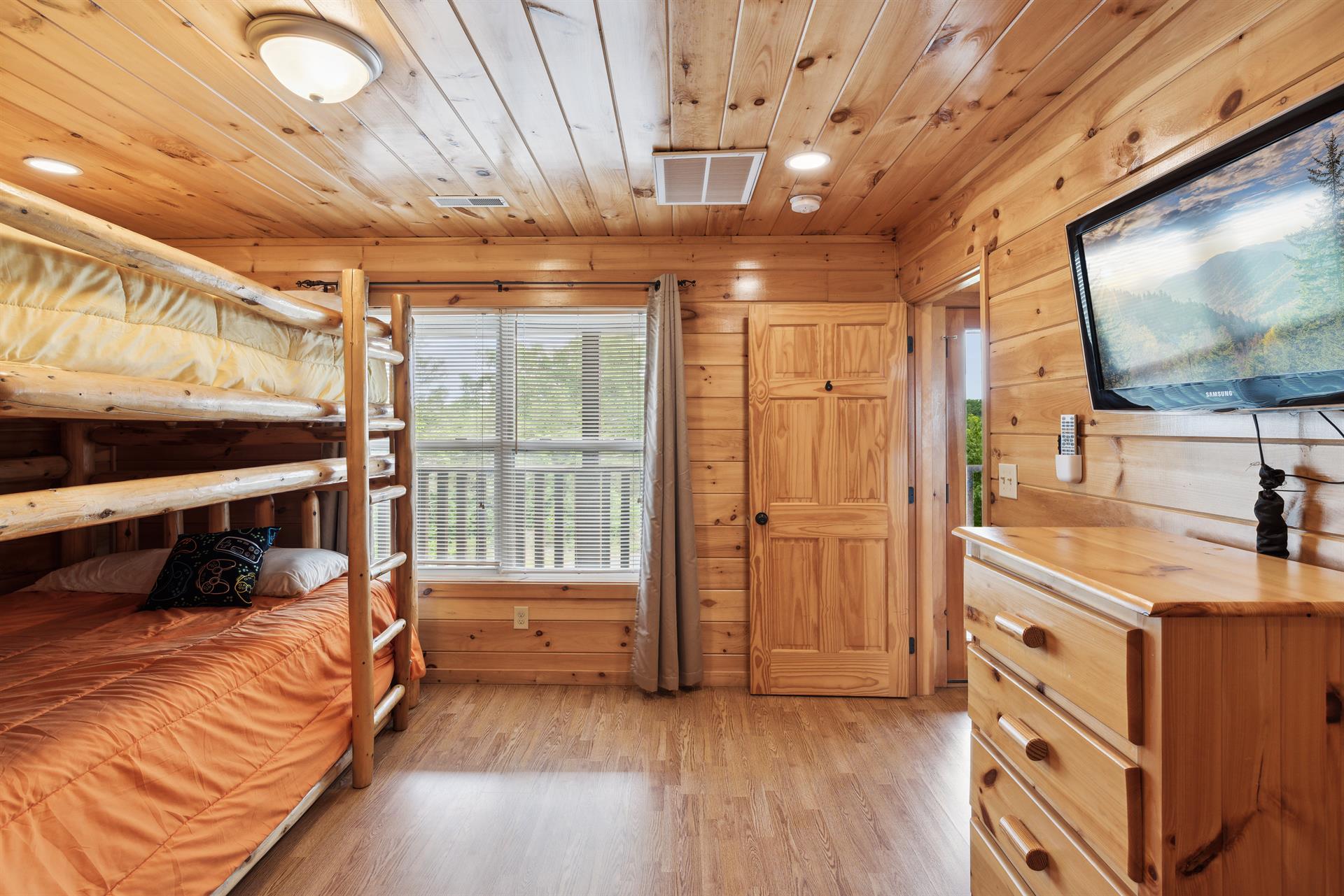 The cabin's three stories each feature two bedrooms with their own private bathroom, a comfortable living area with a sleeper sofa and TV, and a game room for endless entertainment. The main level of the cabin includes a fully equipped kitchen and dining area, perfect for preparing and sharing delicious meals with loved ones. The second level has a pool table, poker table, living area with large TV. The 3 floor is all about gaming! Brightly colored with 2 gaming chairs and TV's, the kids will never be bored. There are 2 queen over queen bunk beds in the game area, one king bedroom and one bedroom with queen over queen bunks and private baths. This cabin is professionally decorated with kids in mind! Enjoy the video arcade games and let the adults enjoy the poker table or hot tub.