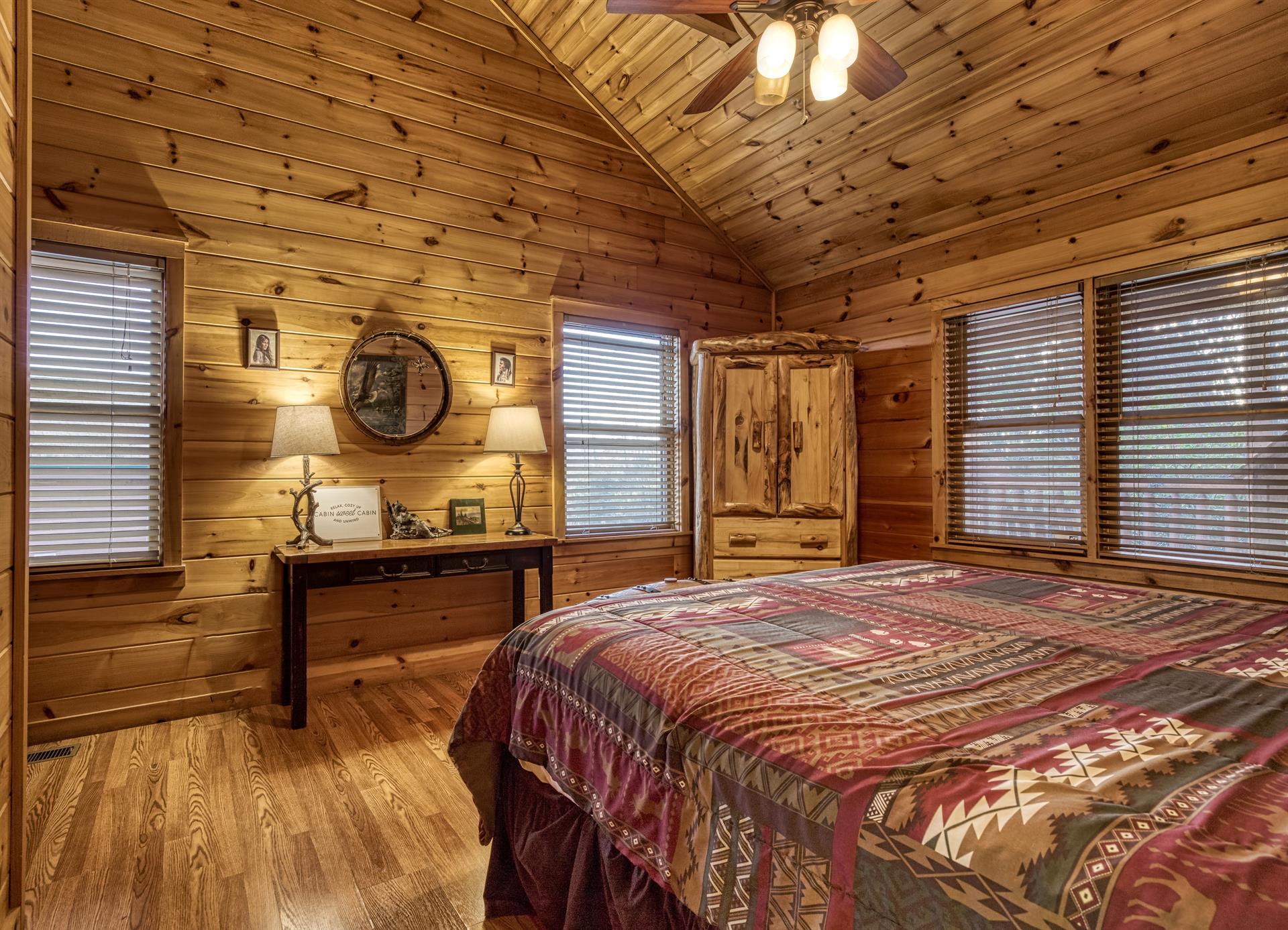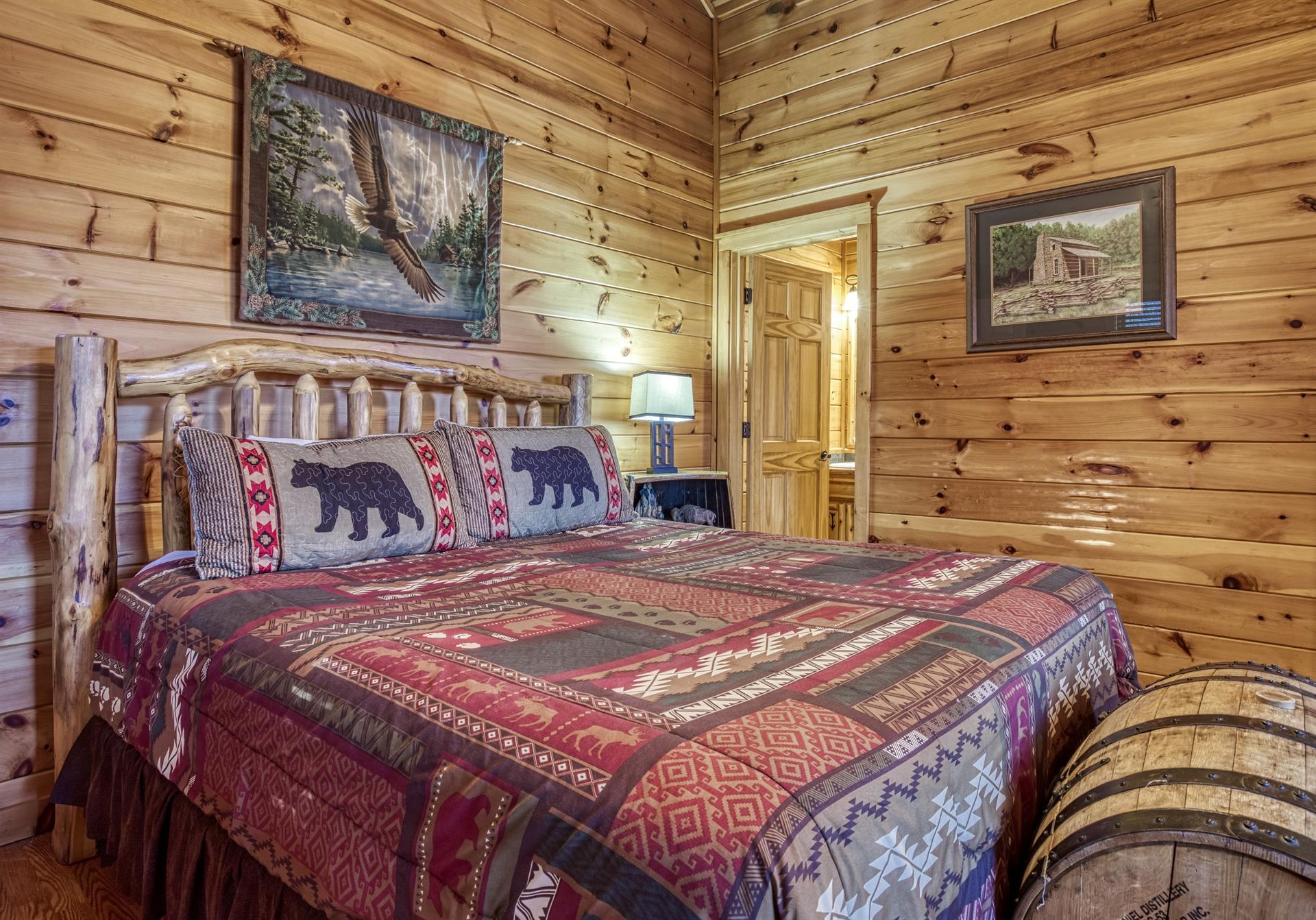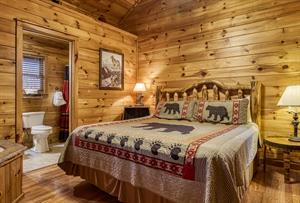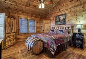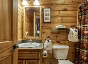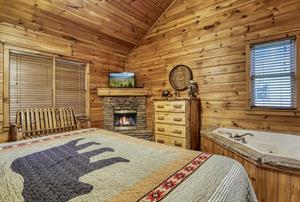When it's time to retire for the night, you'll look forward to resting in one of the cabin's two bedrooms. The primary suite offers a king-sized bed, a gas log fireplace, a television, an in-room jetted tub, and a private full bath, promising a serene evening of relaxation.