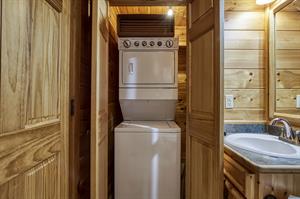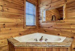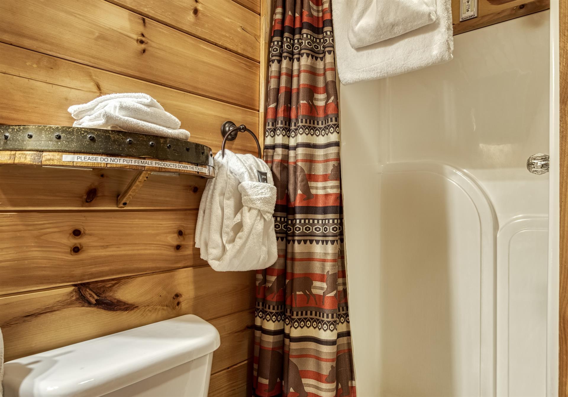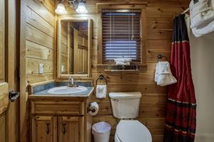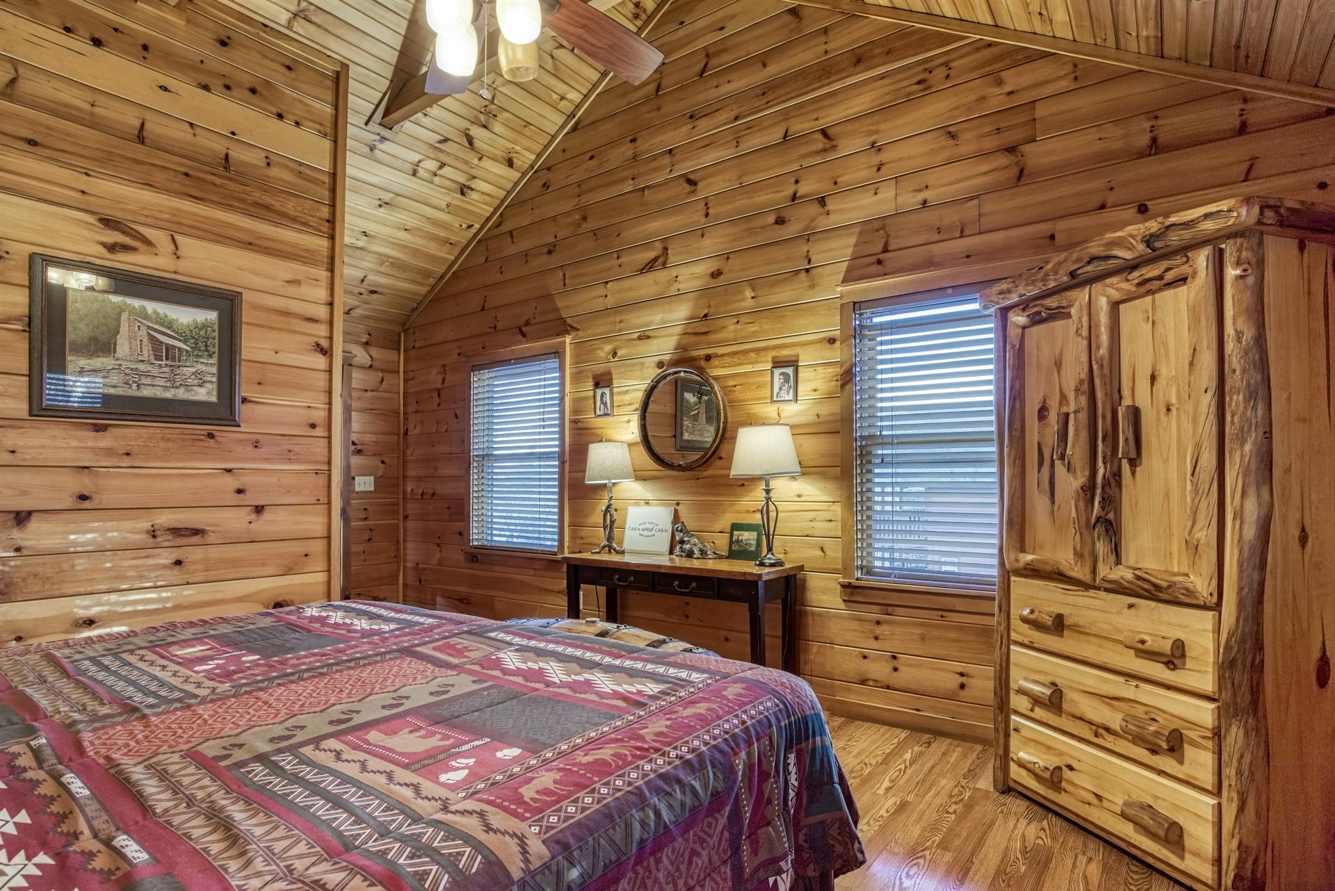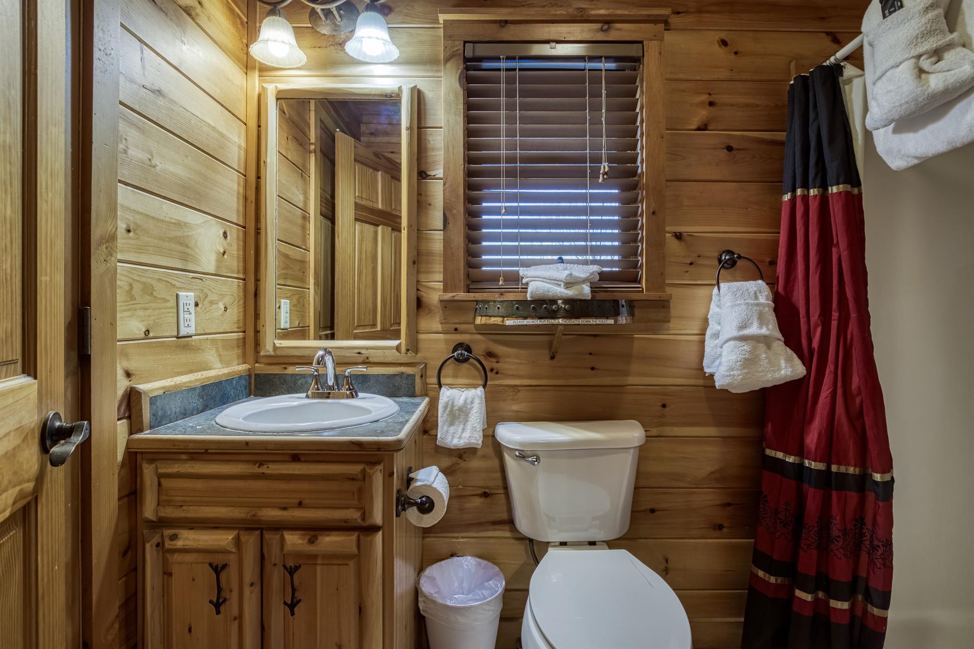 When it's time to retire for the night, you'll look forward to resting in one of the cabin's two bedrooms. The primary suite offers a king-sized bed, a gas log fireplace, a television, an in-room jetted tub, and a private full bath, promising a serene evening of relaxation.