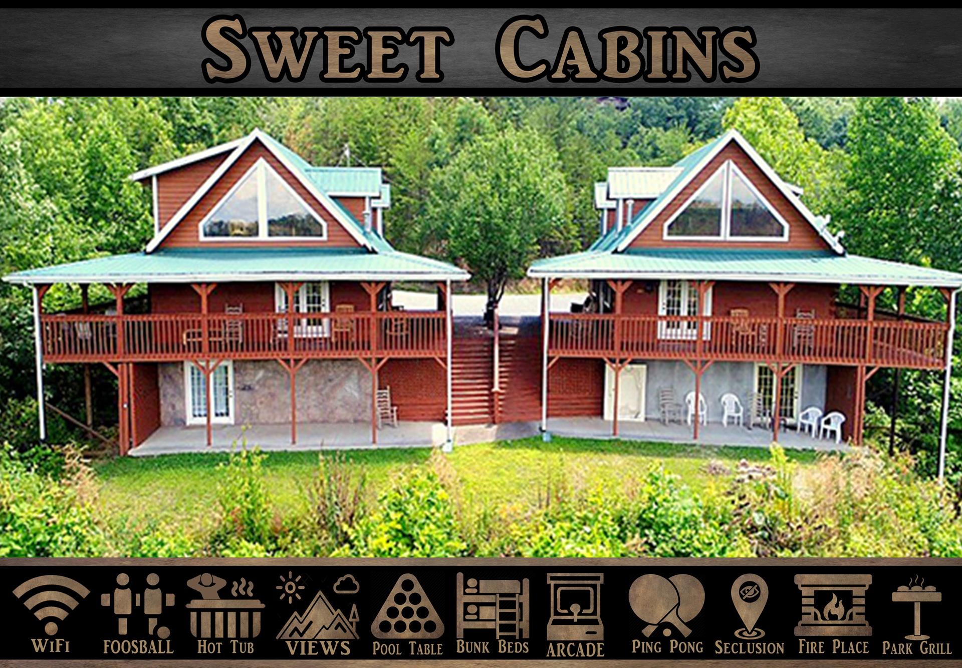 One cabin has four bedrooms and the other has two. Each cabin has a full