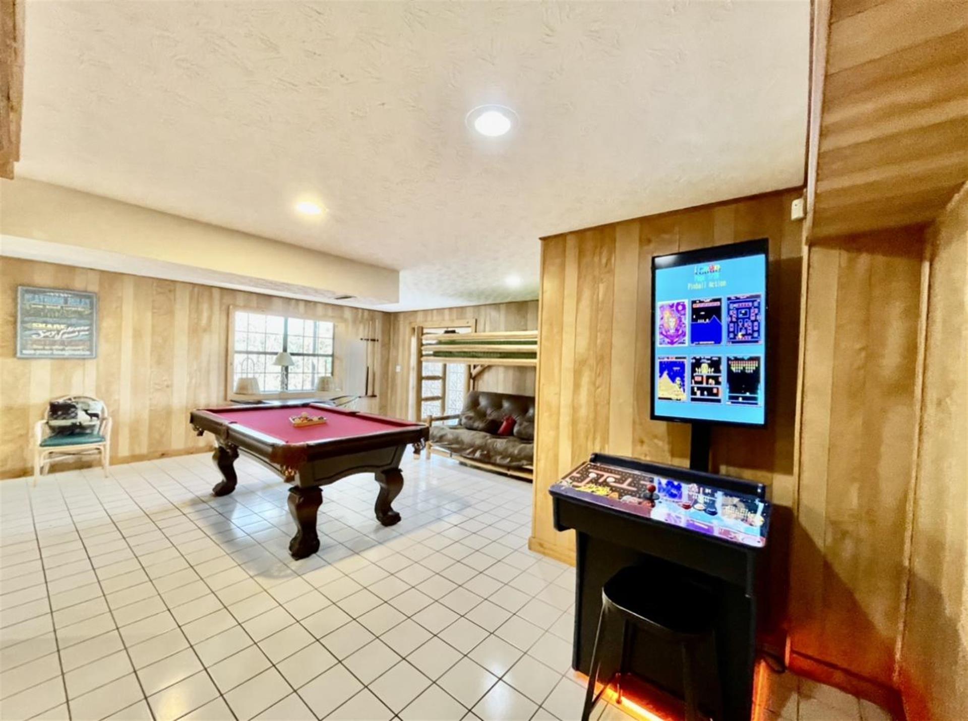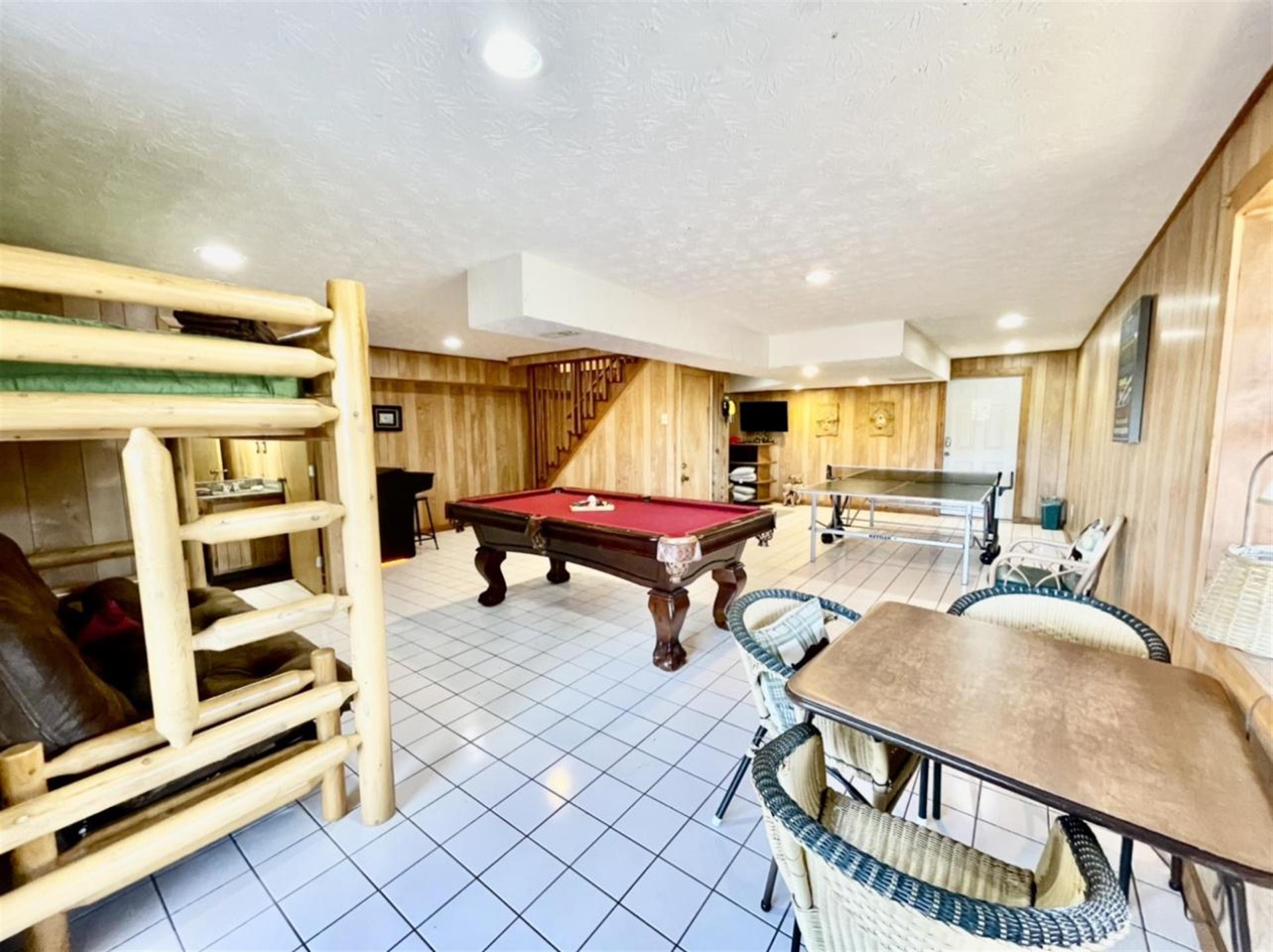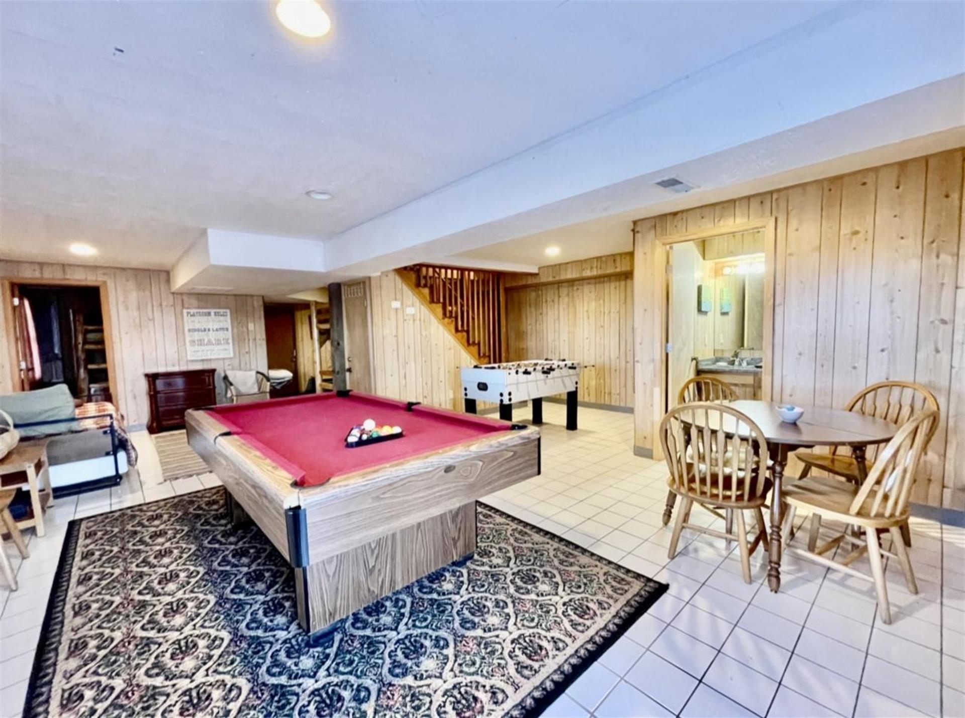 of guests. The basement is the perfect hangout for kids and adults alike.
