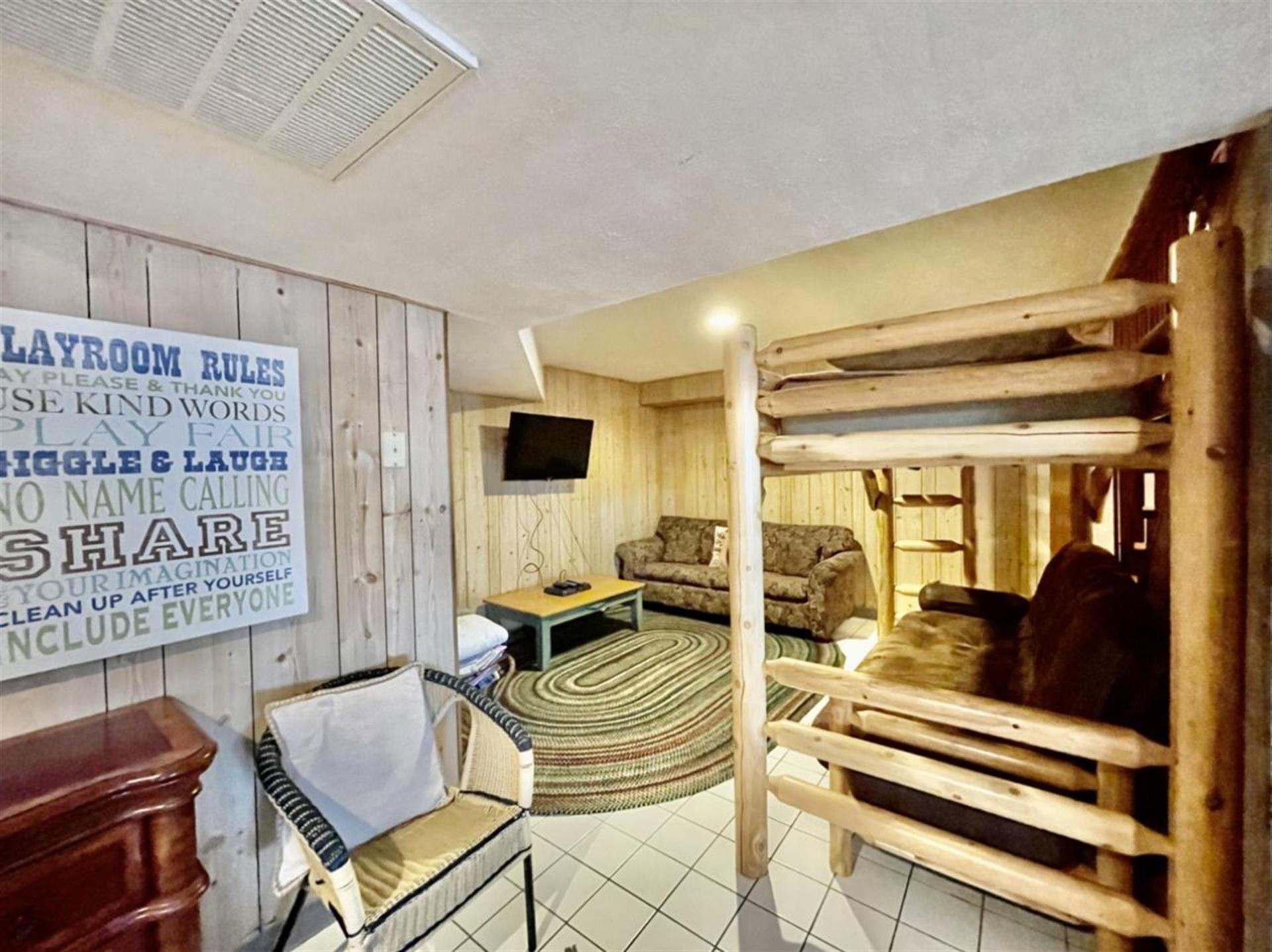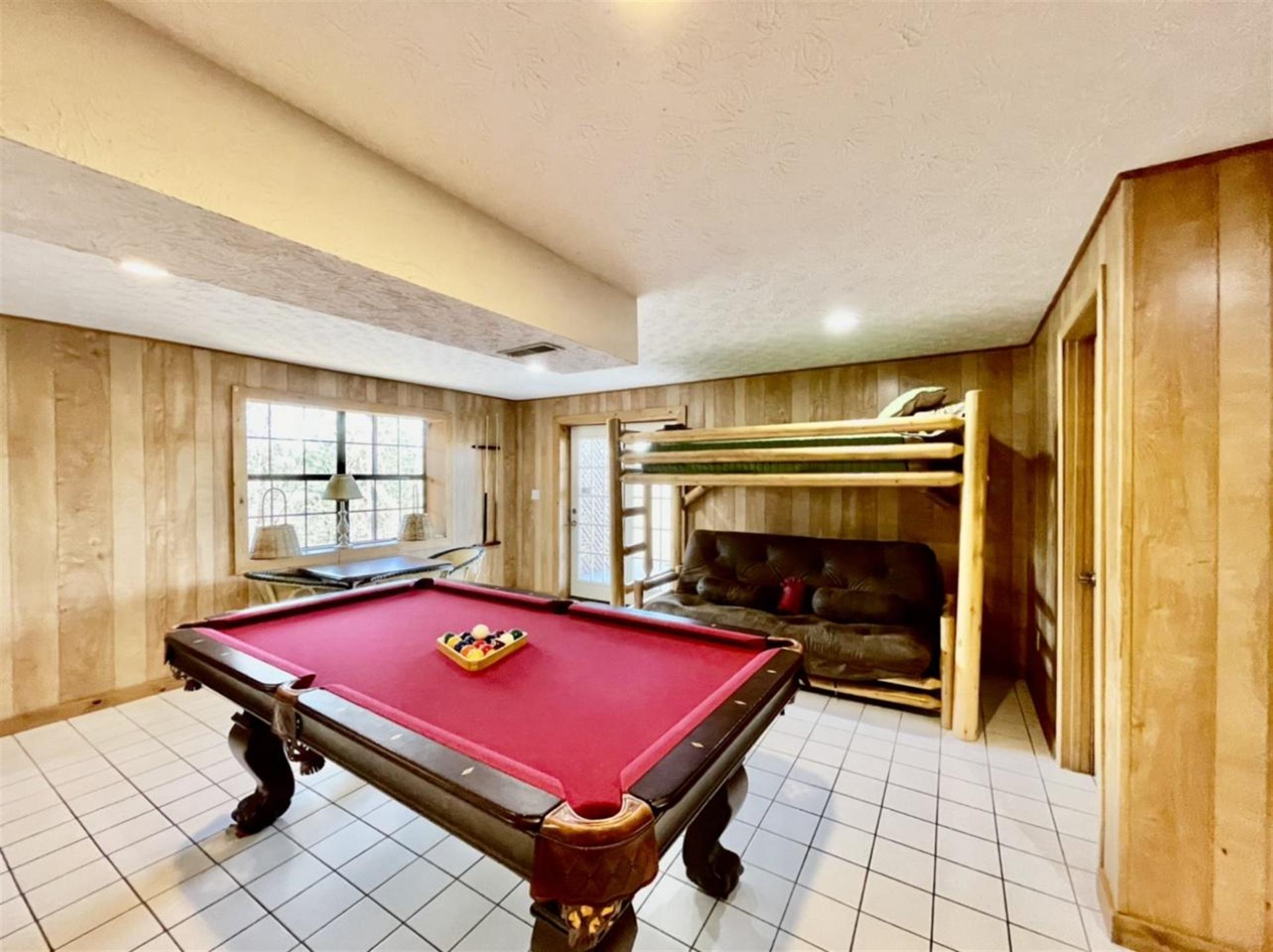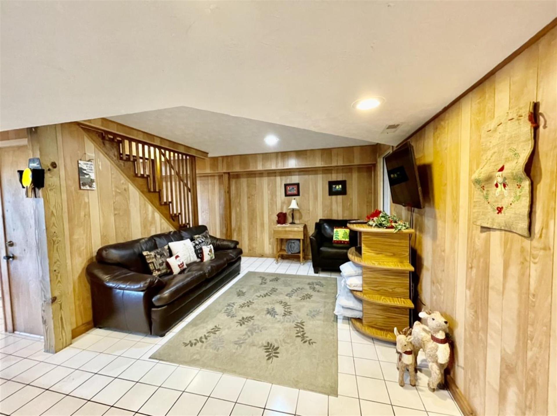 of guests. The basement is the perfect hangout for kids and adults alike.