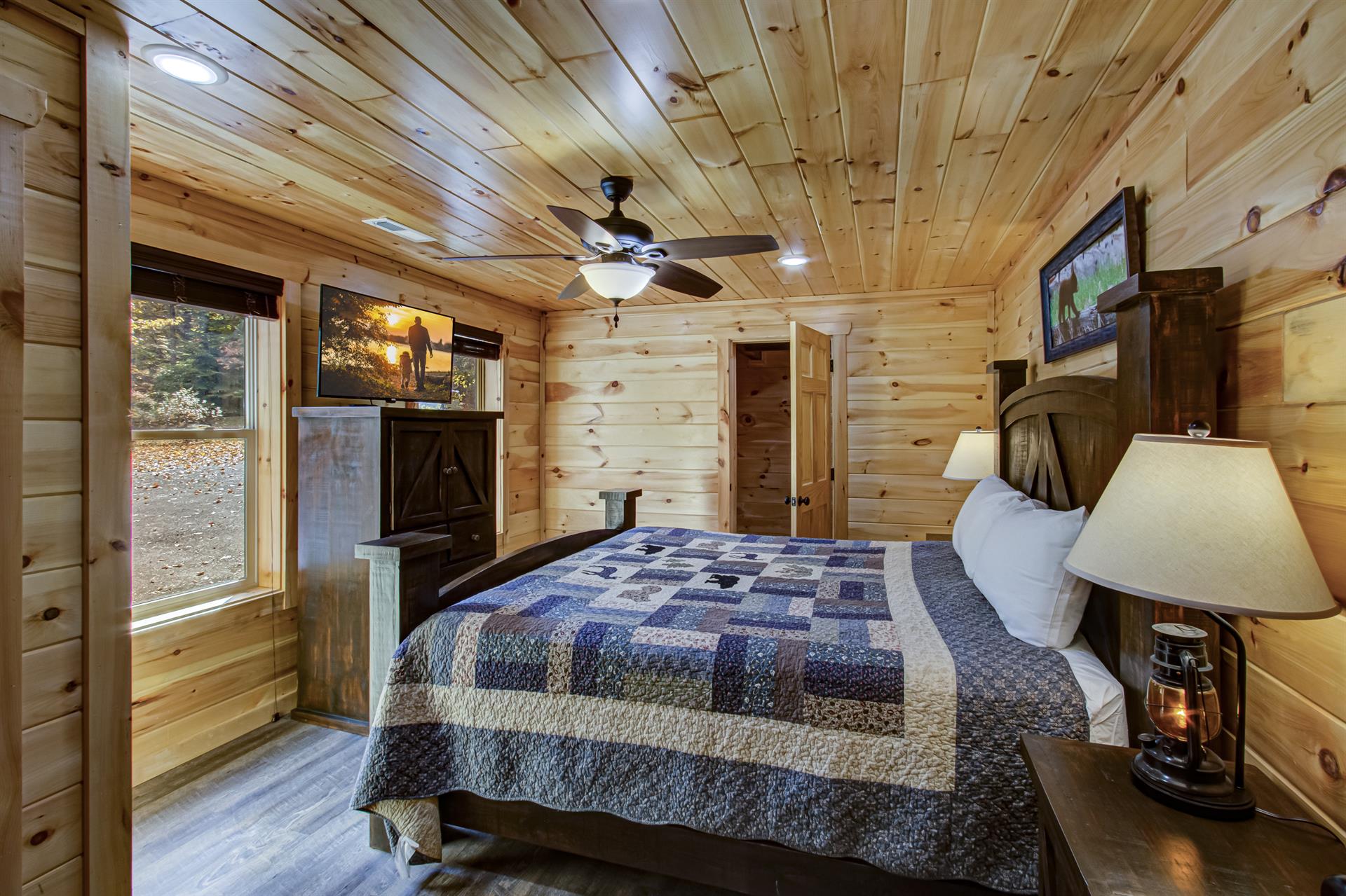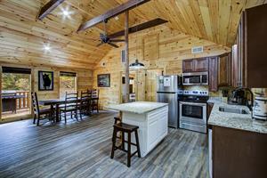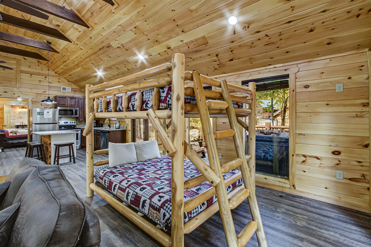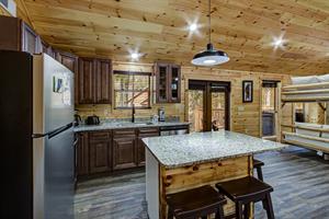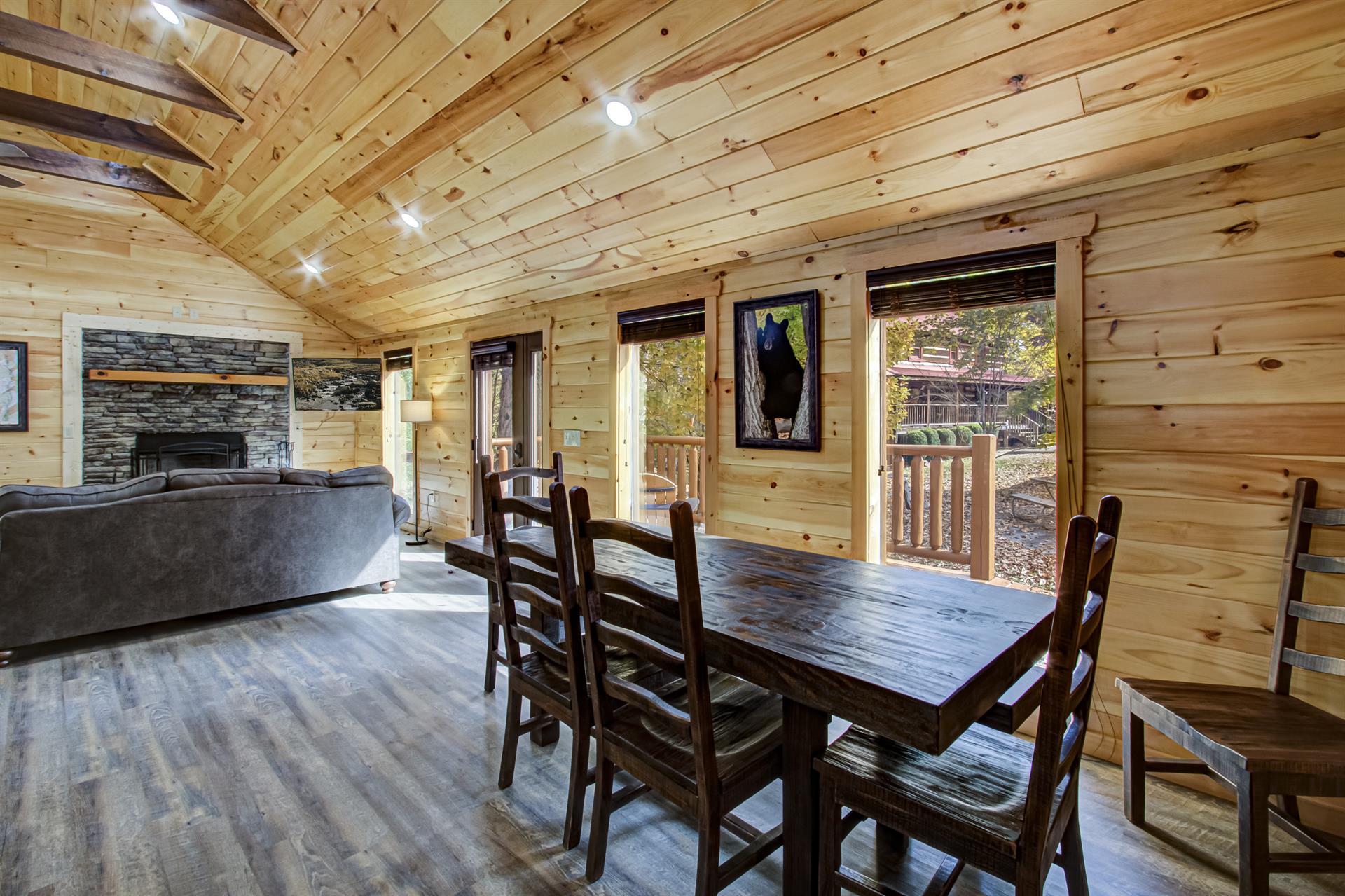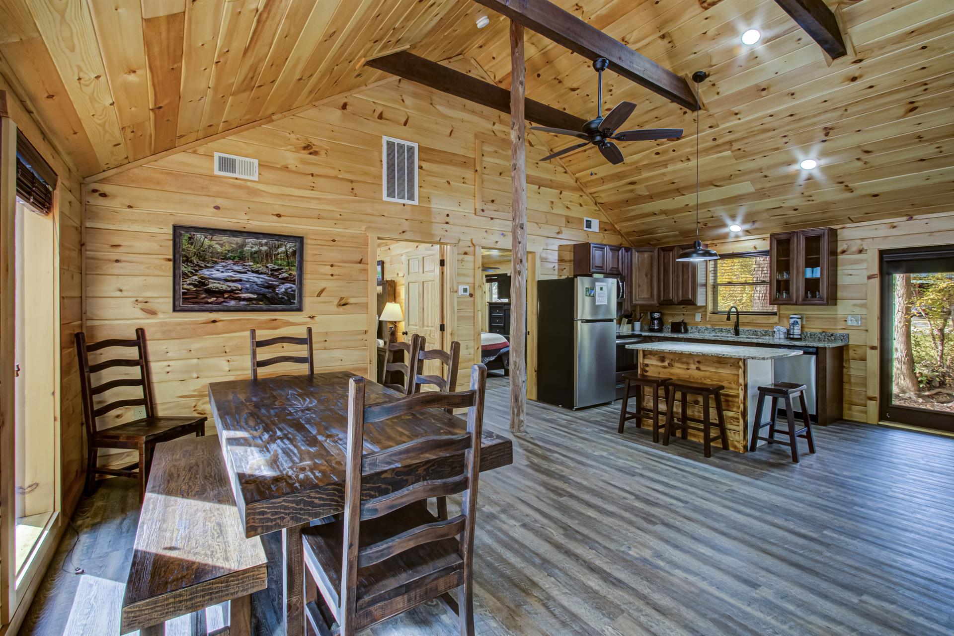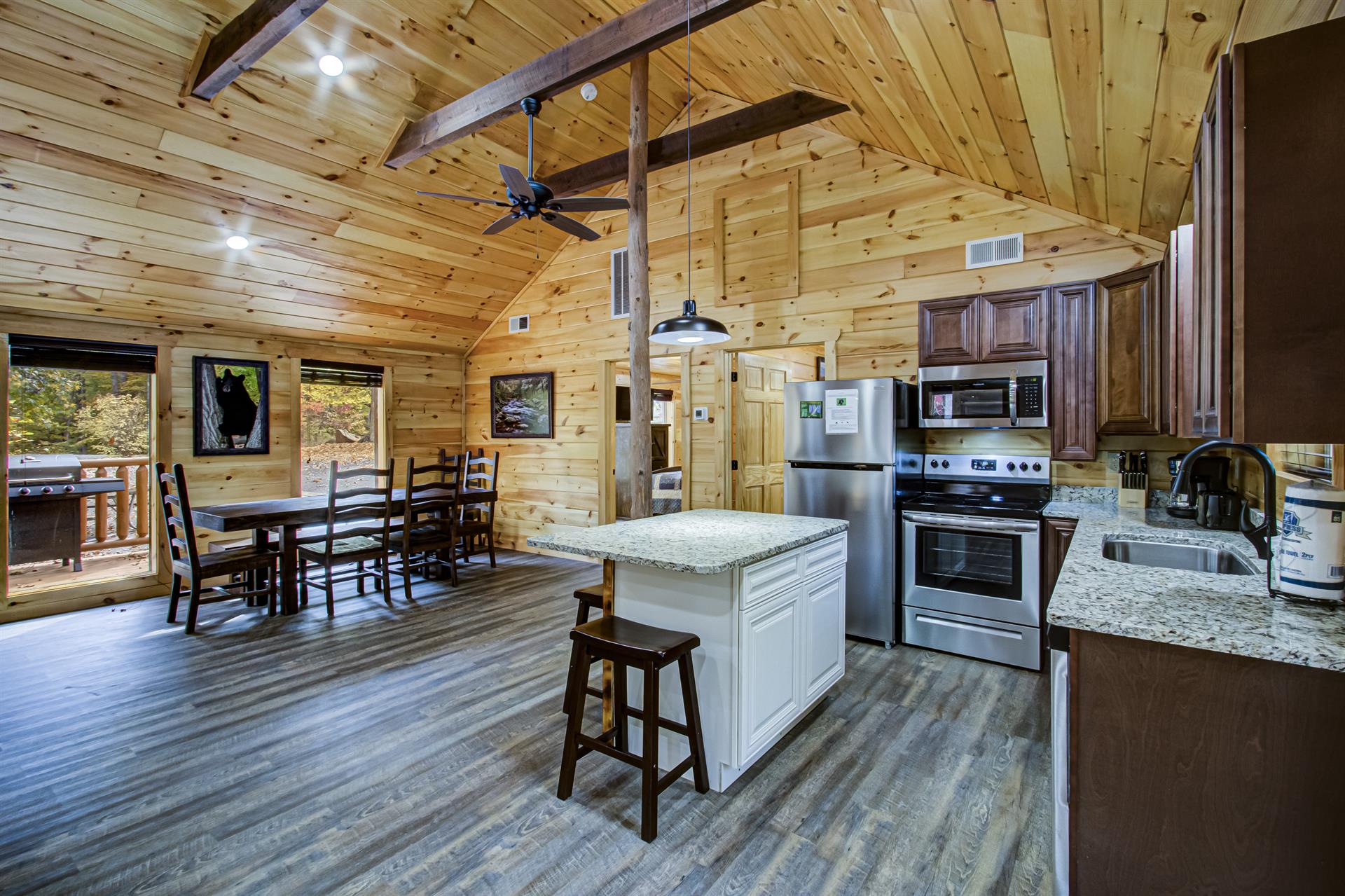 The cabin features a spacious and open concept great room, with a large screen TV, dining area, and fully equipped kitchen with new appliances. The sleeping area and arcade game provide additional entertainment options, making it ideal for families or groups of friends.