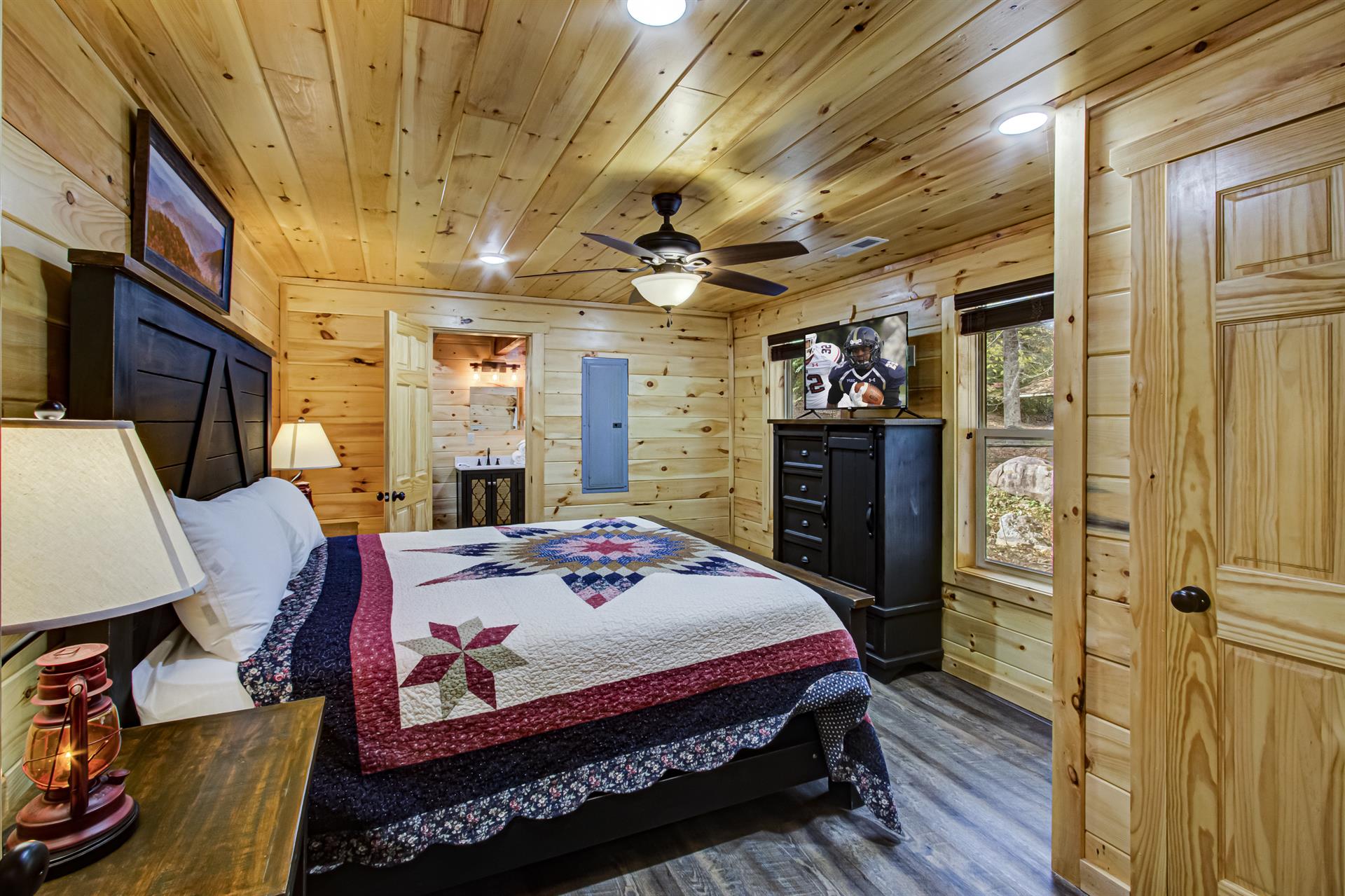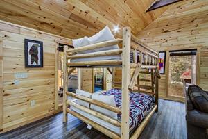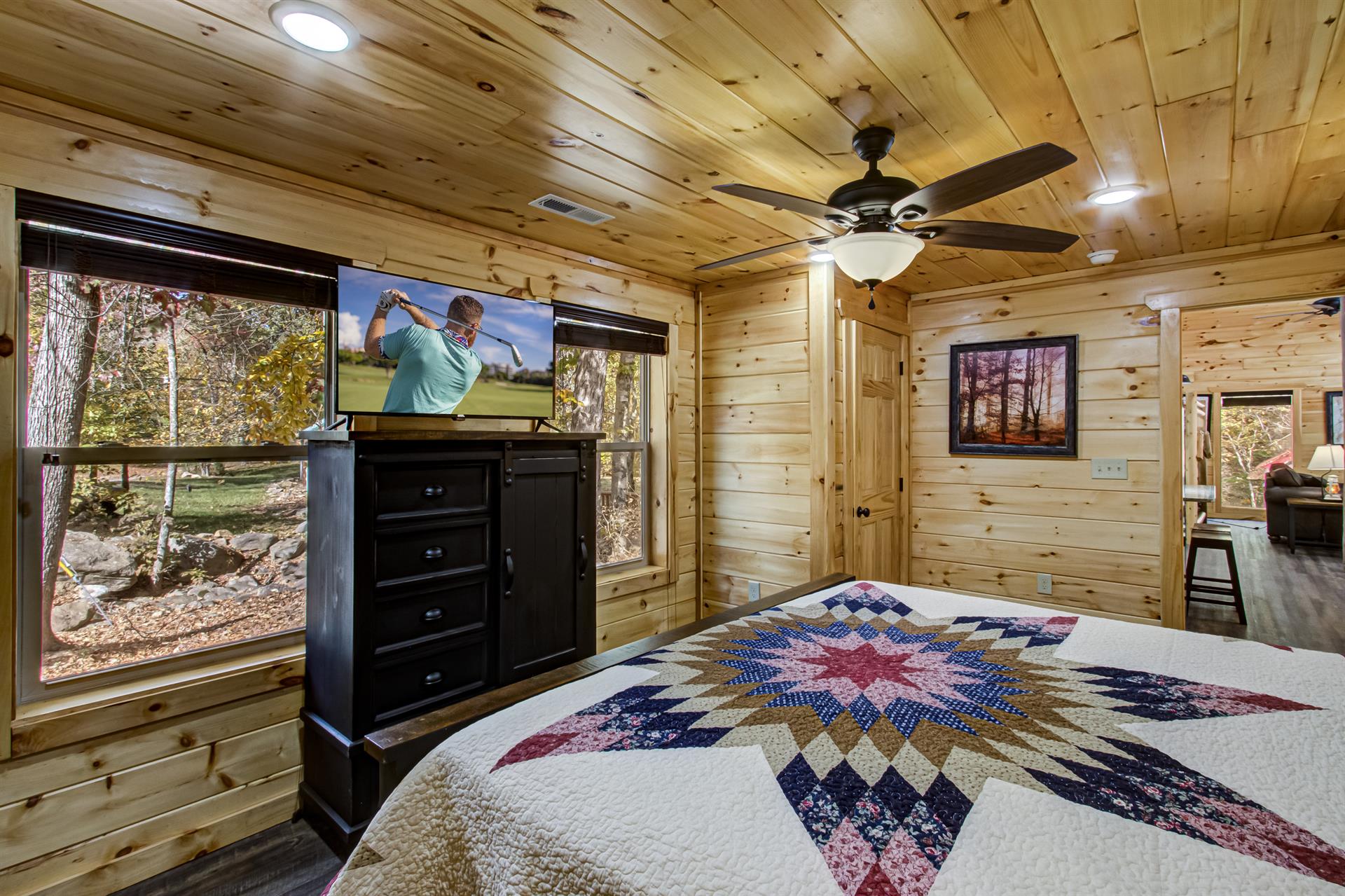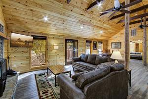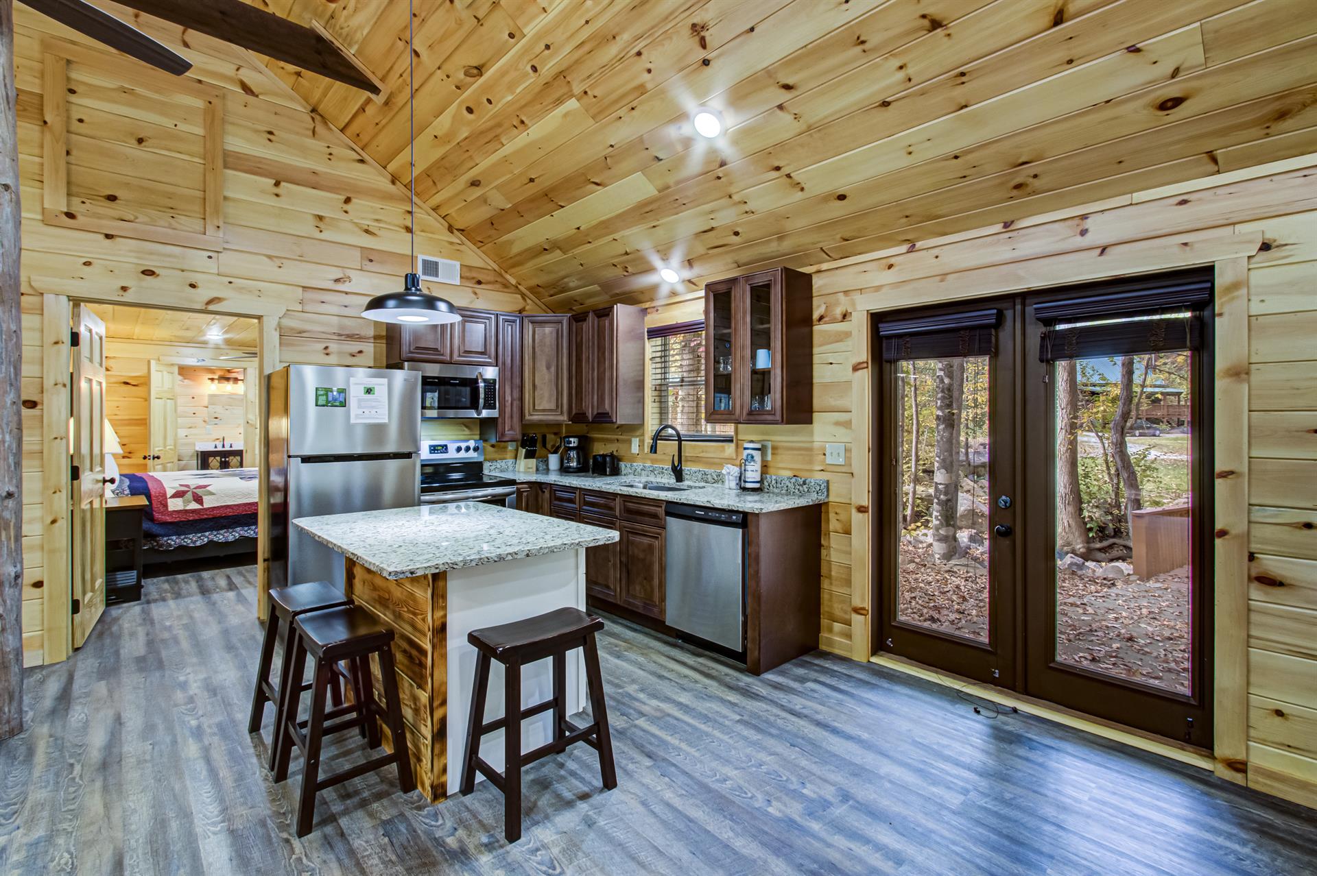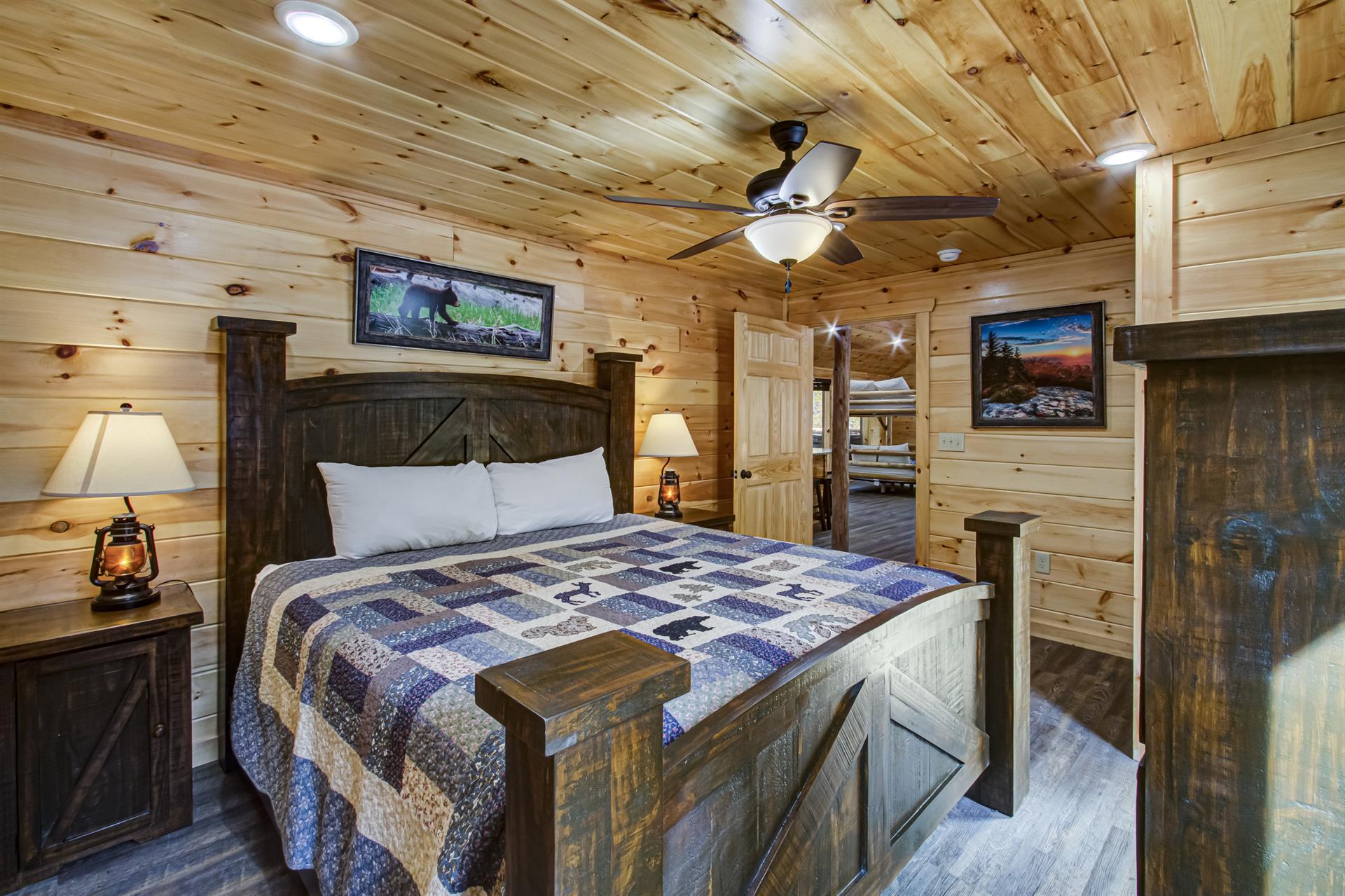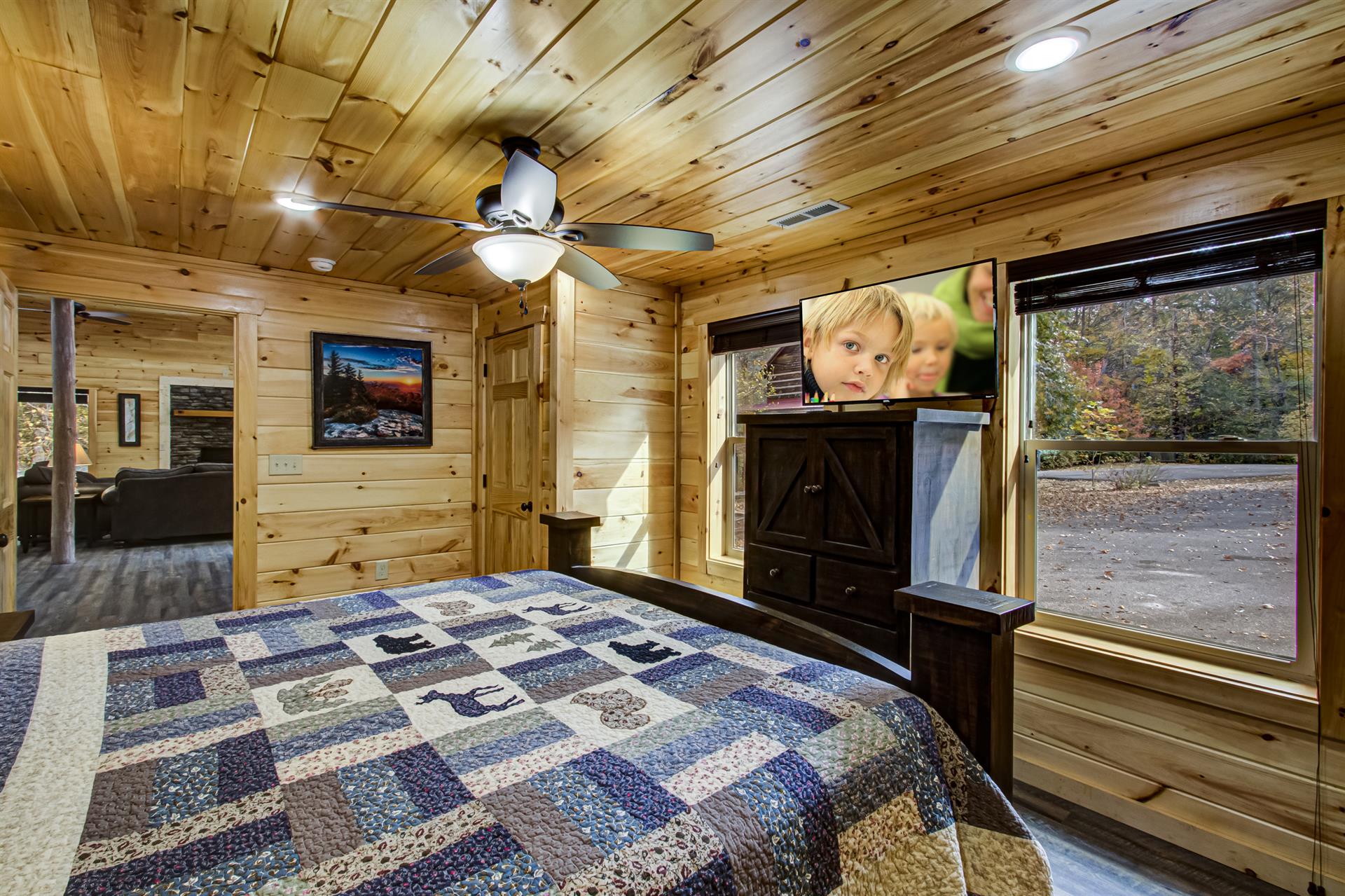 The cabin features a spacious and open concept great room, with a large screen TV, dining area, and fully equipped kitchen with new appliances. The sleeping area and arcade game provide additional entertainment options, making it ideal for families or groups of friends.