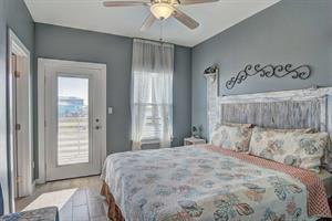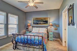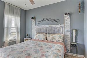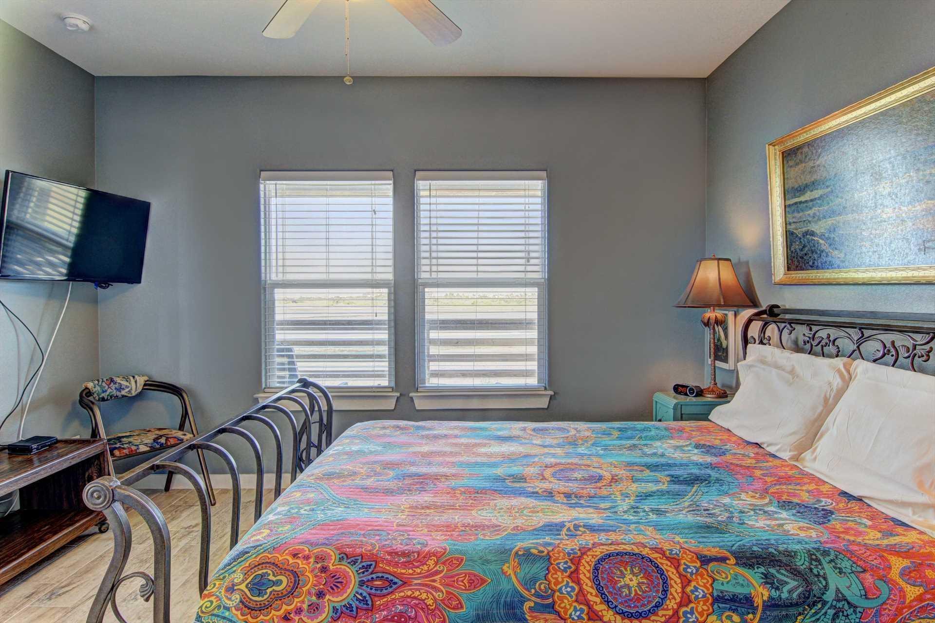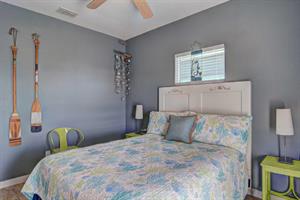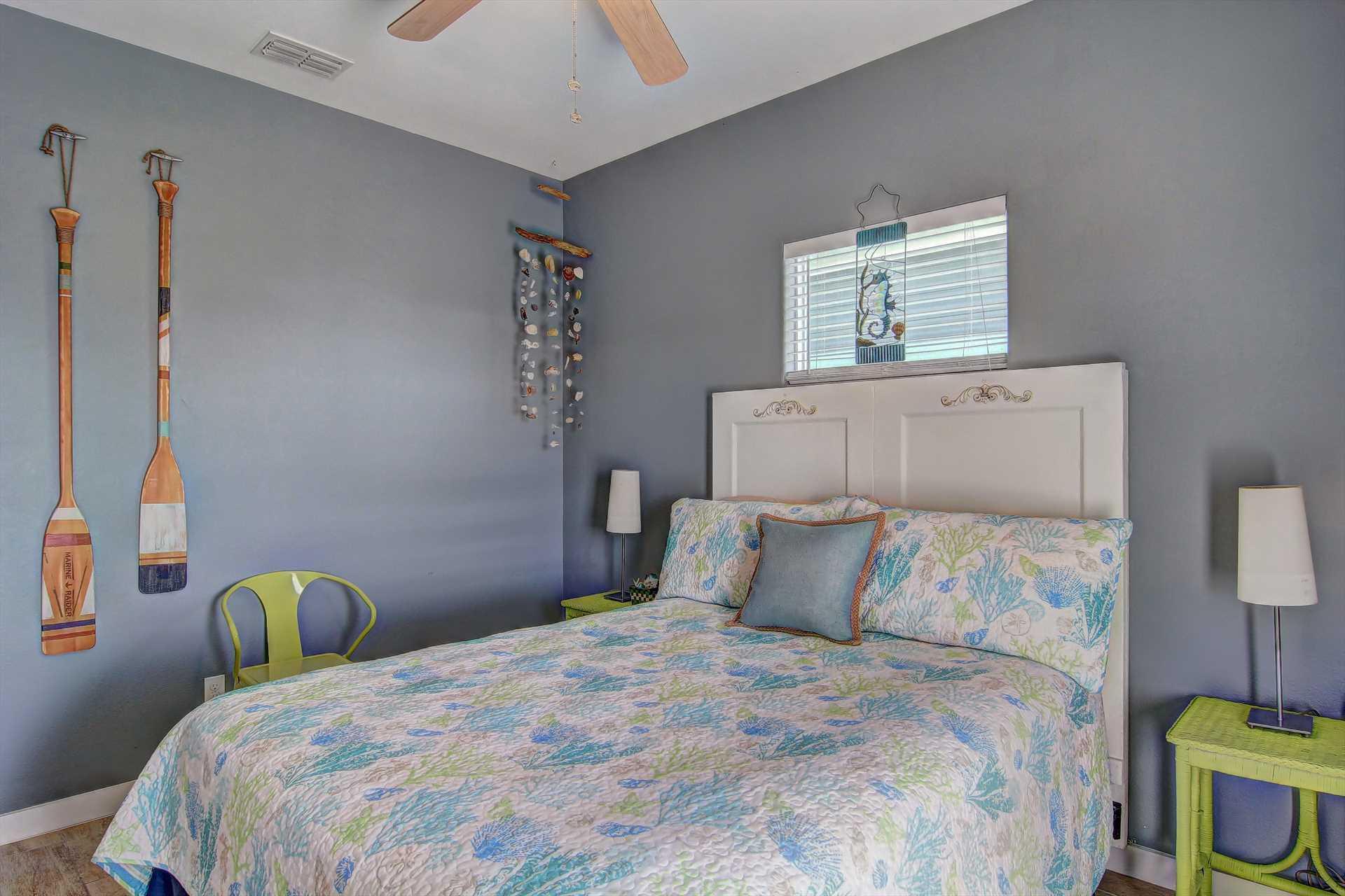 has a queen bed and colorful beachy decor. Both of these rooms have access to
