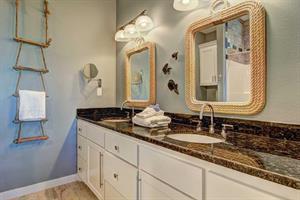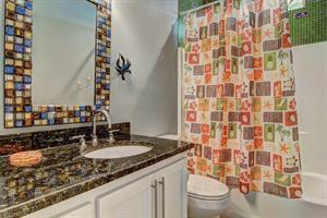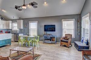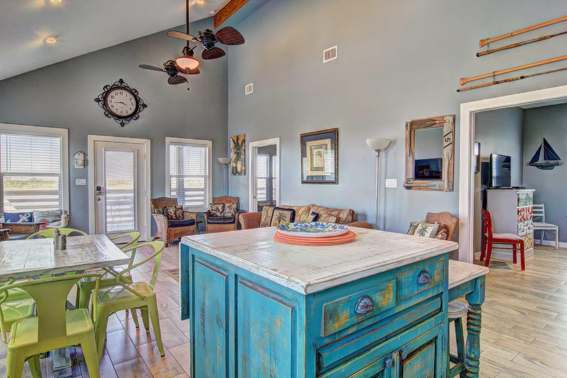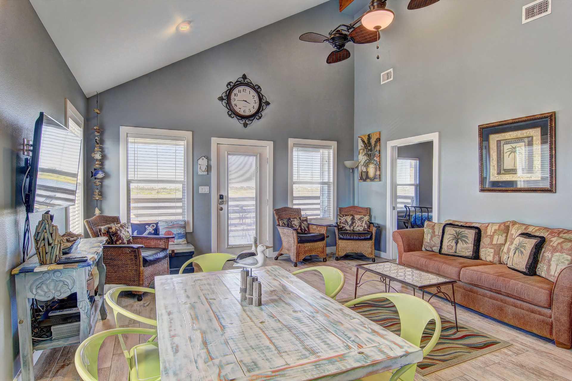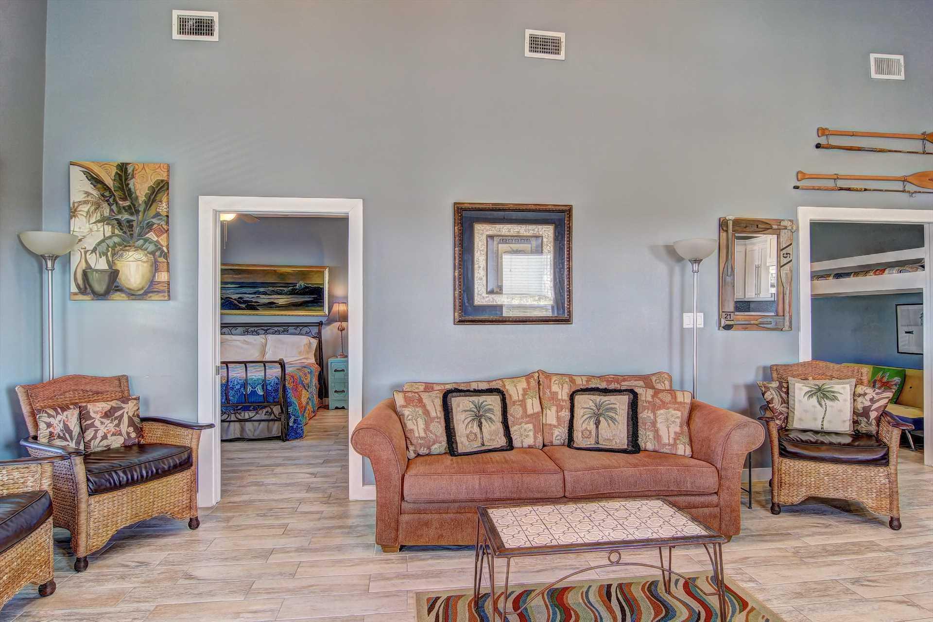 has a queen bed and colorful beachy decor. Both of these rooms have access to